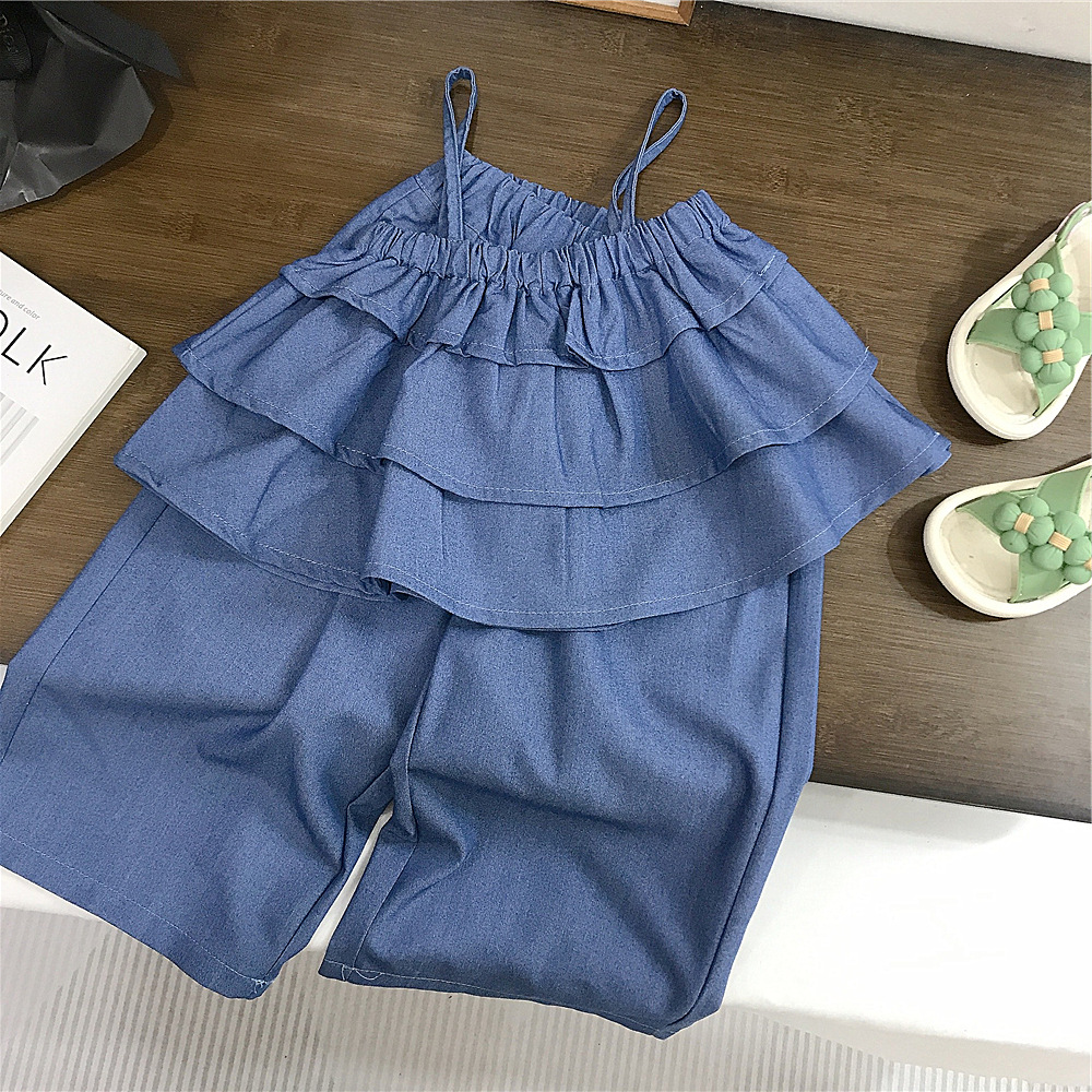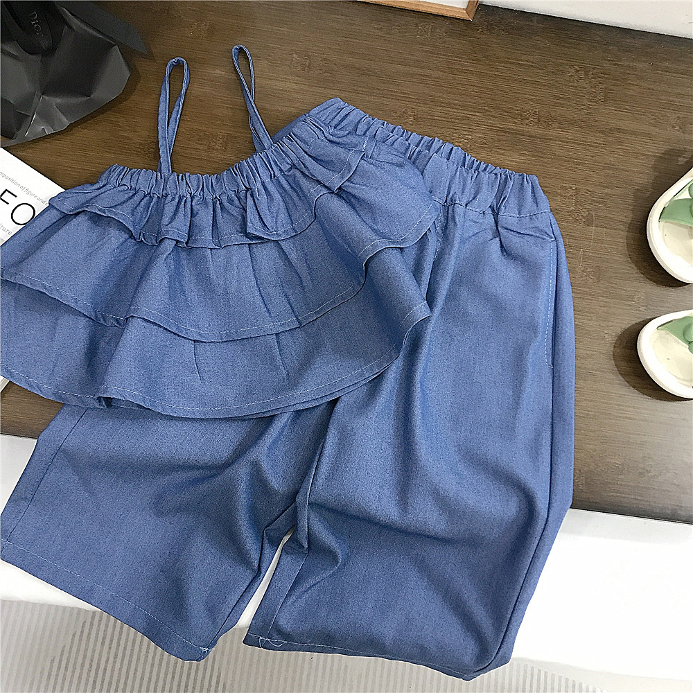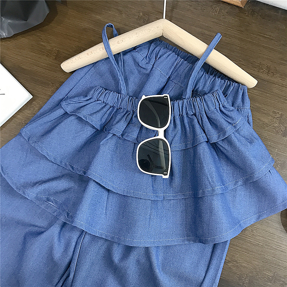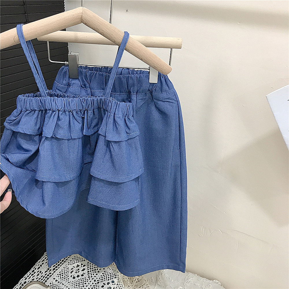 한국 아동복 어린이 데님 세트 여름 새로운 소녀 유행 서스펜더 탑 와이드 다리 바지 투피스 대외 무역