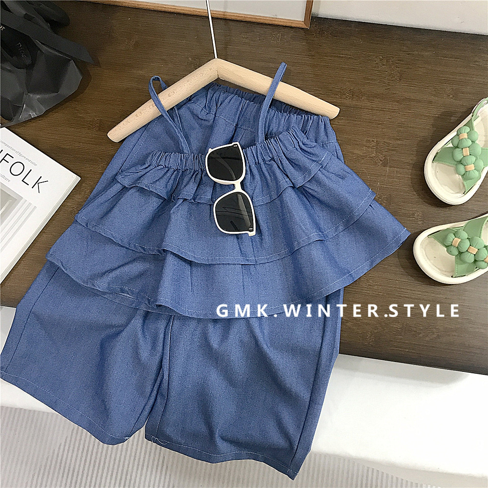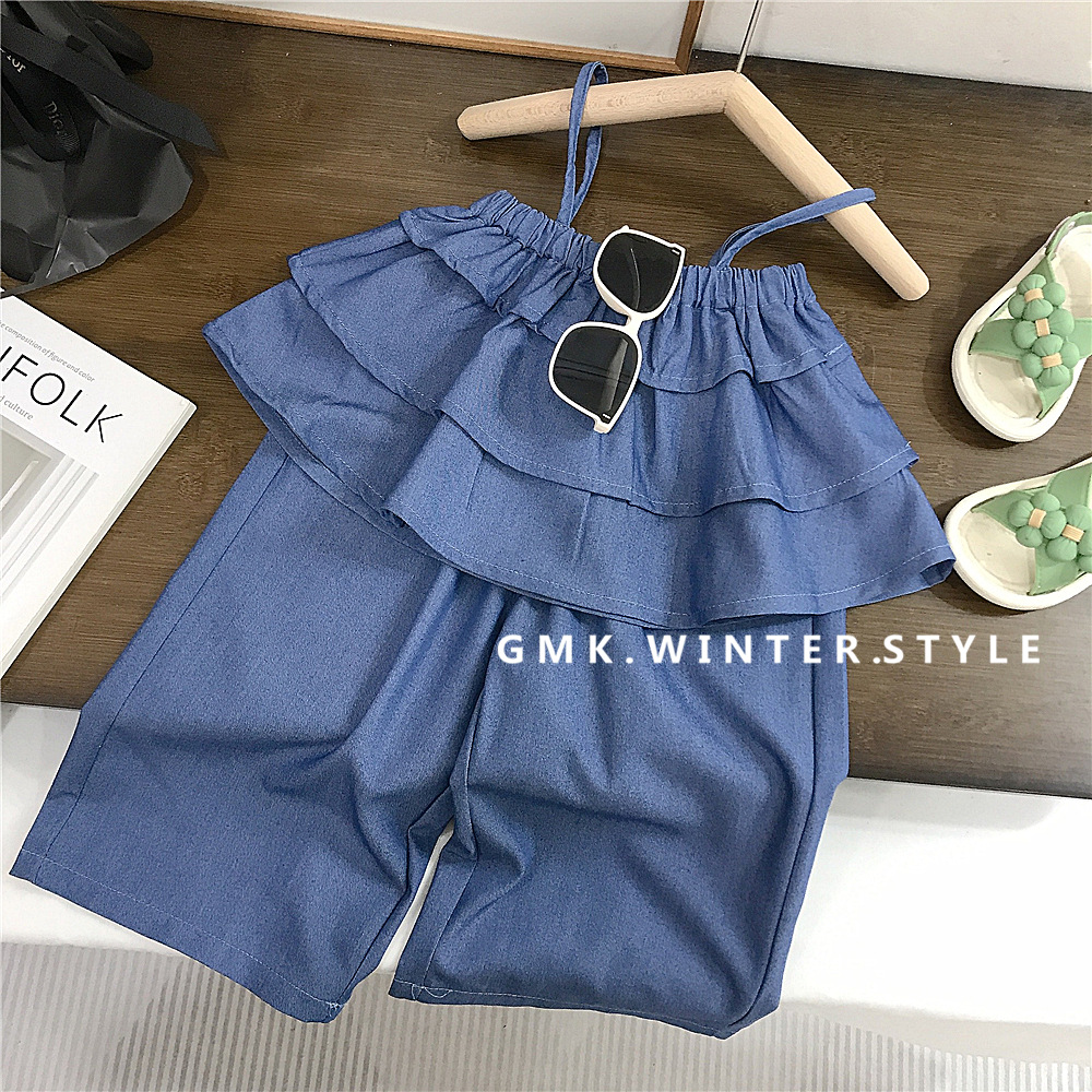 한국 아동복 어린이 데님 세트 여름 새로운 소녀 유행 서스펜더 탑 와이드 다리 바지 투피스 대외 무역스토어 가기