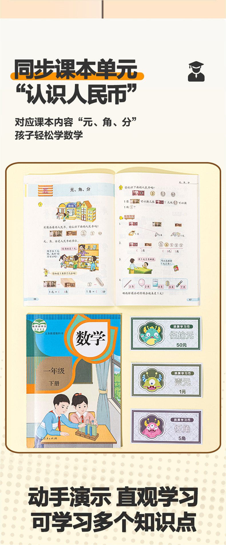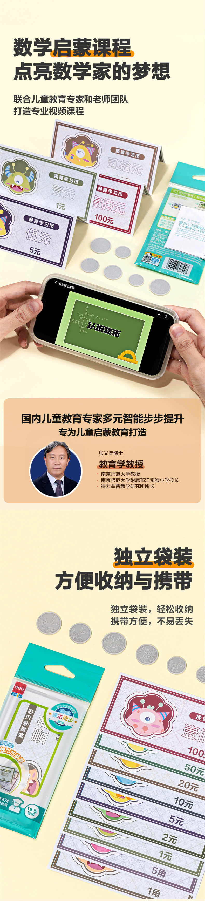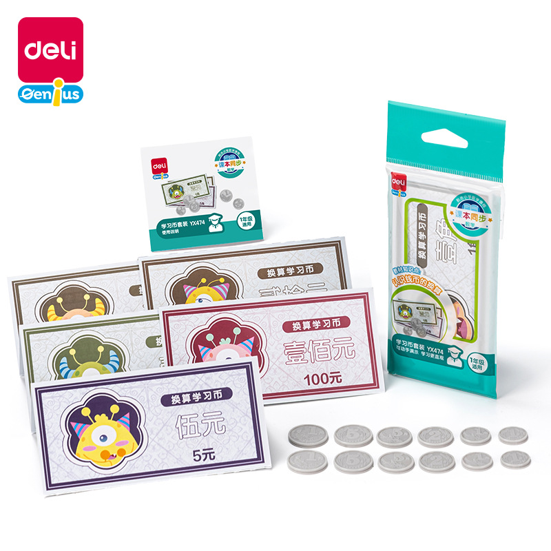 Deli YX474 학습 동전 세트 초등학교 수학 학습 도구 지원 코인 인식 전환 신청 종이 돈 교육스토어 가기
