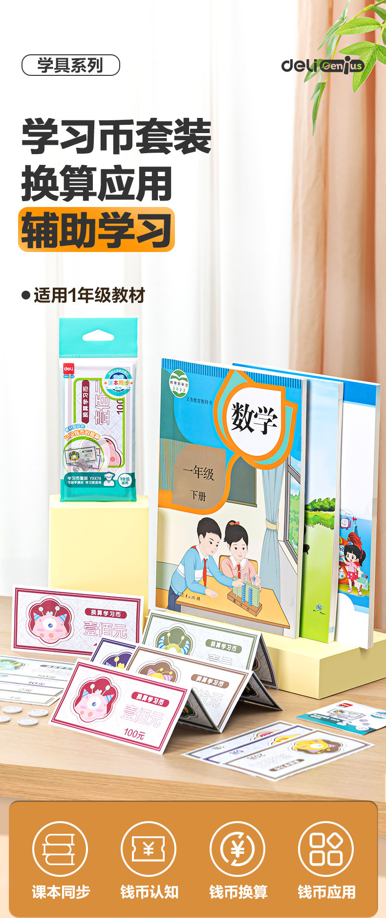 Deli YX474 학습 동전 세트 초등학교 수학 학습 도구 지원 코인 인식 전환 신청 종이 돈 교육