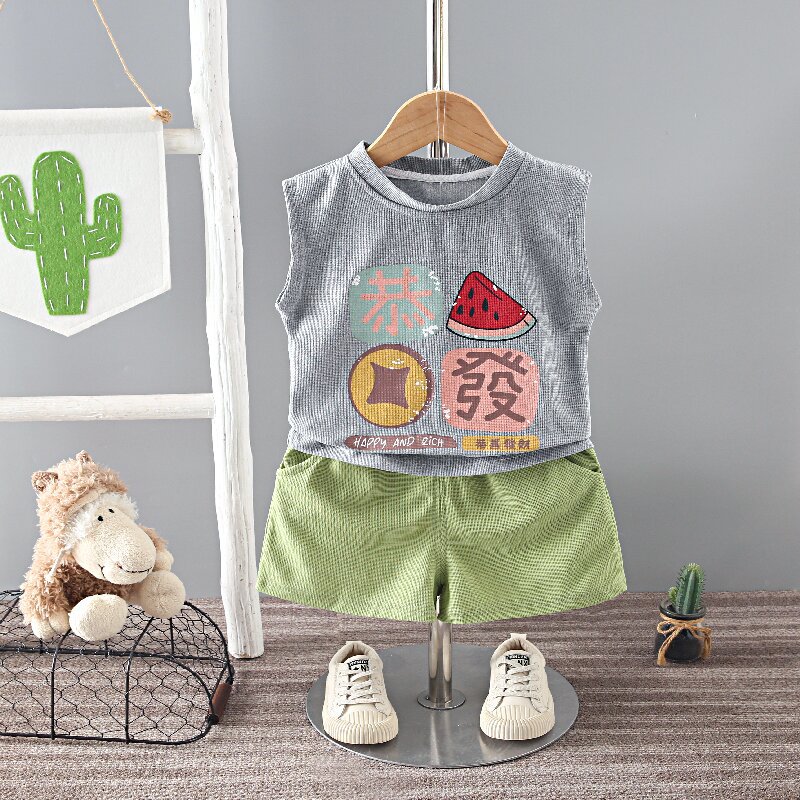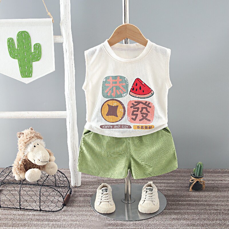 2024 년 여름 새 소년 만화 승무원 목 민소매 조끼 세트 아기 소년을위한 투피스 캐주얼 반바지스토어 가기