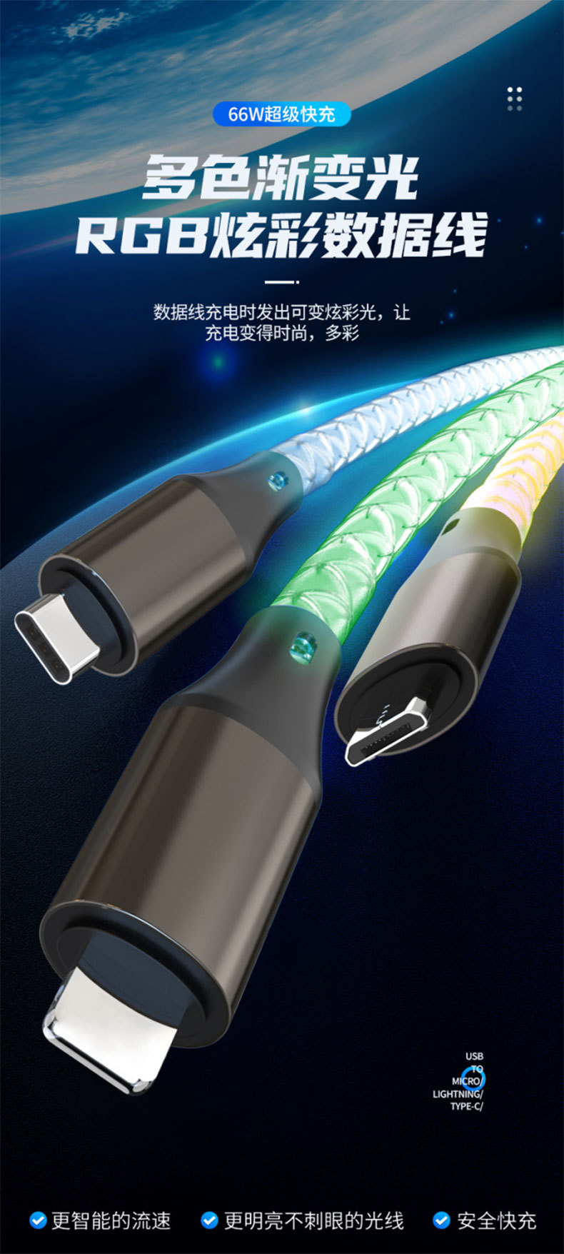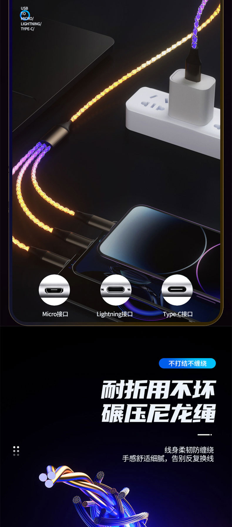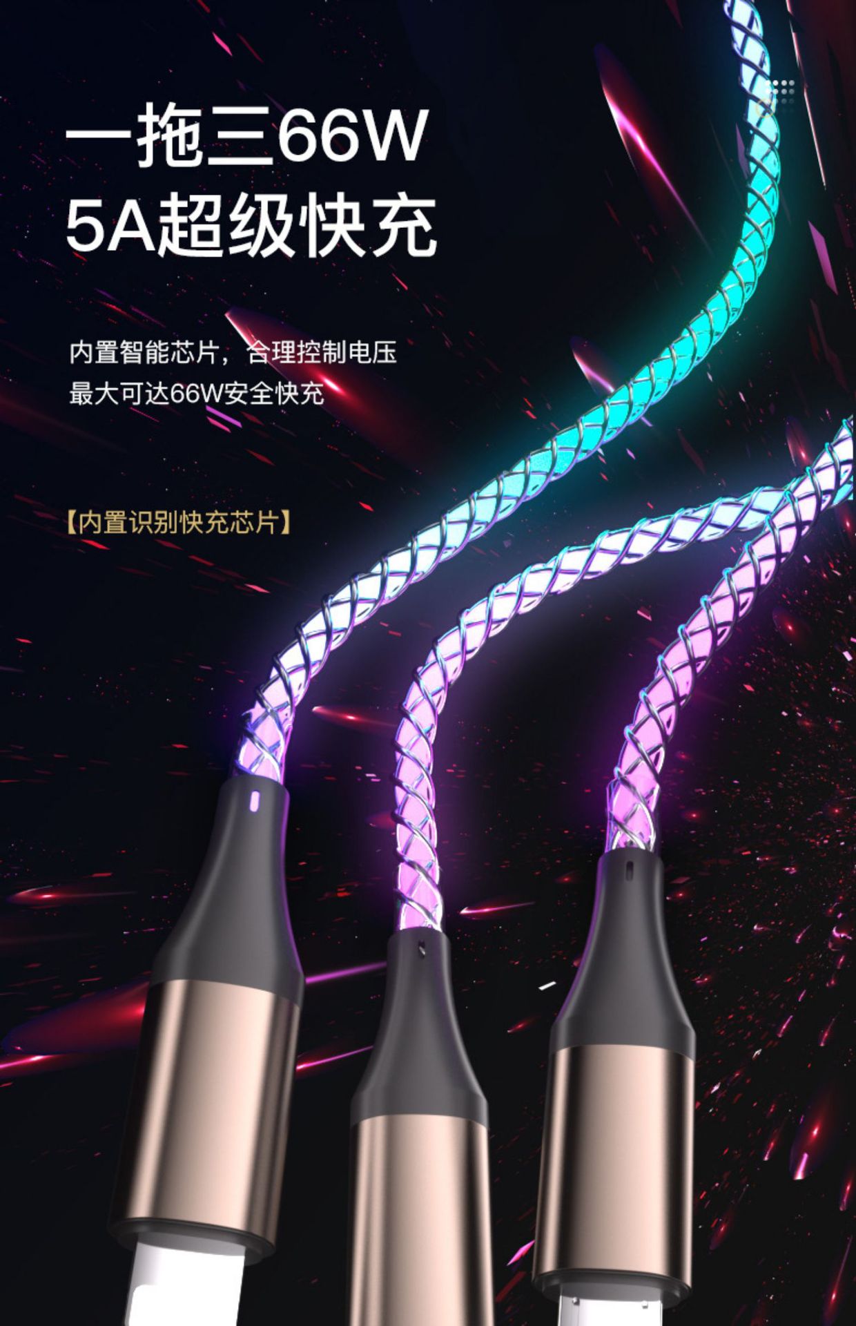 새로운 RGB 그라디언트 1 대 3 데이터 라인 발광 스트리머 자동차 범용 고속 충전 와이어 3 대 1 대기 조명
