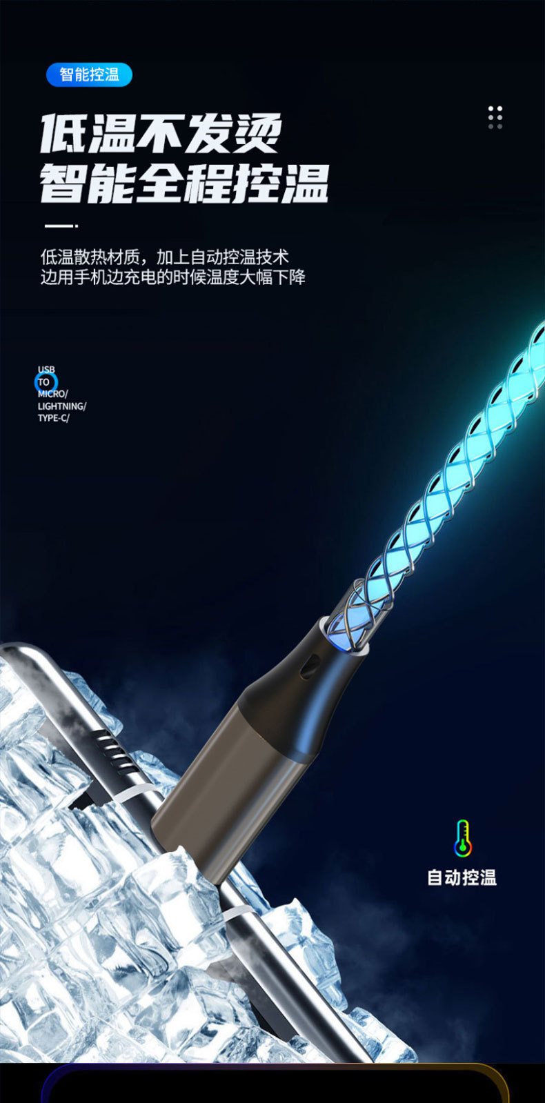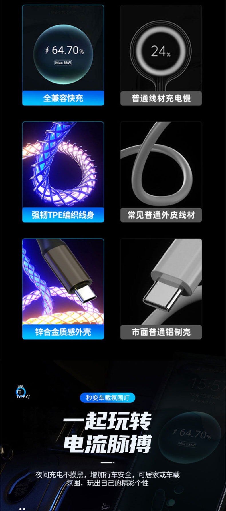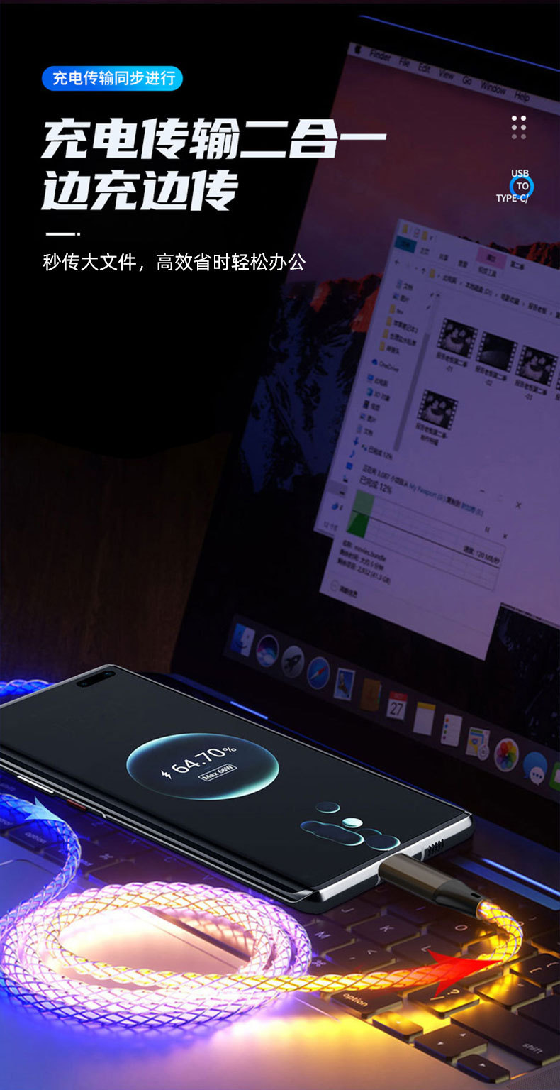 새로운 RGB 그라디언트 1 대 3 데이터 라인 발광 스트리머 자동차 범용 고속 충전 와이어 3 대 1 대기 조명
