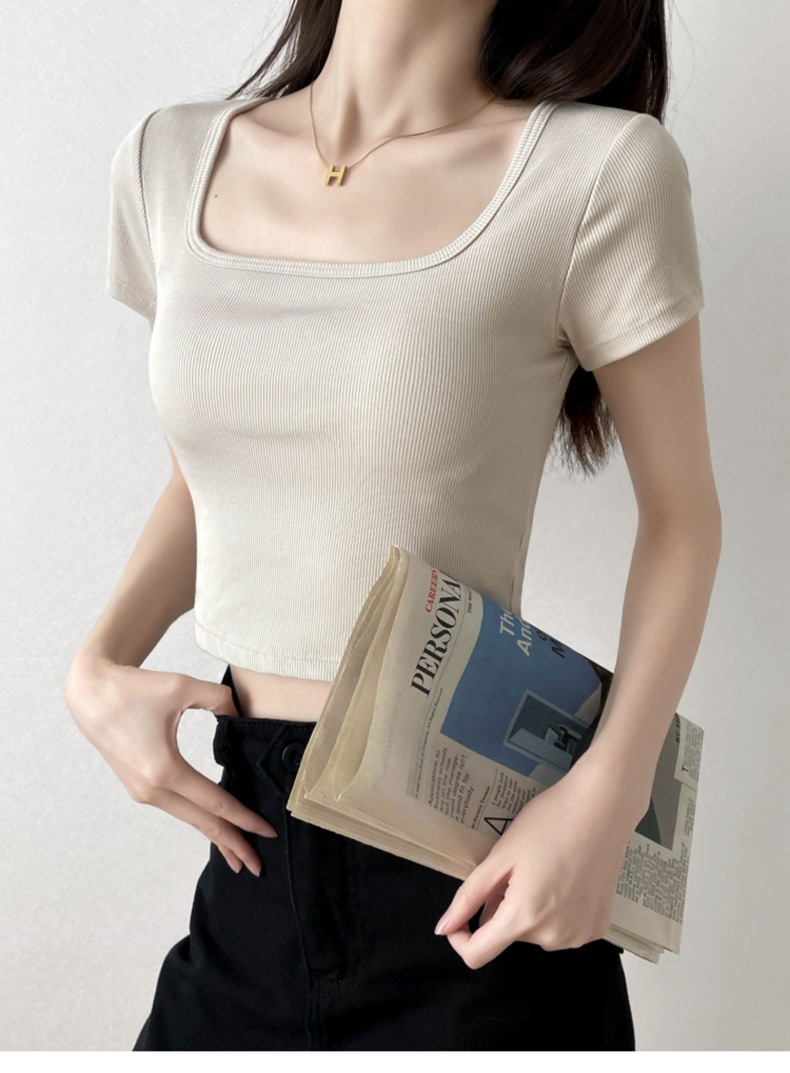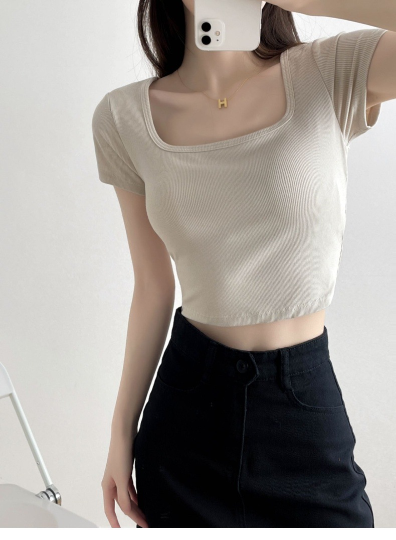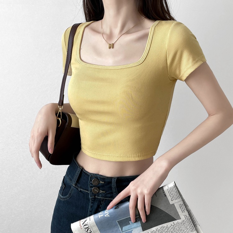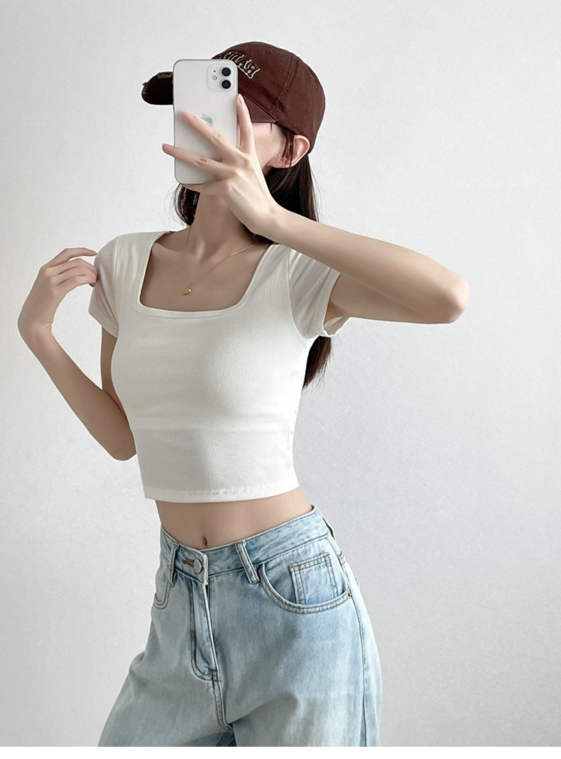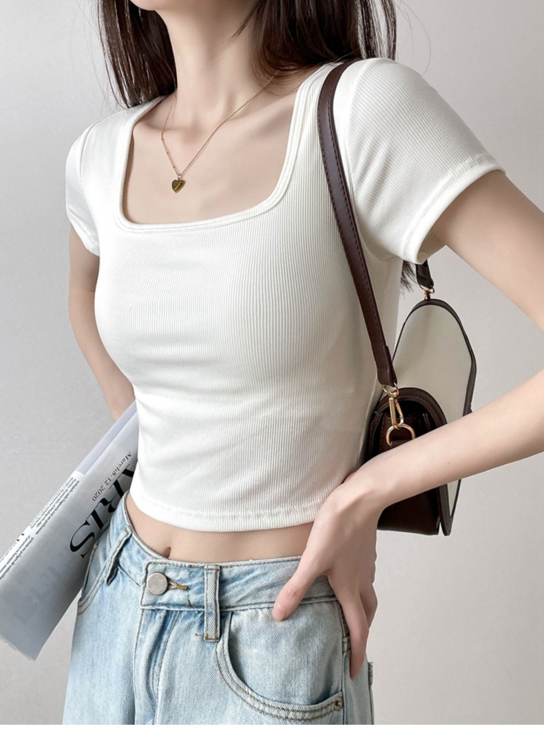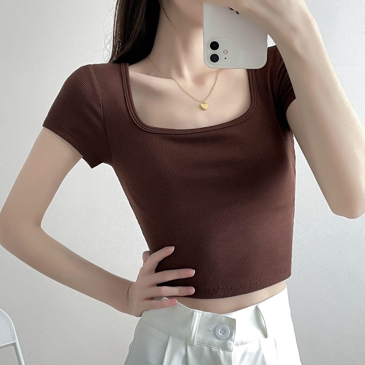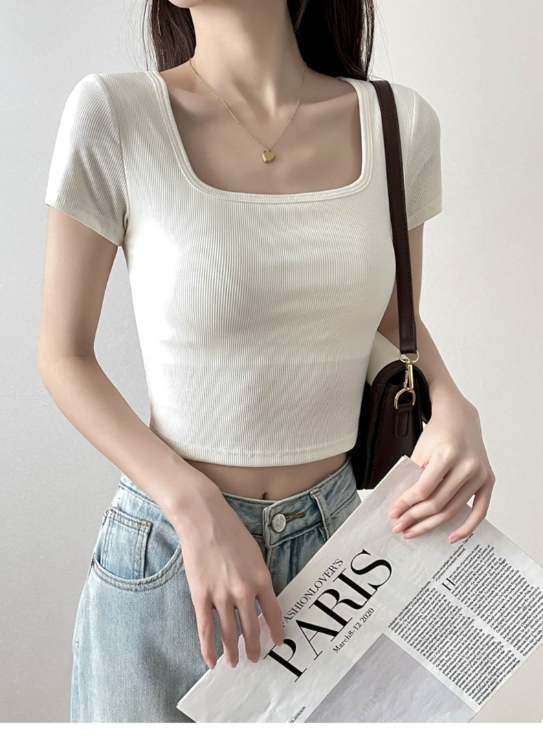 흉부 패드 스레드 스퀘어 넥 여성용 아우터 브라 원피스 배벨에 노출 된 반소매베이스 탑 얇은 여름 얇은 짧은 반소매 티셔츠