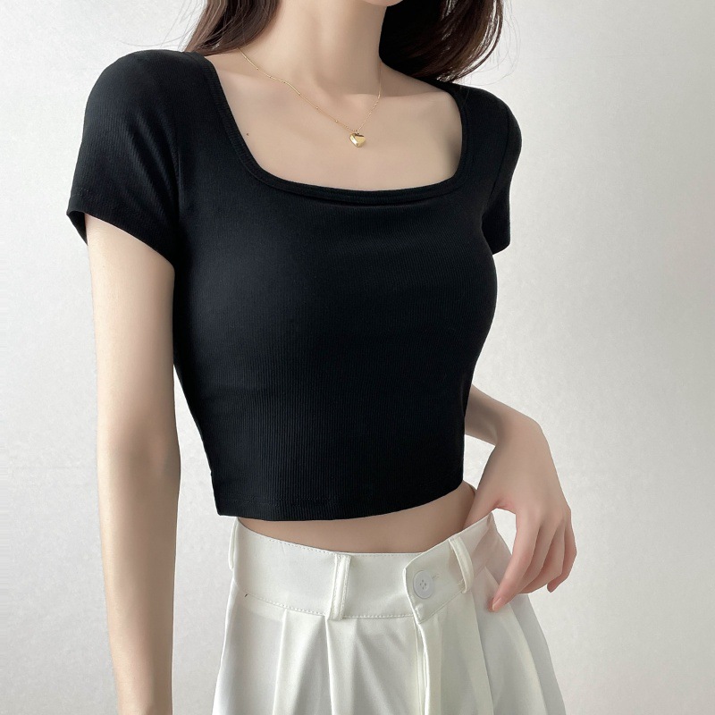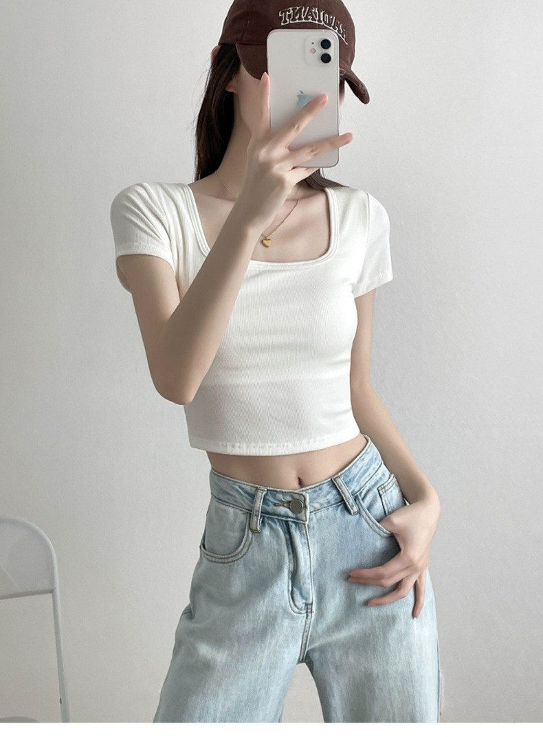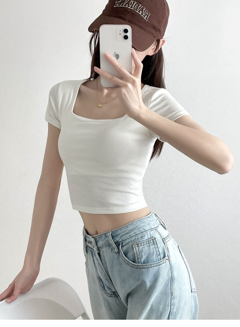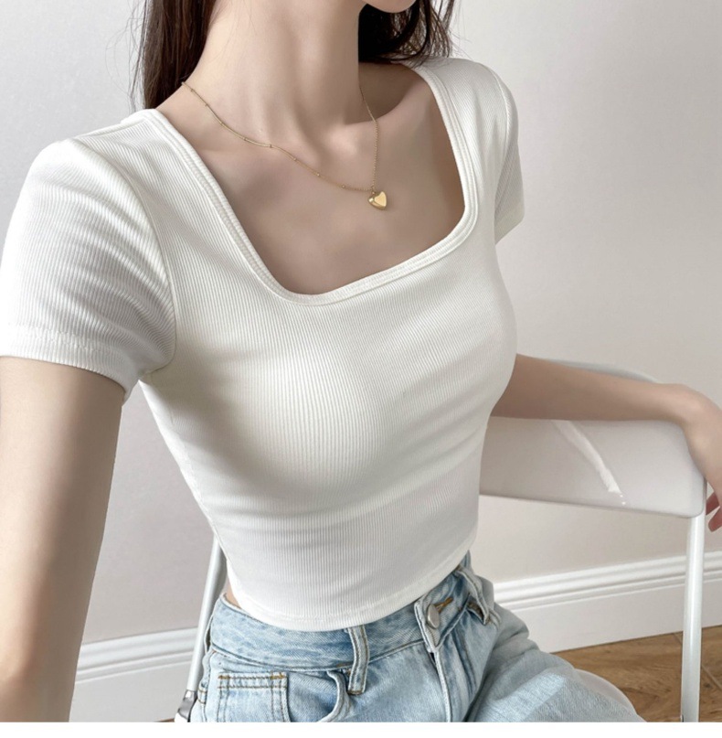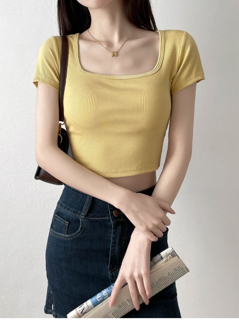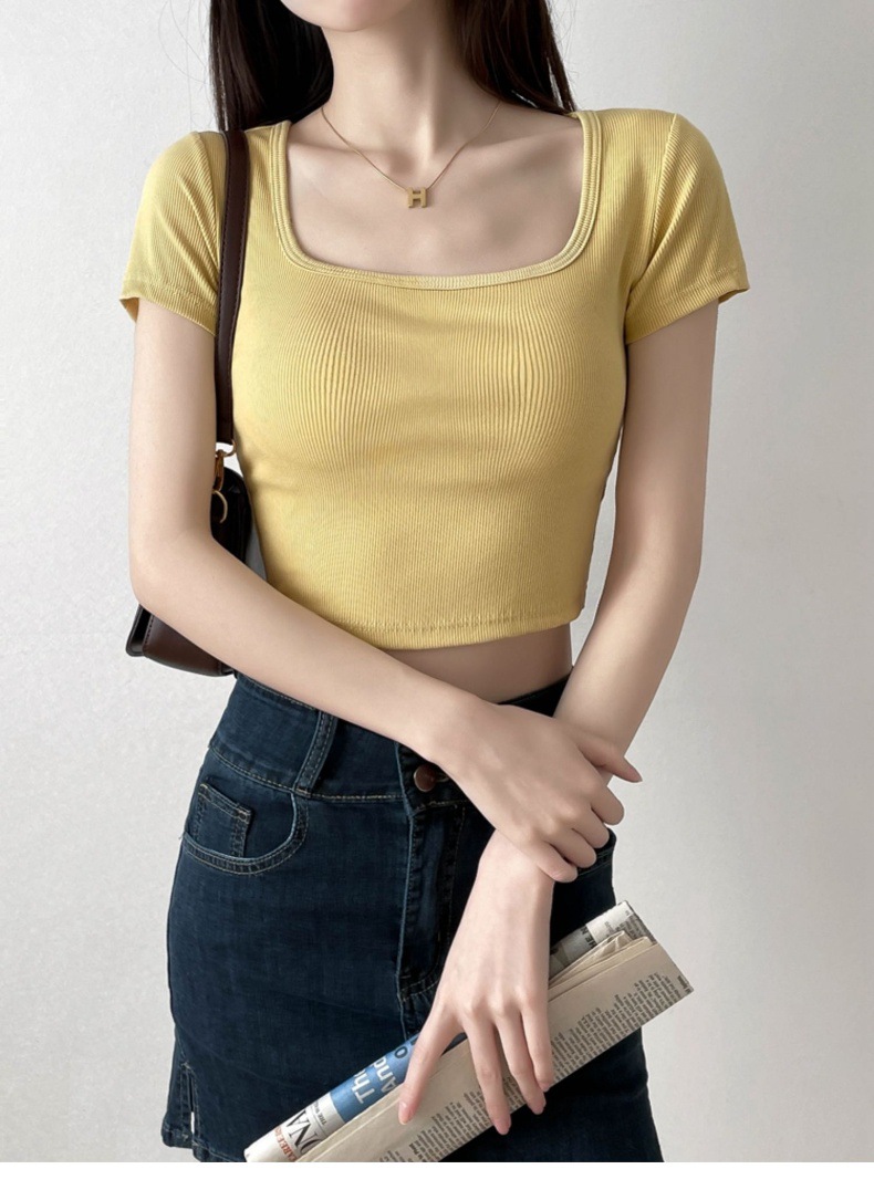 흉부 패드 스레드 스퀘어 넥 여성용 아우터 브라 원피스 배벨에 노출 된 반소매베이스 탑 얇은 여름 얇은 짧은 반소매 티셔츠