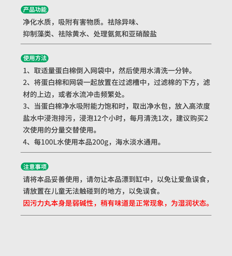 단백질솜 수족관 관상어 수조 정수제, 오염제거제, 황수 제거제, 흡착제, 탈취제, 활성탄 수질 처리제