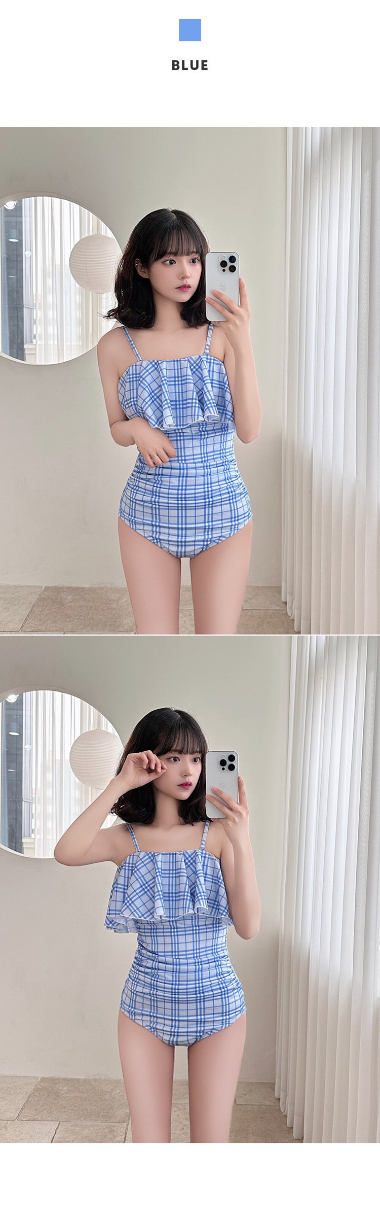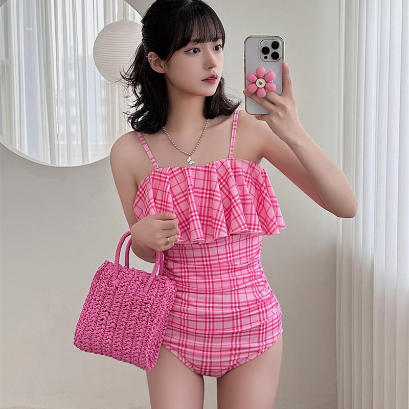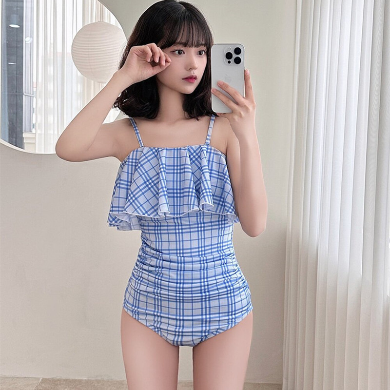 2024 한국 웨이브 에지 격자 무늬 스트랩리스 슬링 슬림 소녀의 귀여운 수영복 여성의 보수적 인 온천 수영복스토어 가기