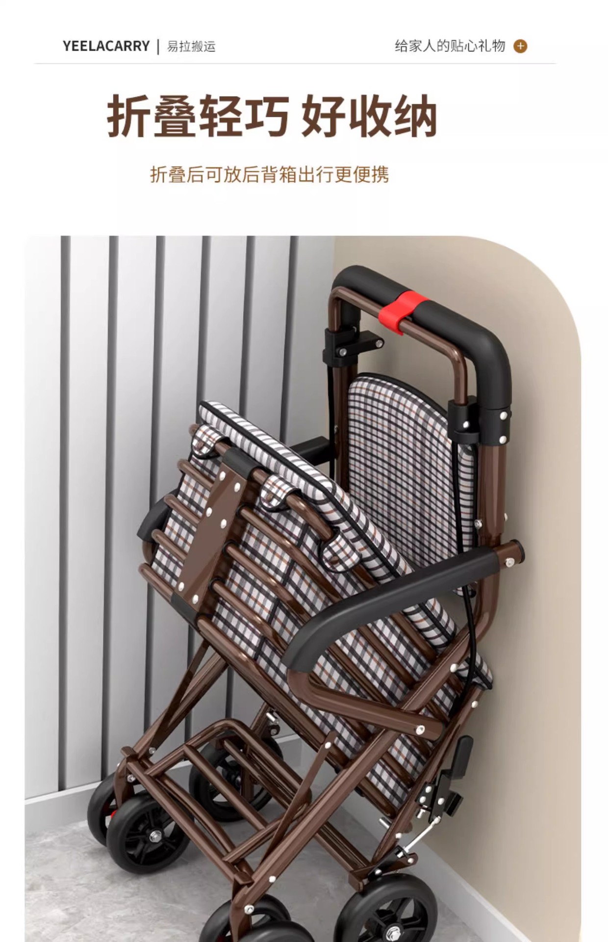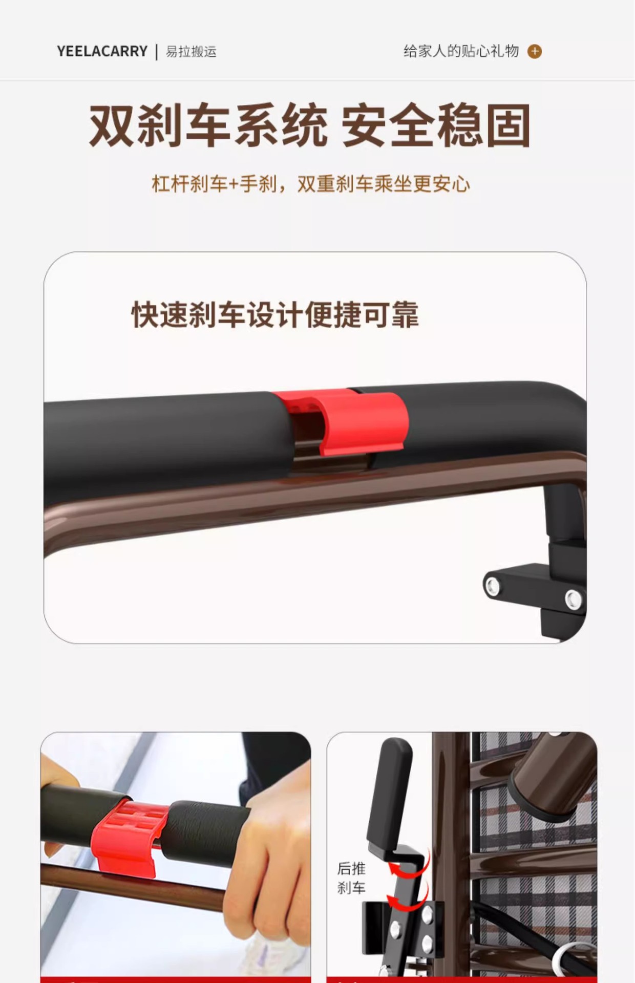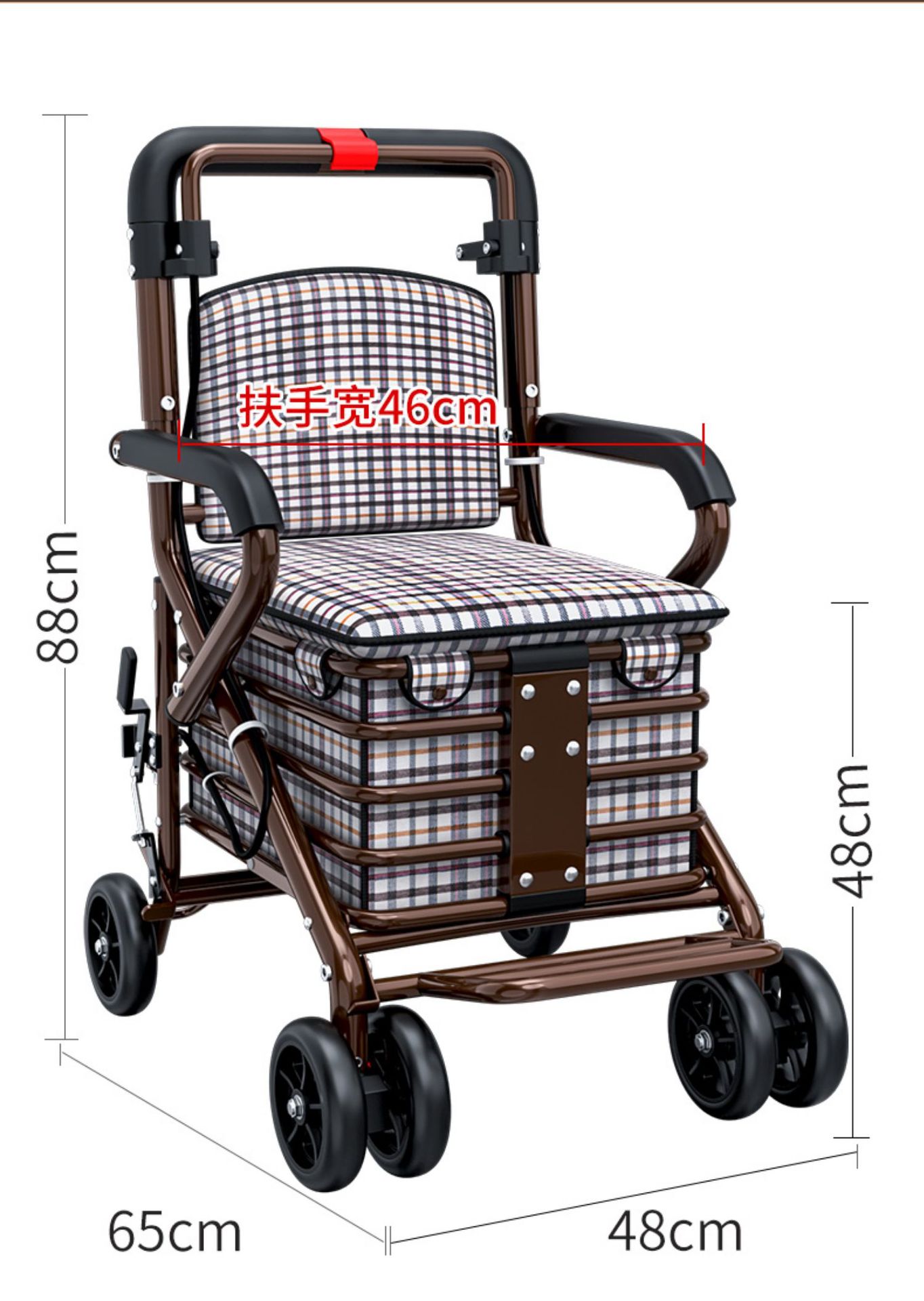 • 단일 핸드 브레이크 앞 더블 휠 풋리스 흑백 그리드 쿠션 레드 프레임