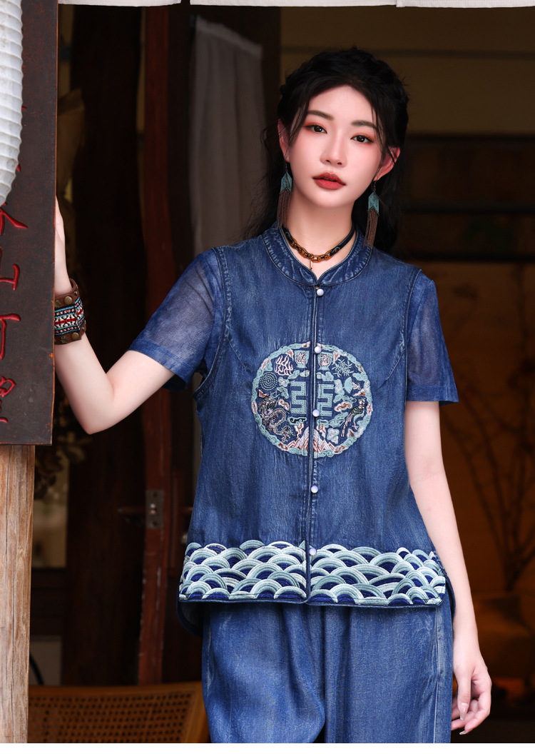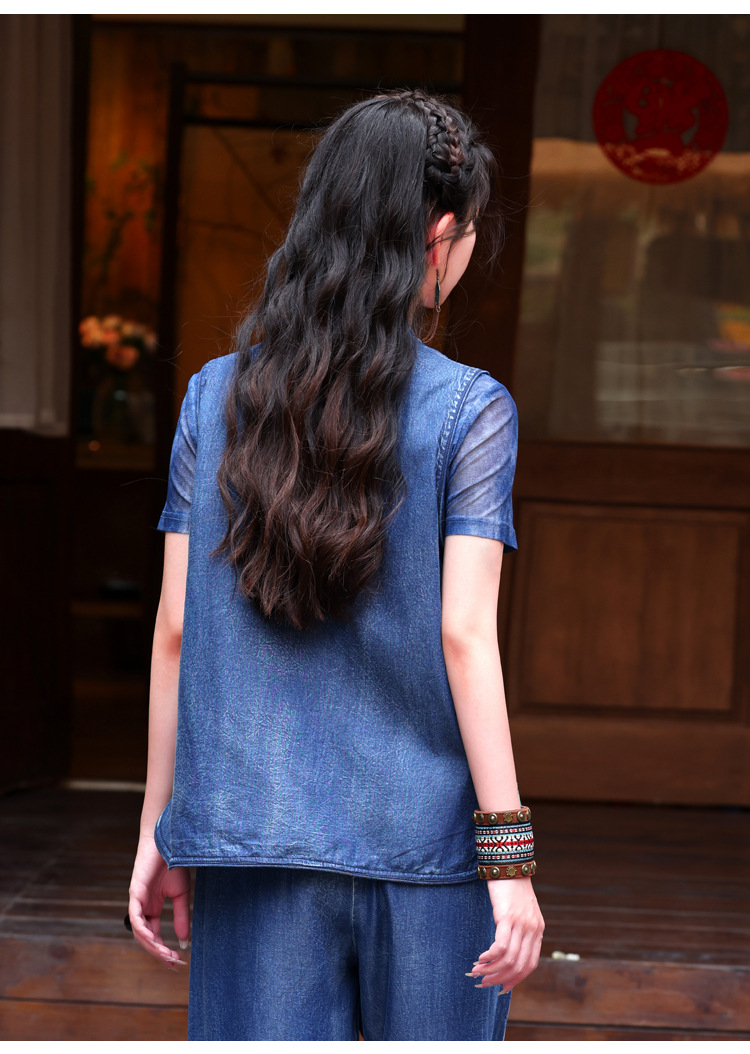 2024 년 여름 새로운 빈티지 민족 스타일 민소매 데님 최고 여성의 새로운 중국 스타일 중공업 자수 조끼 여성 9381
