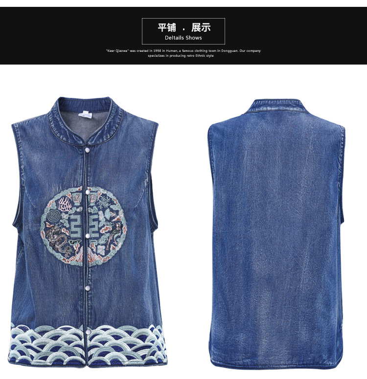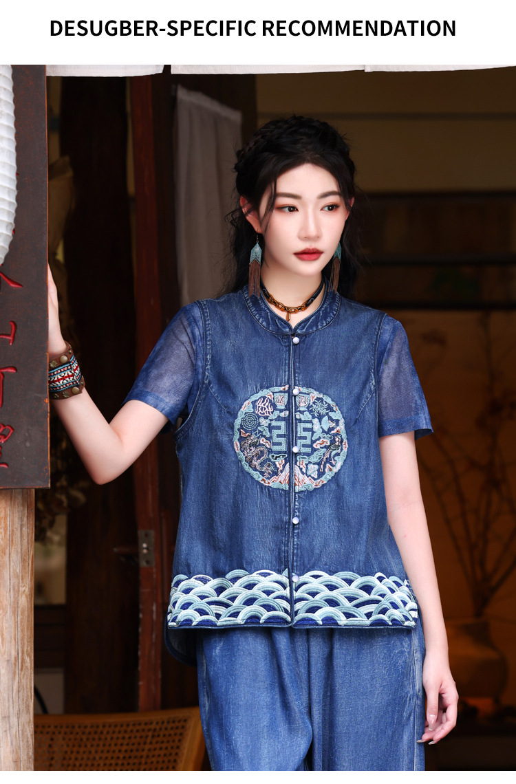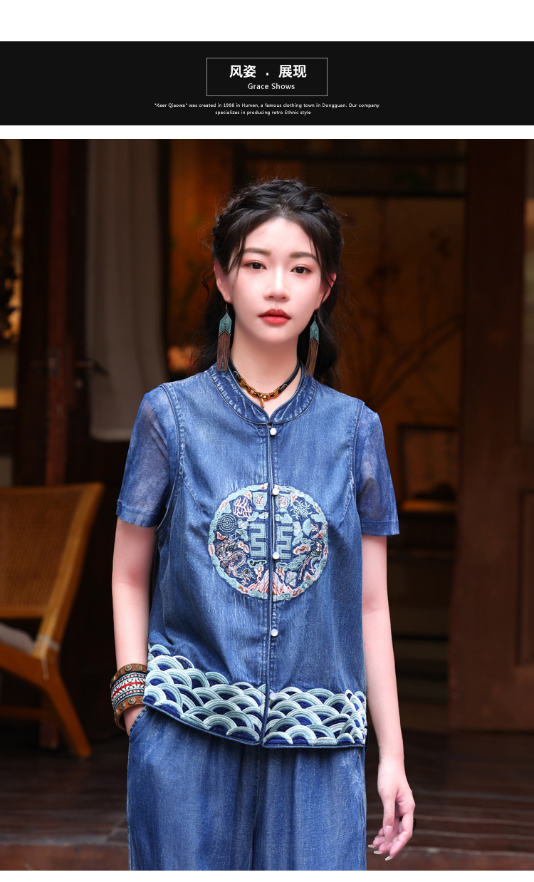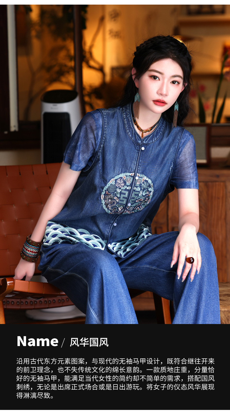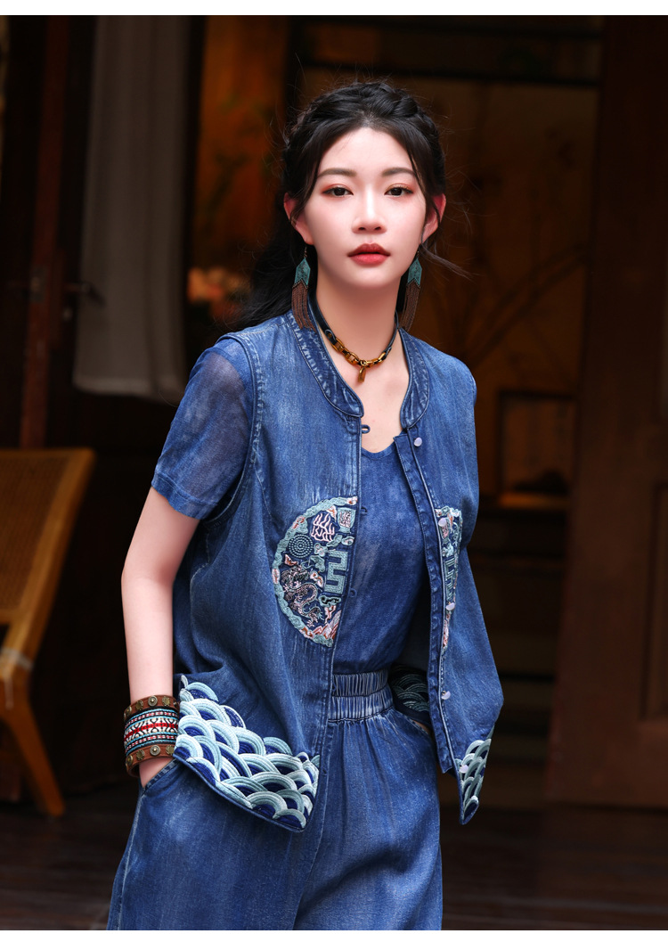 2024 년 여름 새로운 빈티지 민족 스타일 민소매 데님 최고 여성의 새로운 중국 스타일 중공업 자수 조끼 여성 9381스토어 가기