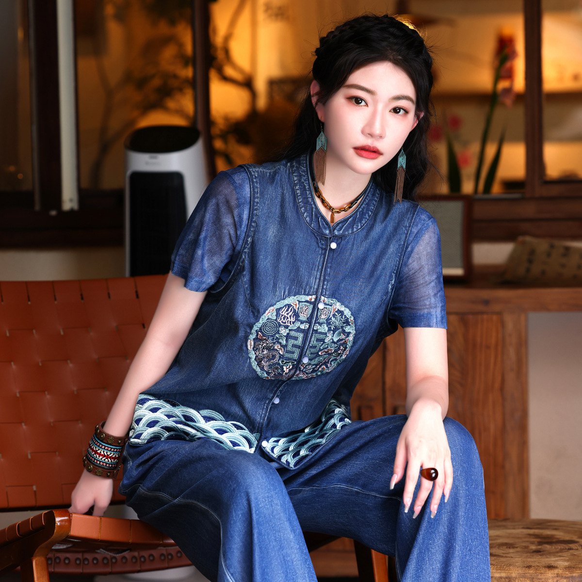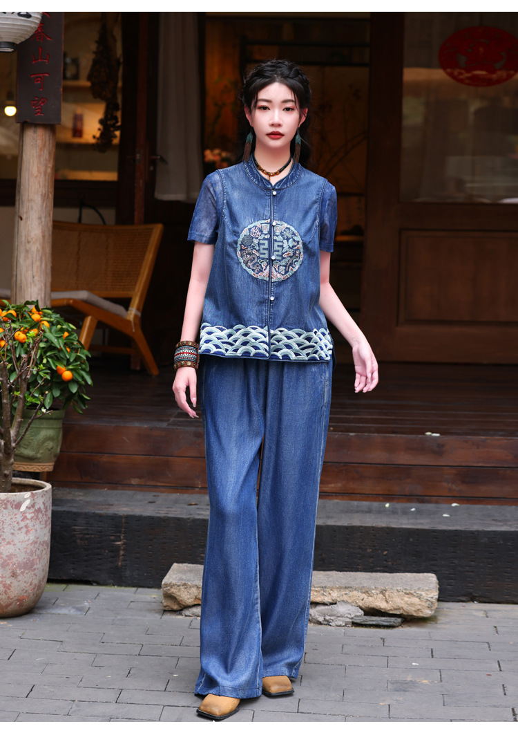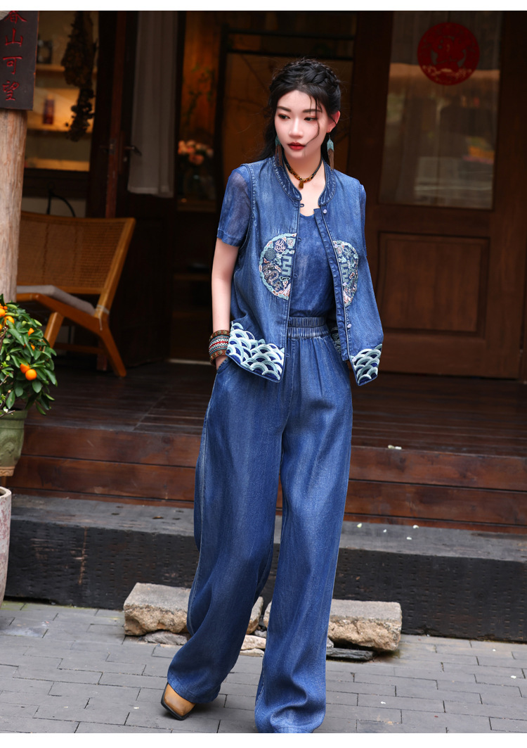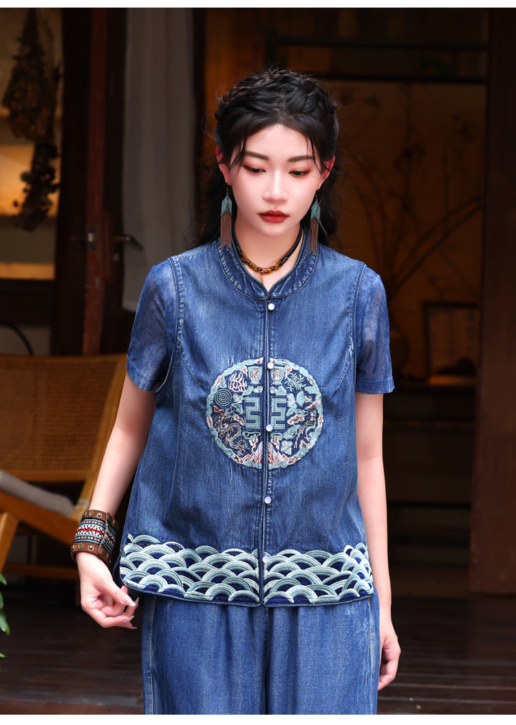 2024 년 여름 새로운 빈티지 민족 스타일 민소매 데님 최고 여성의 새로운 중국 스타일 중공업 자수 조끼 여성 9381스토어 가기