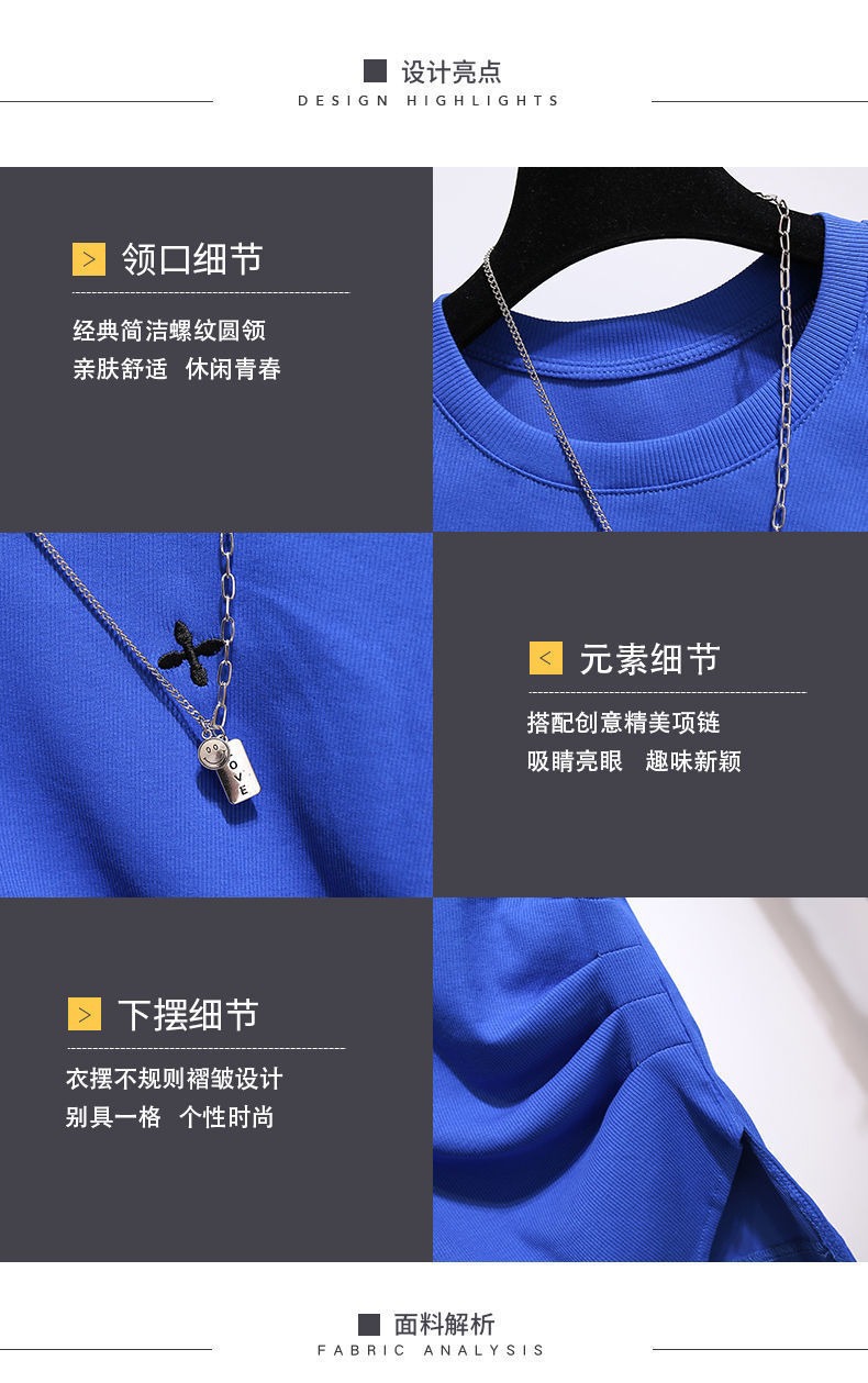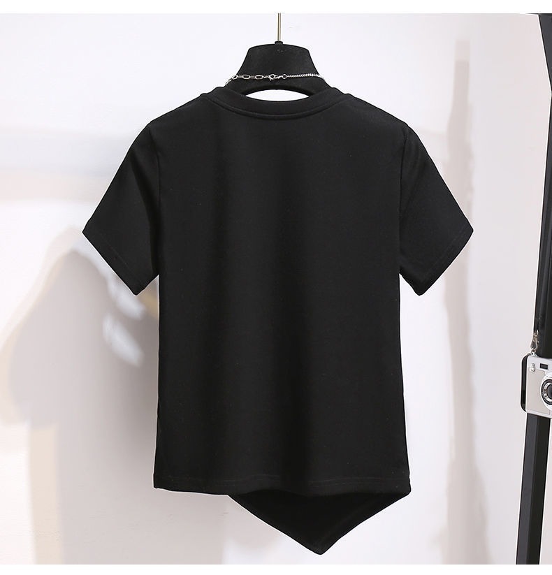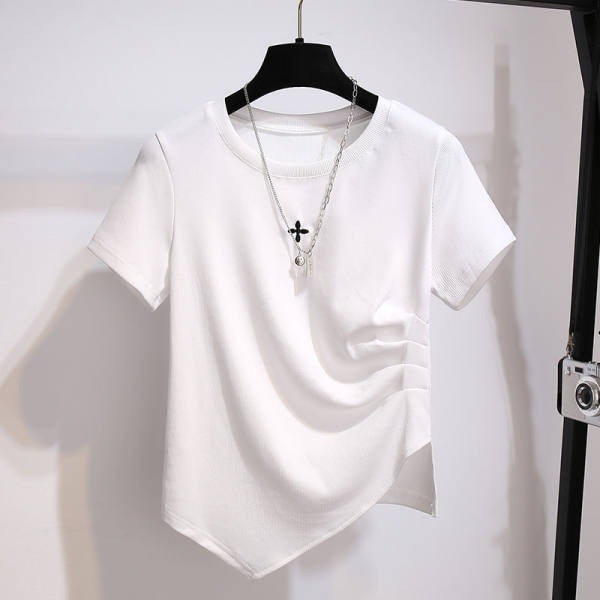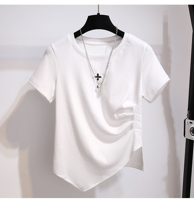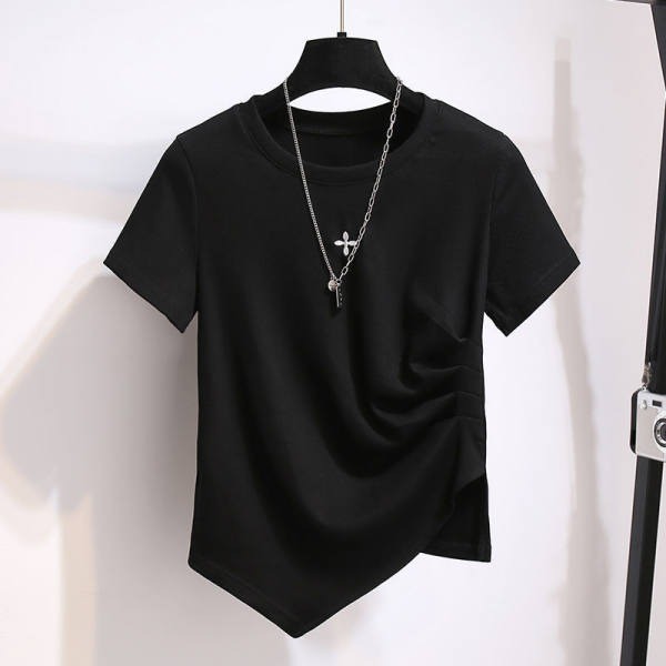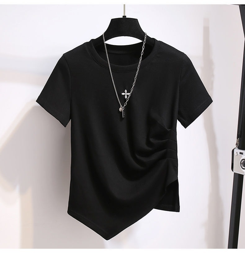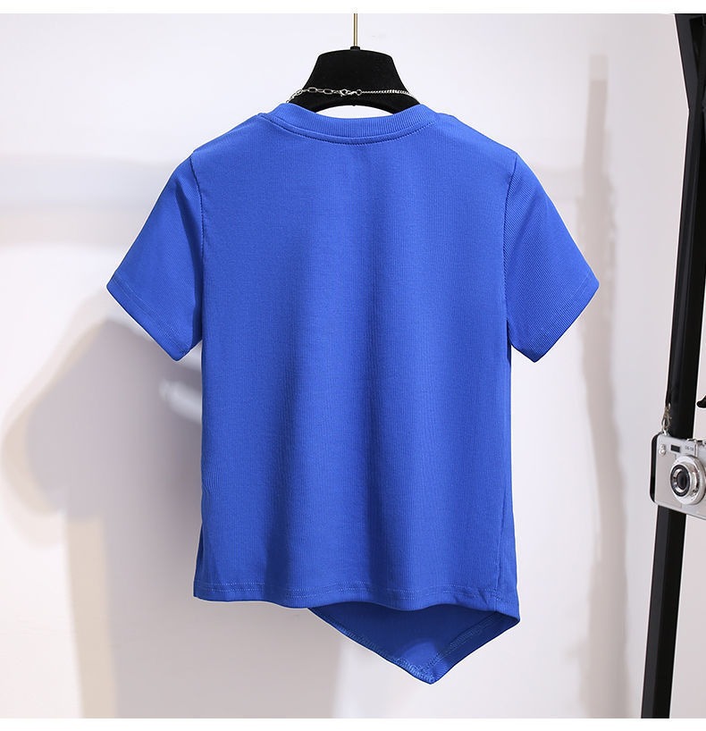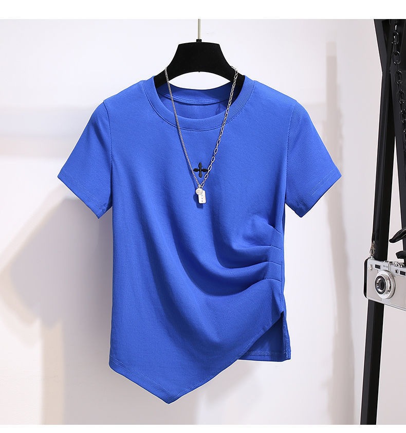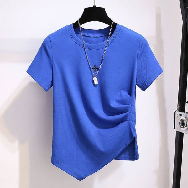 2024 년 여름 새로운 불규칙한 클라인 블루 티셔츠 여성용 반팔 거리 튀김 디자인 틈새 쇼트 탑스토어 가기