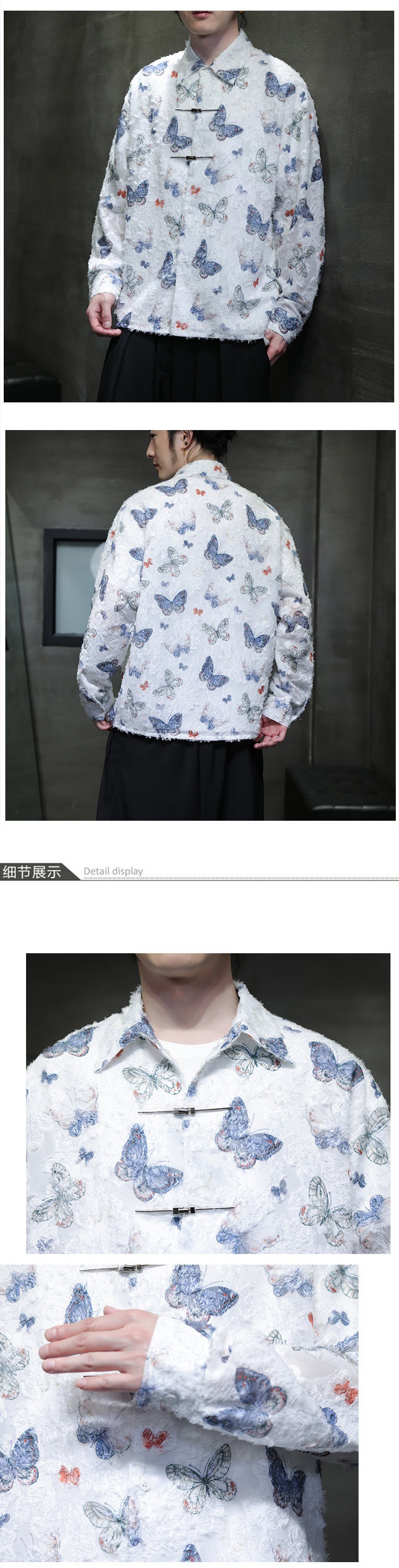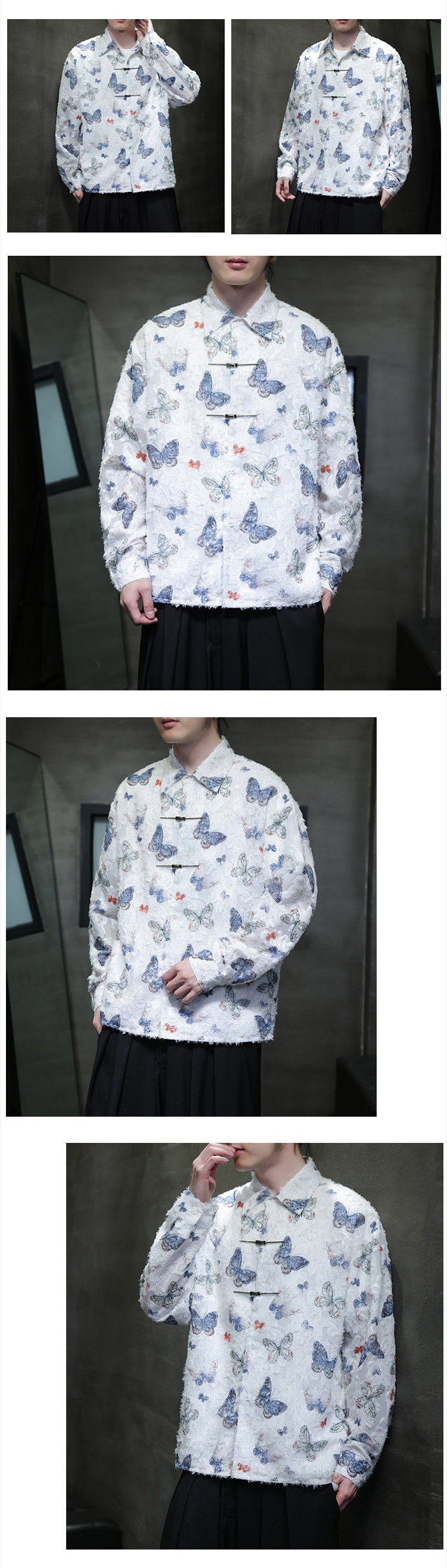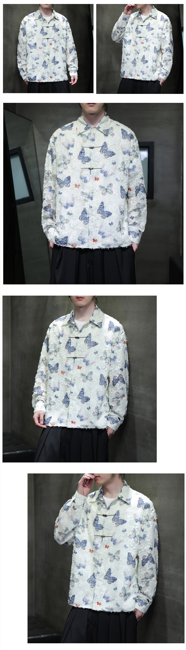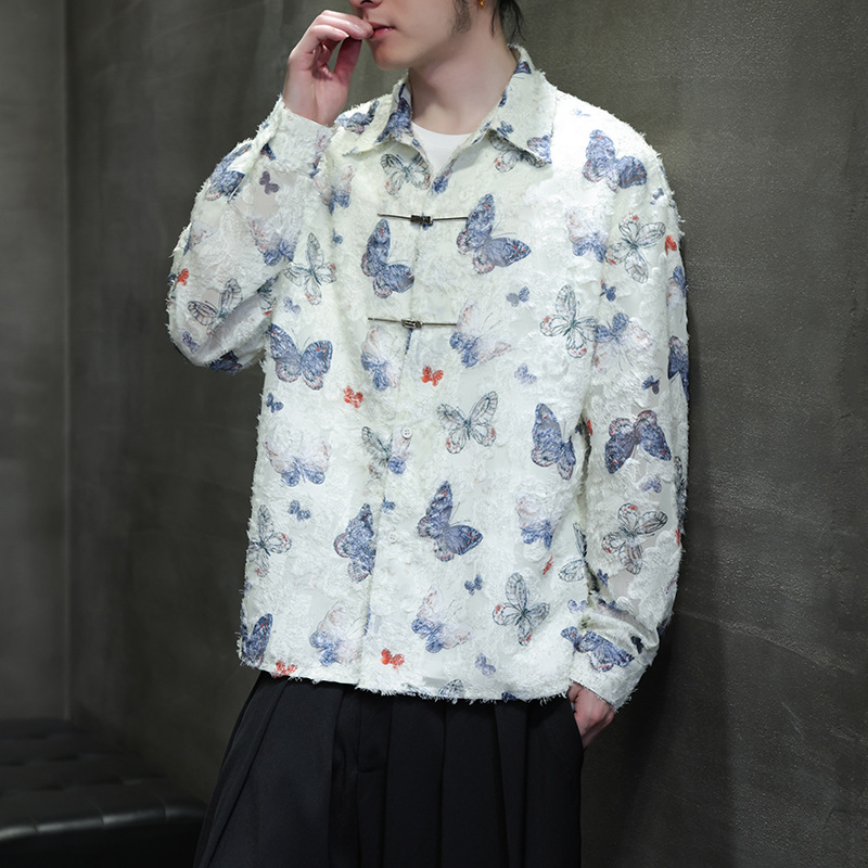 셔츠 새로운 도착 중국 스타일 오간자 나비 술 자카드 반투명 버클 남자의 느슨한 유행 긴 소매 라이닝