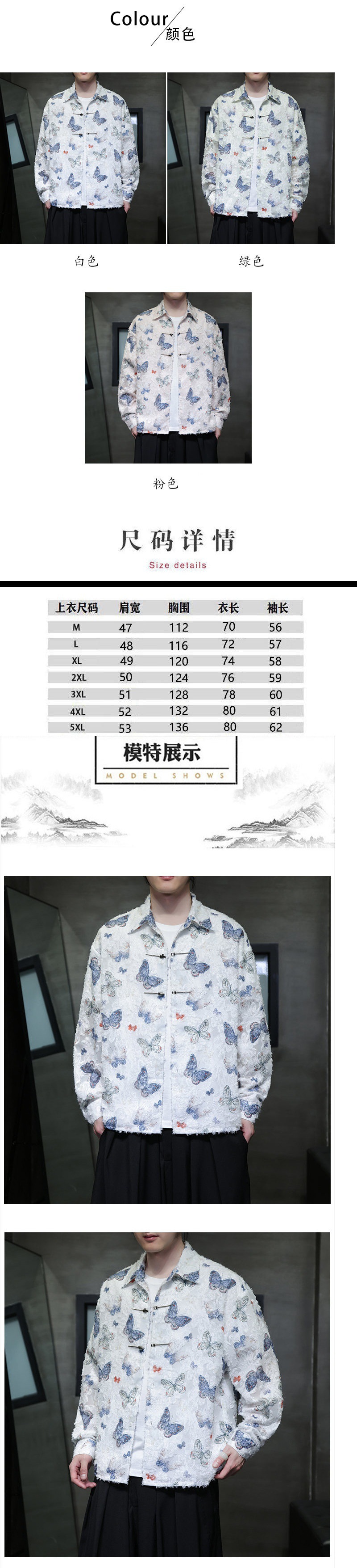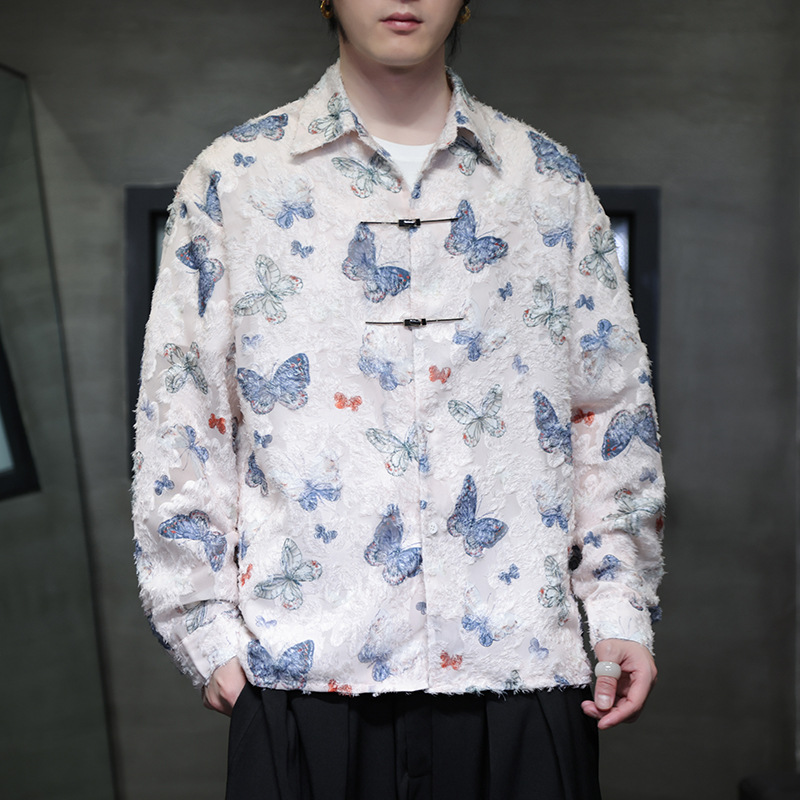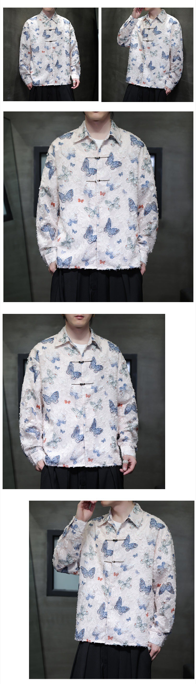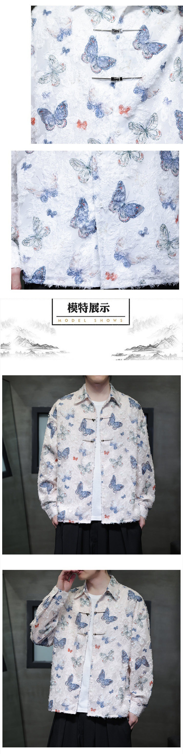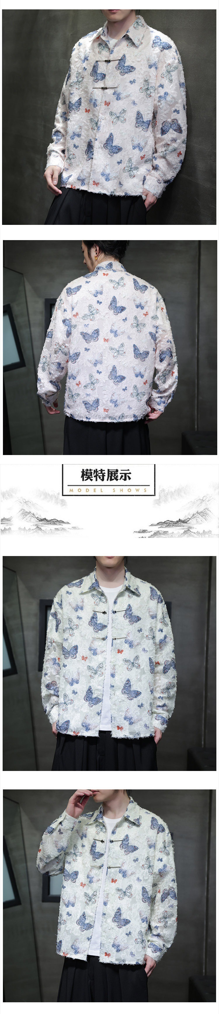 셔츠 새로운 도착 중국 스타일 오간자 나비 술 자카드 반투명 버클 남자의 느슨한 유행 긴 소매 라이닝