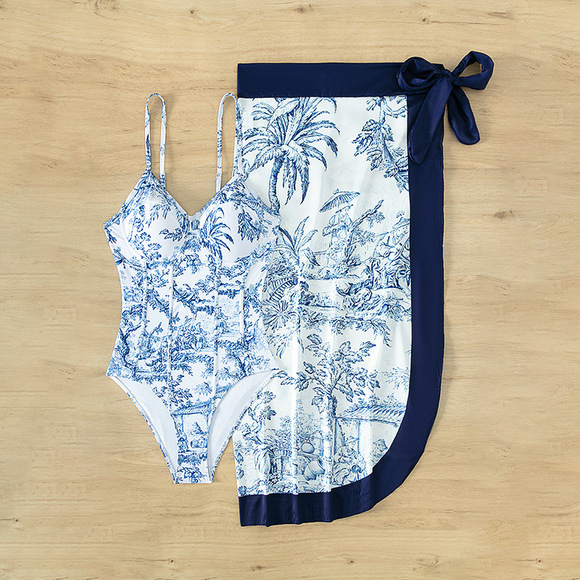 2024显瘦复古印花亚马逊独立站爆款泳装欧美新款分体泳衣纱裙套装