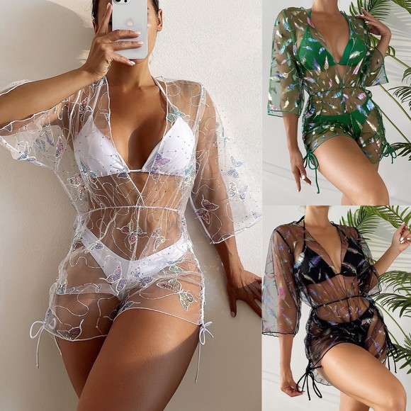 2024年新款欧美泳装蕾丝bikini网纱三件套性感露背分体比基尼泳衣
