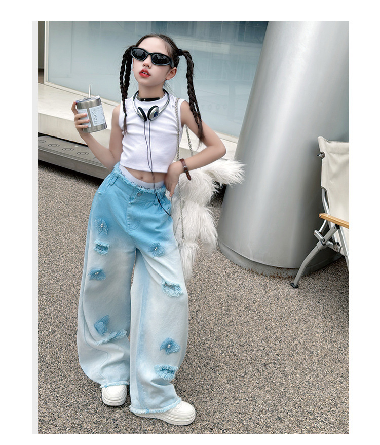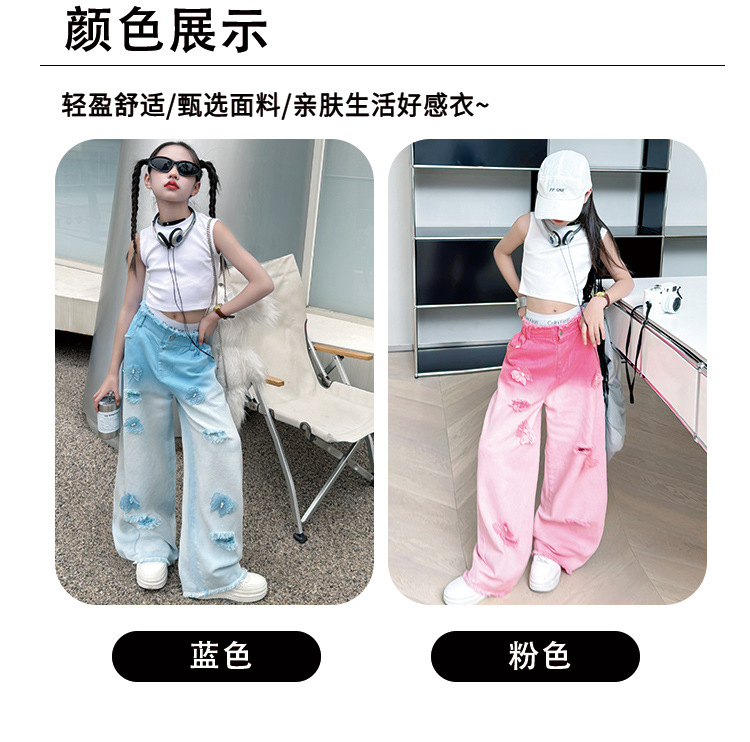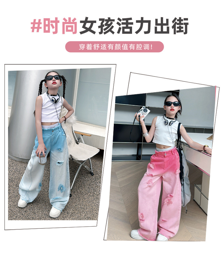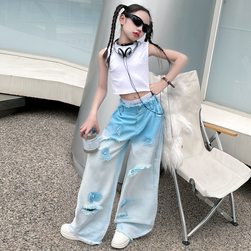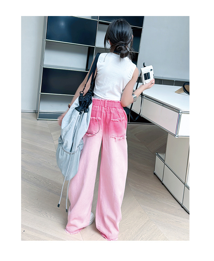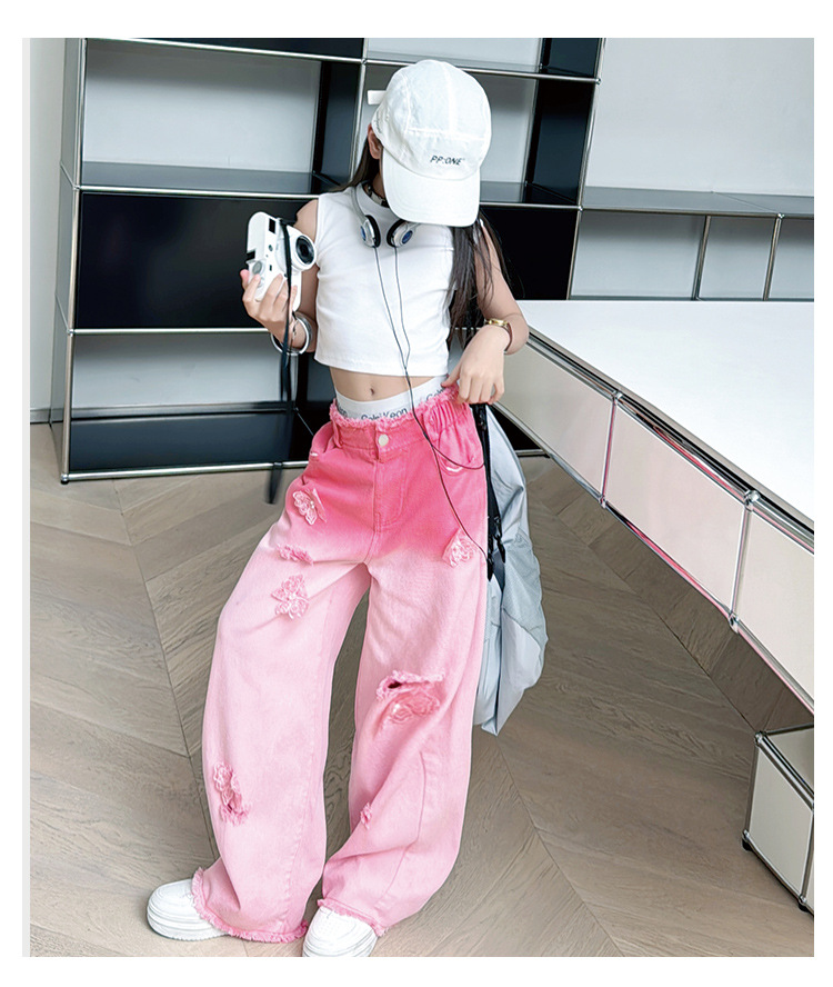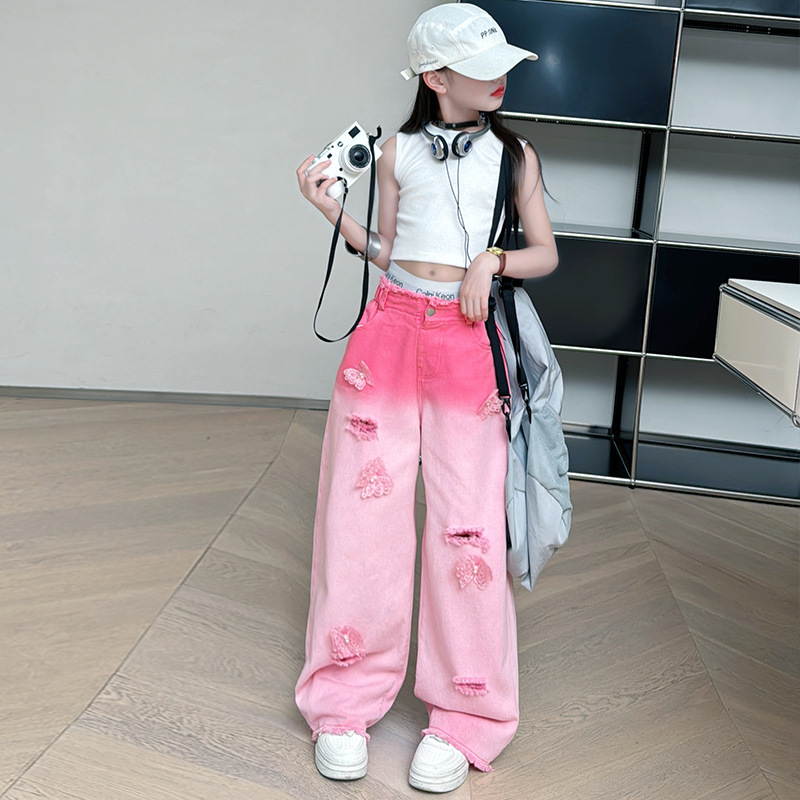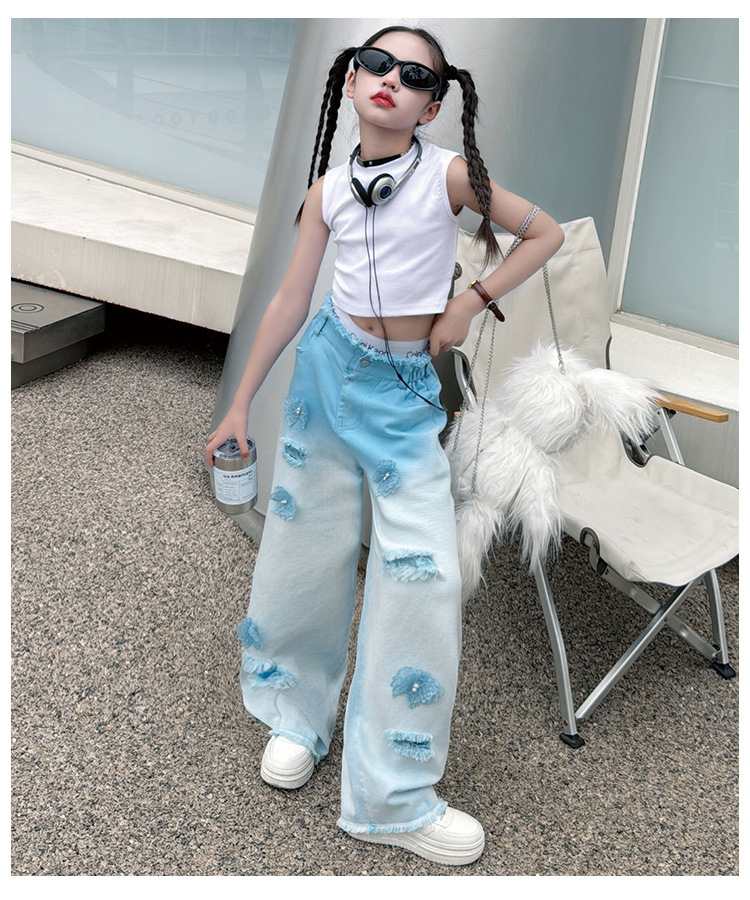 소녀 그라디언트 리핑 청바지 여름 얇은 인터넷 유명인 프라이드 스트리트 걸의 큰 어린이 스트레이트 와이드 레그 바지 높은 허리 바지스토어 가기