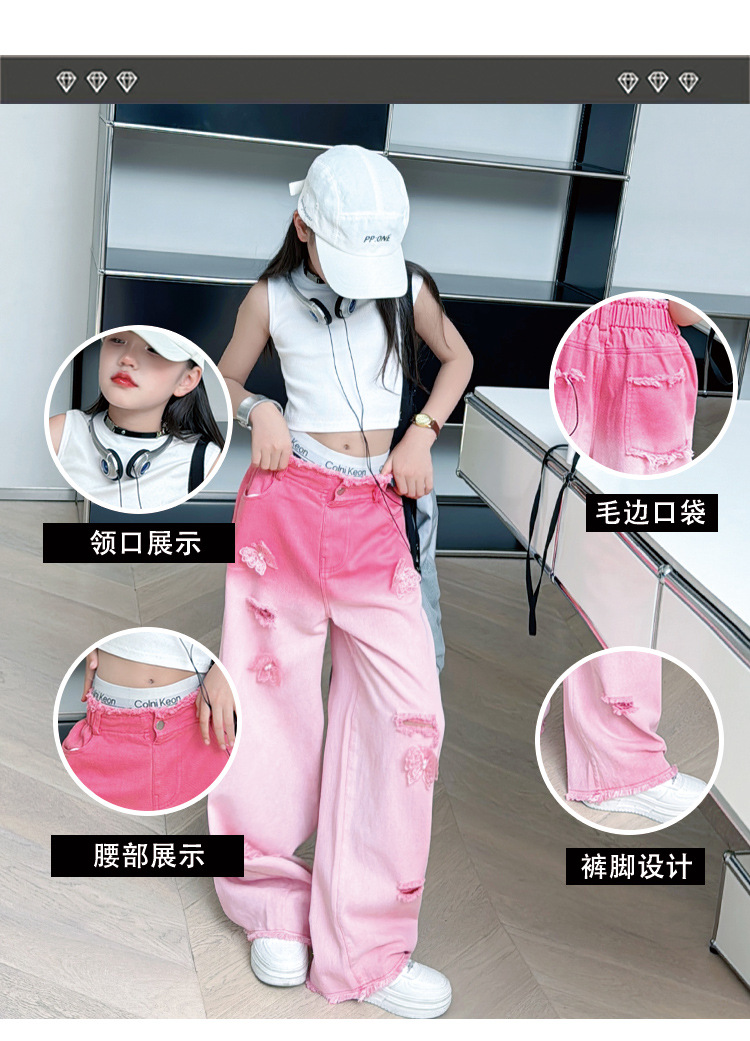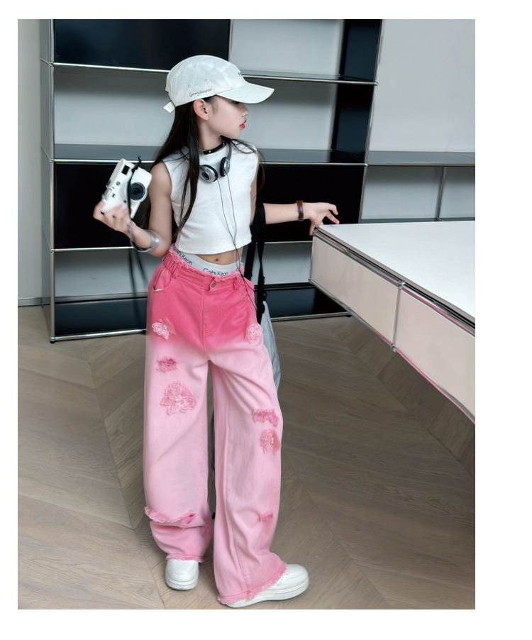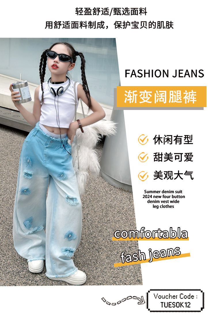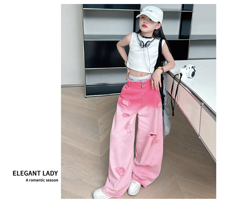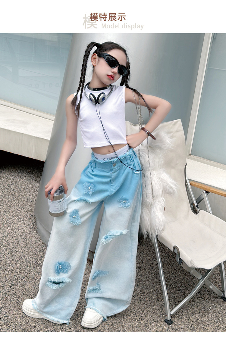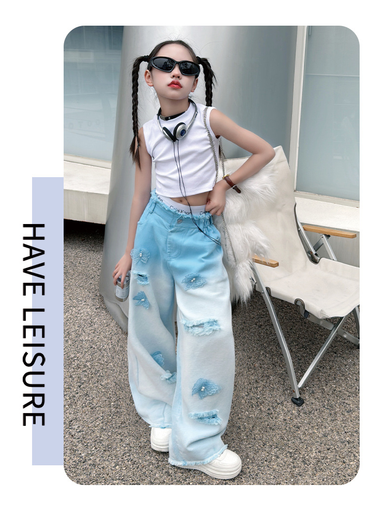 소녀 그라디언트 리핑 청바지 여름 얇은 인터넷 유명인 프라이드 스트리트 걸의 큰 어린이 스트레이트 와이드 레그 바지 높은 허리 바지스토어 가기