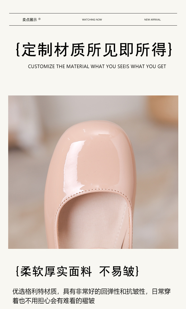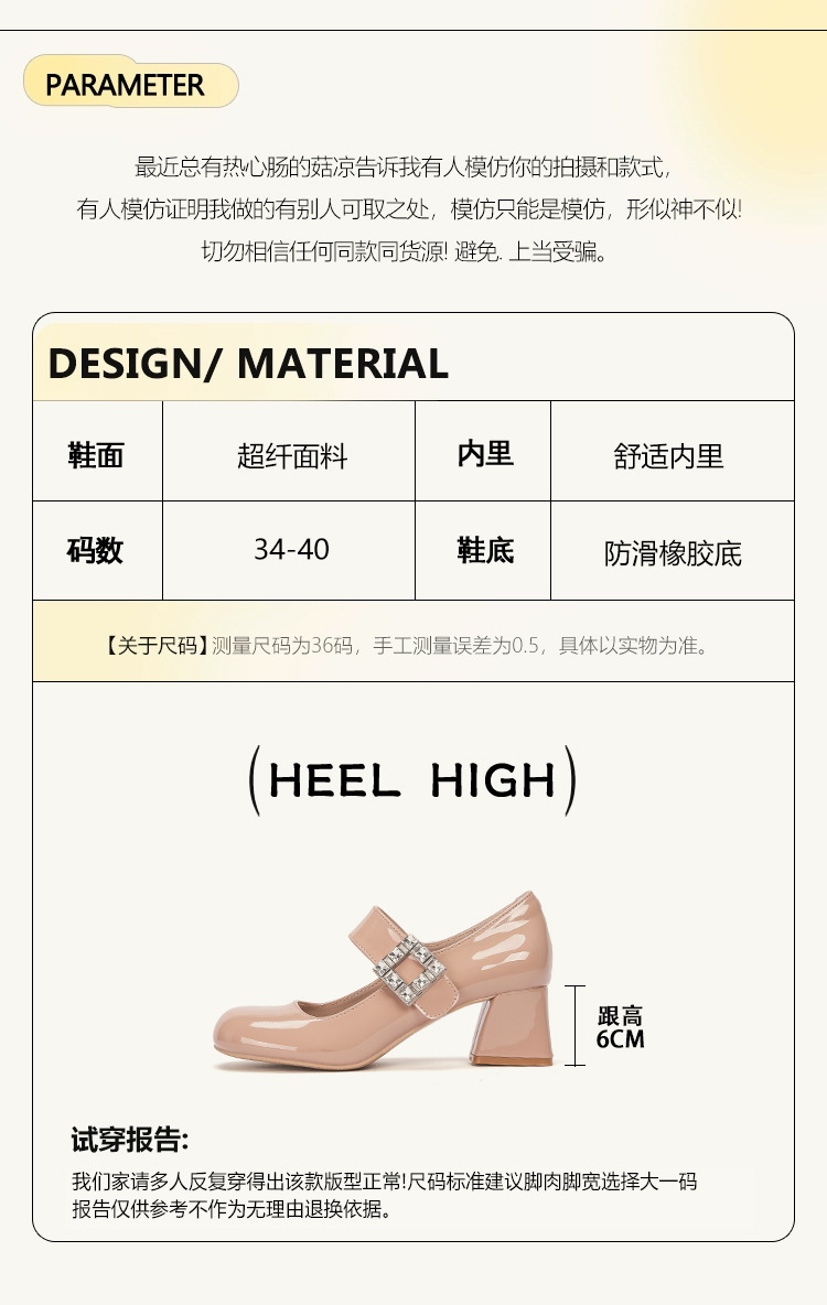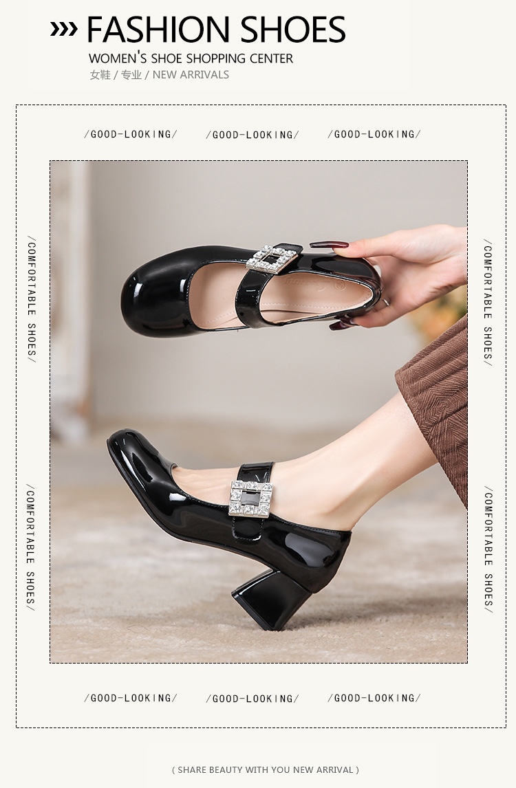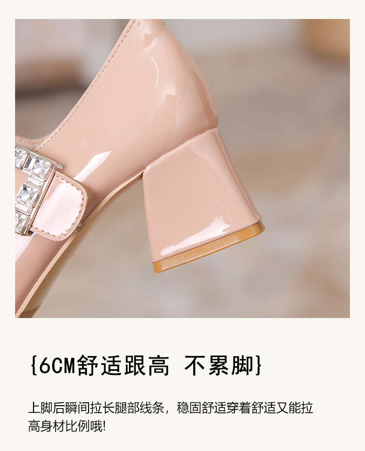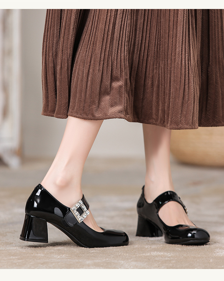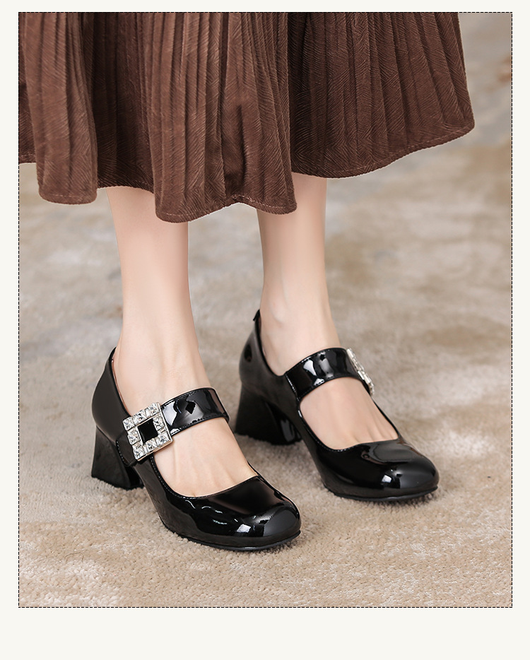 2024 봄과 가을 새로운 작은 가죽 신발 하이힐 얕은 입 싱글 신발 라운드 토 라인스톤 프랑스 메리 제인 청키 힐 신발스토어 가기