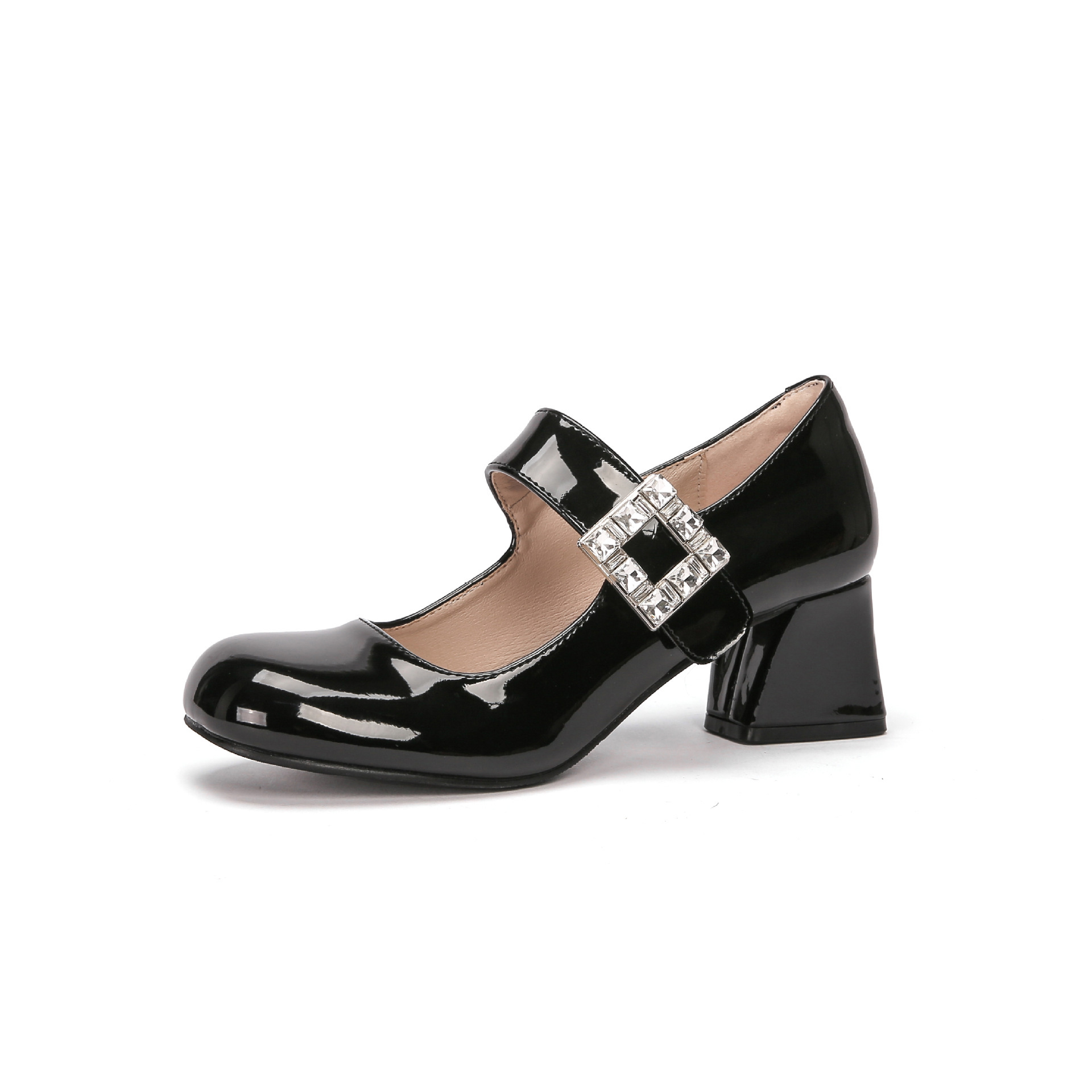 2024 봄과 가을 새로운 작은 가죽 신발 하이힐 얕은 입 싱글 신발 라운드 토 라인스톤 프랑스 메리 제인 청키 힐 신발