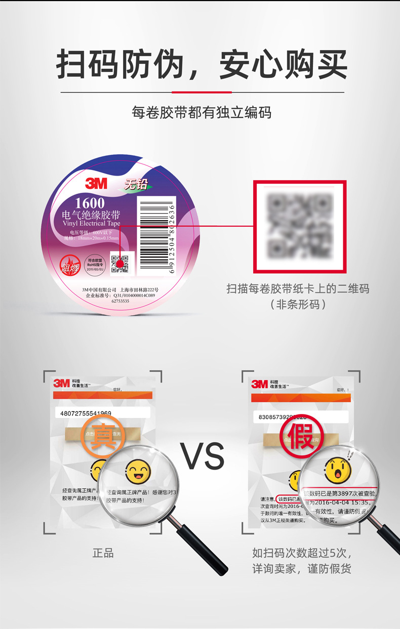 3M1600 전기 테이프 고온 및 고전압 전기 절연 테이프 방수 난연 PVC 무연 환경 검정