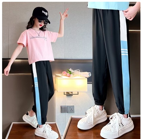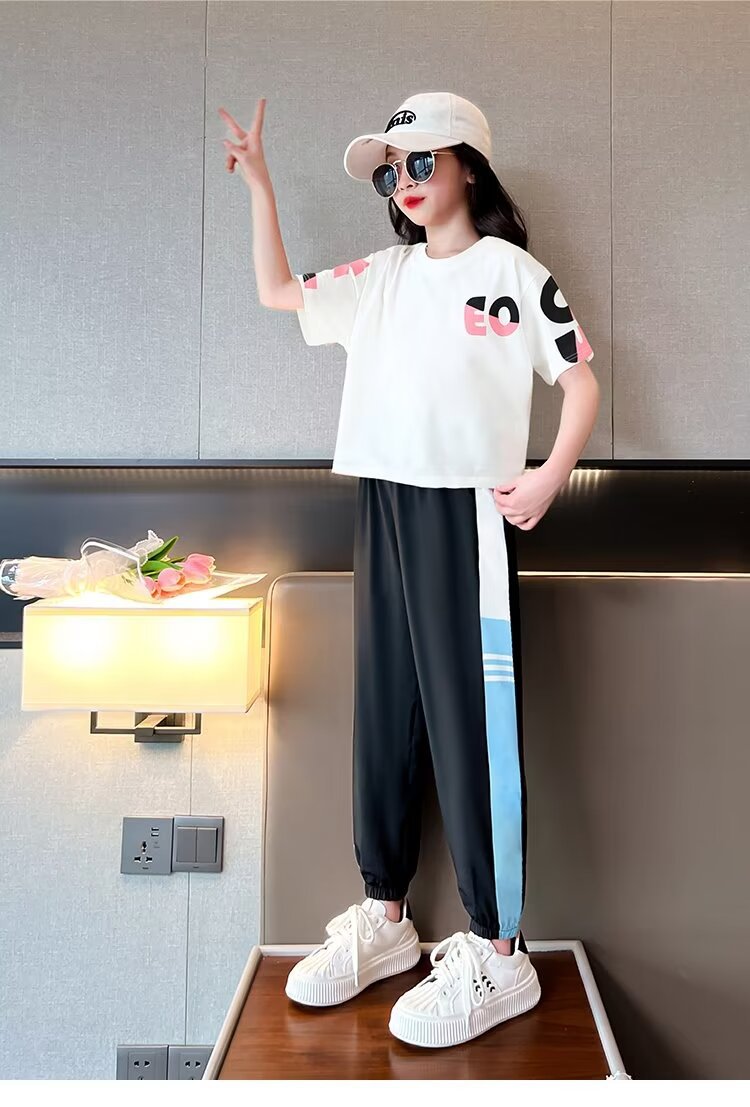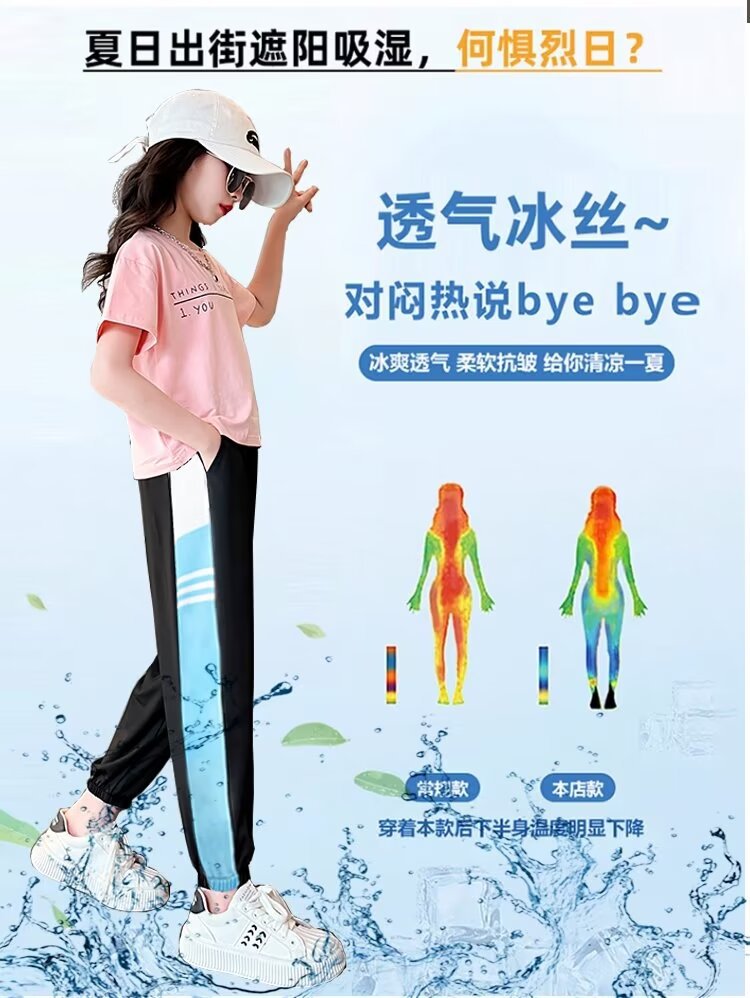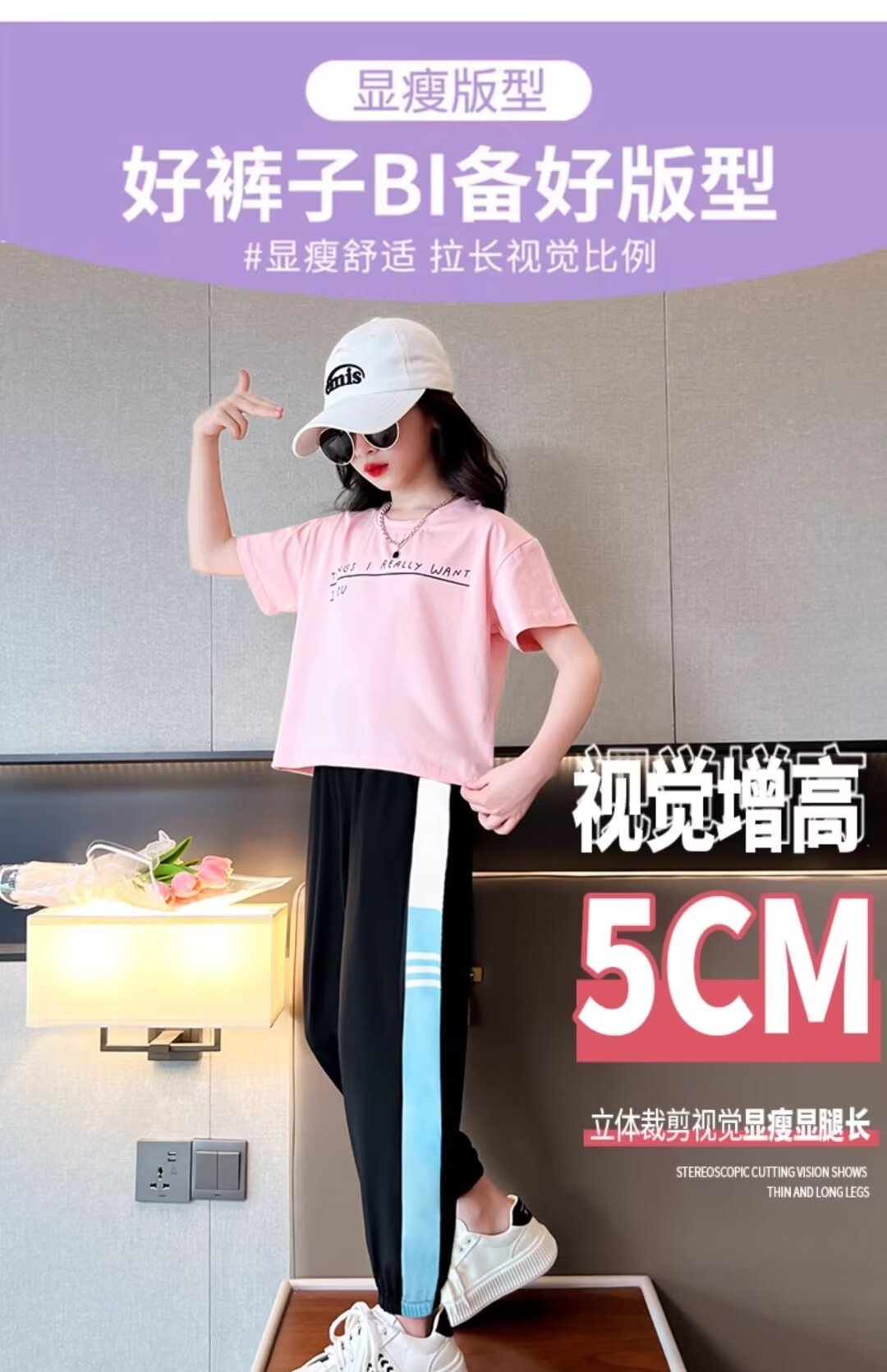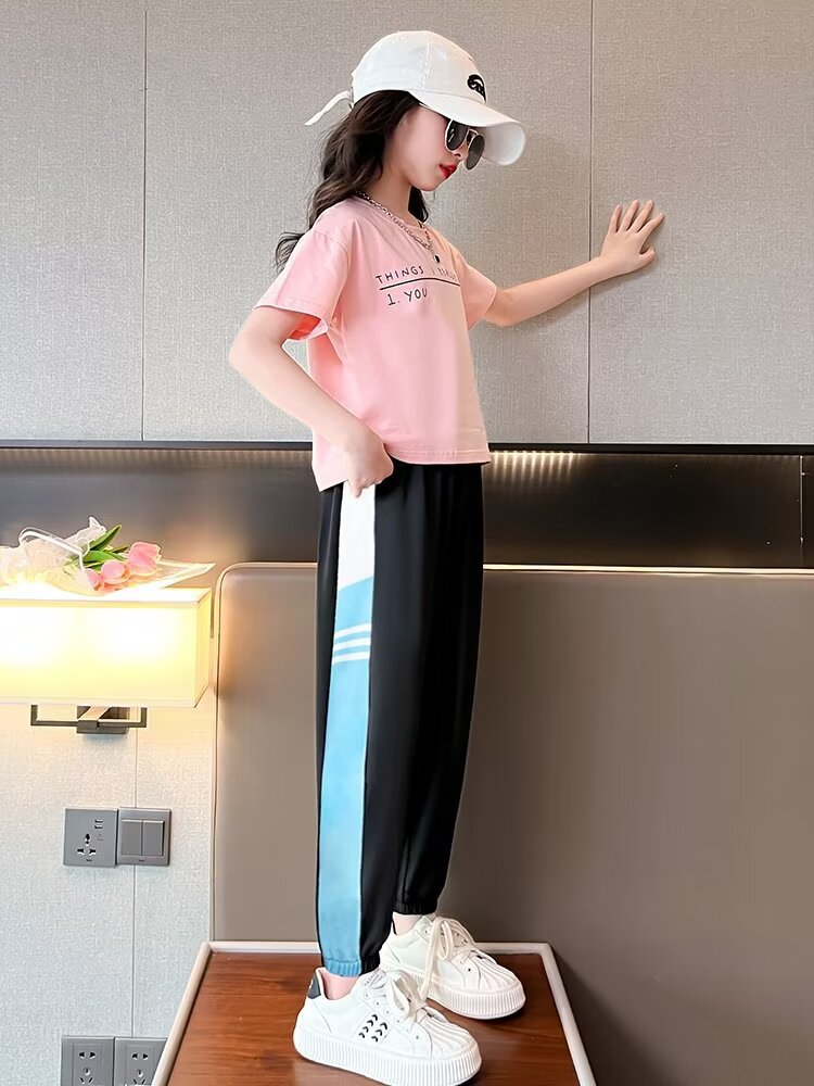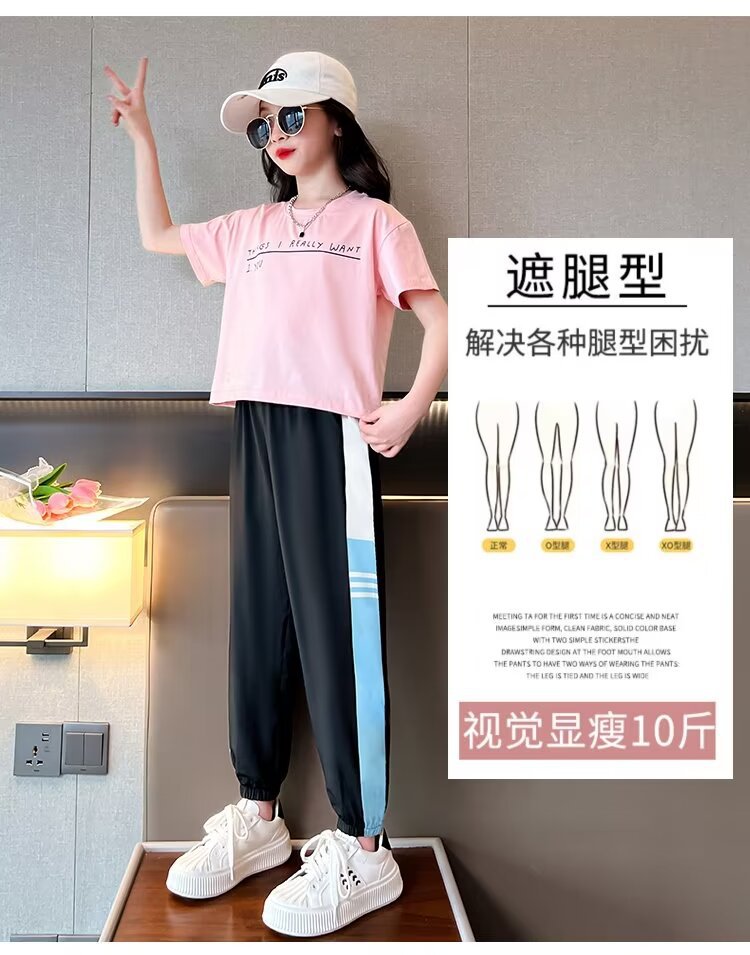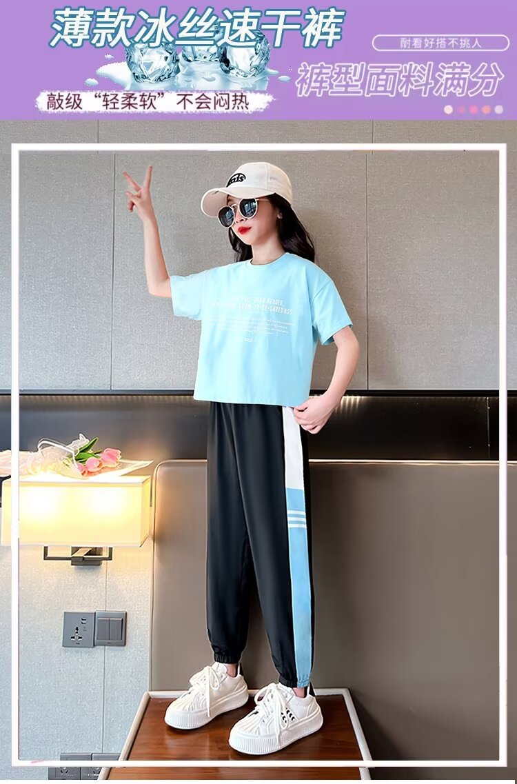 소녀 세트 여름 2024 새로운 서양식 어린이 캐주얼 여름 패션 반팔 얼음 실크 모기 방지 바지