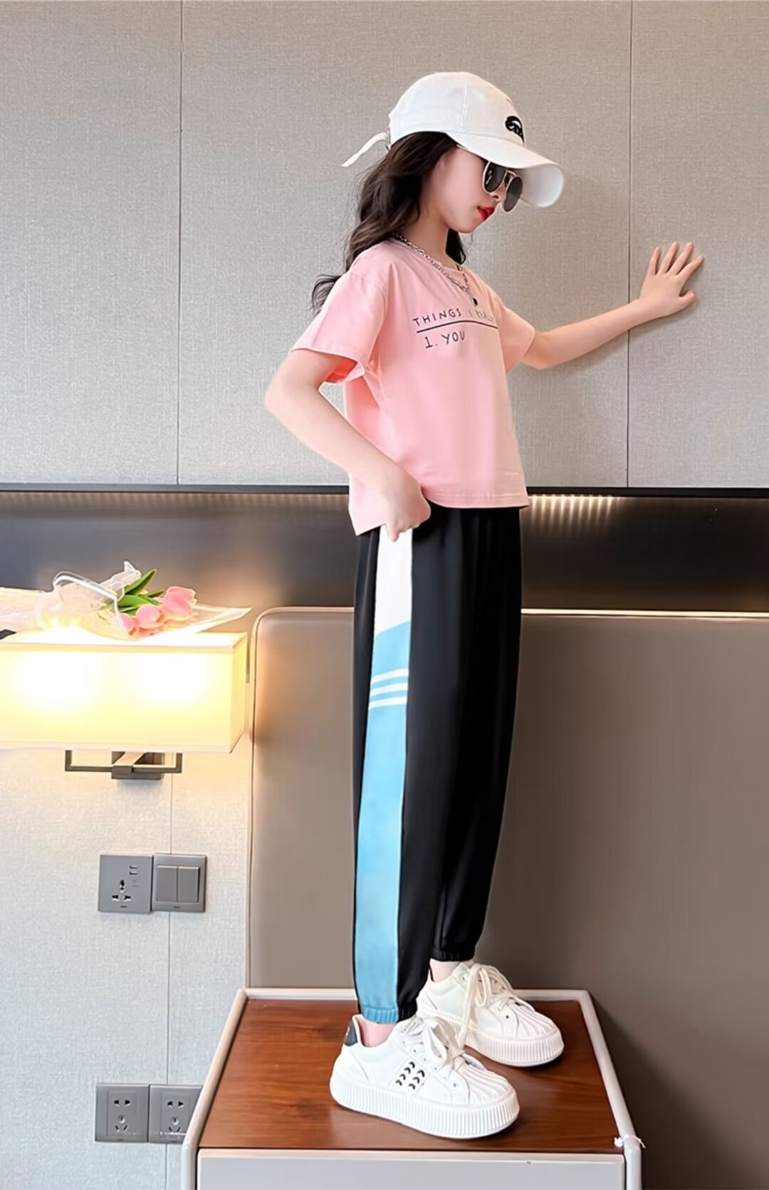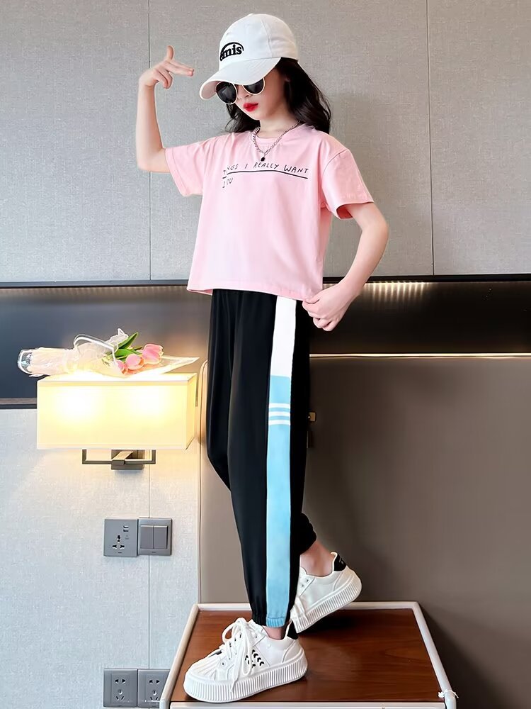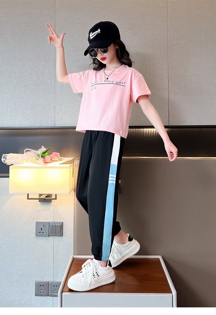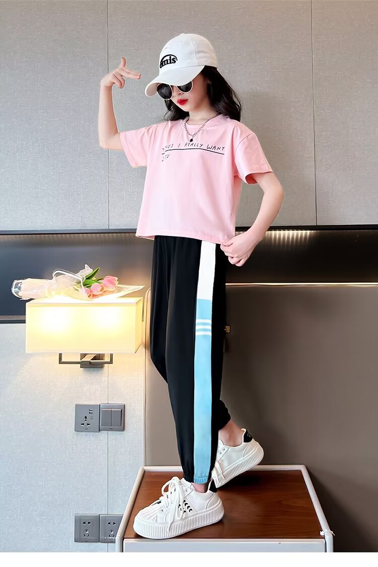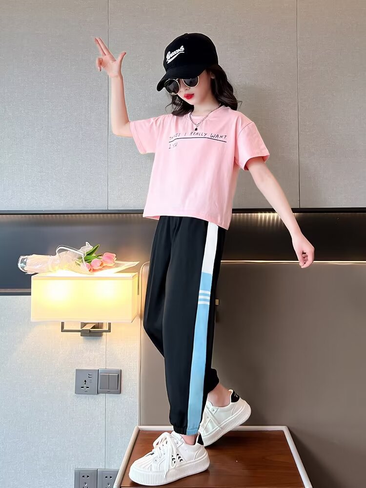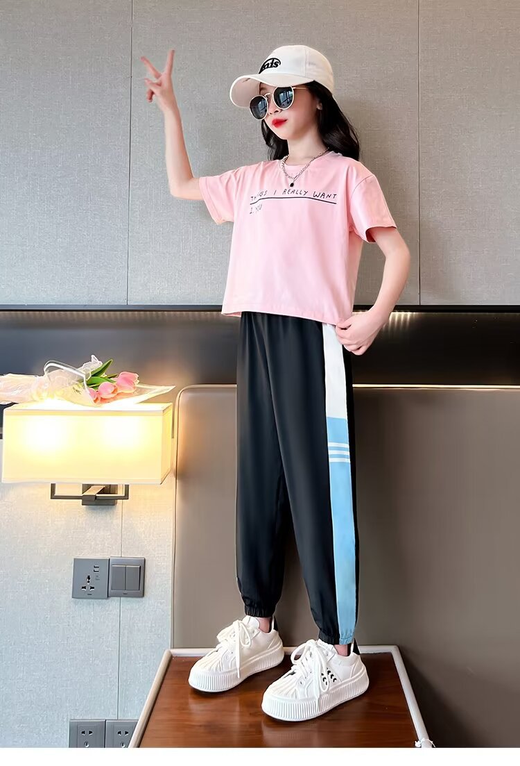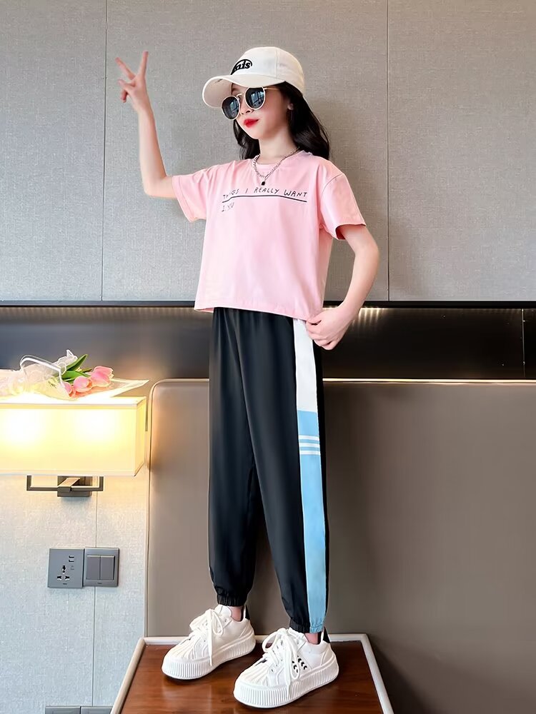소녀 세트 여름 2024 새로운 서양식 어린이 캐주얼 여름 패션 반팔 얼음 실크 모기 방지 바지