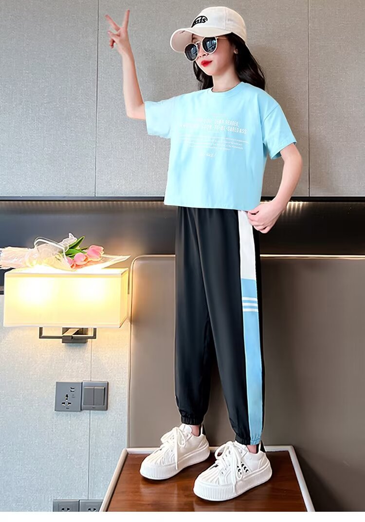 소녀 세트 여름 2024 새로운 서양식 어린이 캐주얼 여름 패션 반팔 얼음 실크 모기 방지 바지스토어 가기