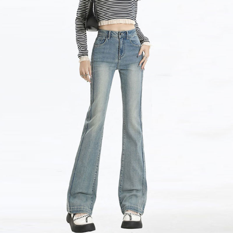 틈새 스티칭 디자인 마이크로 청바지 여성용 미국식 플라 팬츠 슬림 올매치 하이 웨이스트 스트레치 호스 슈 롱 바지