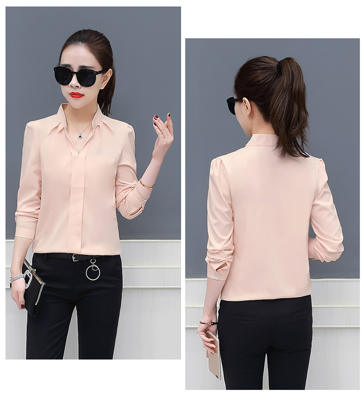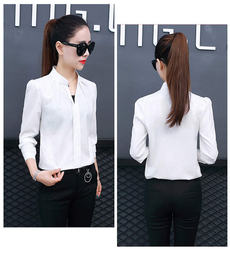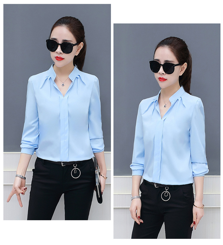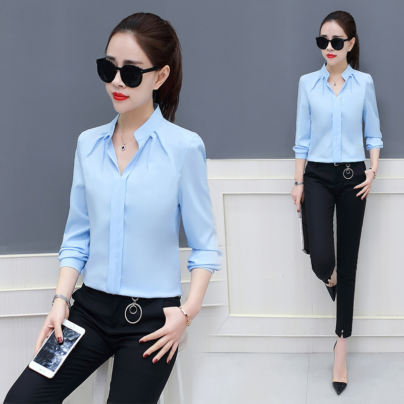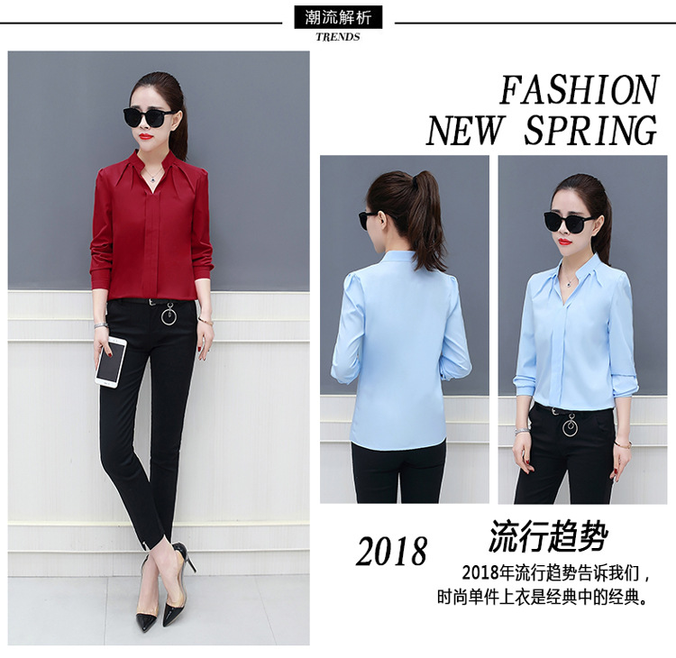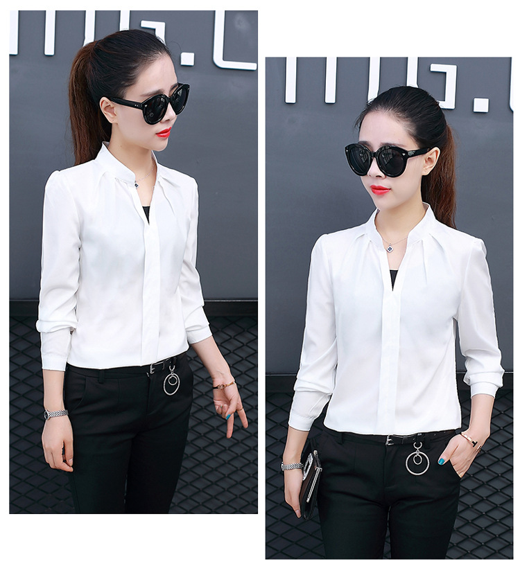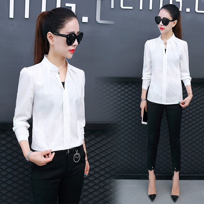 봄과 가을 새로운 단색 여성의 긴 소매 V-넥 화이트 셔츠 높은 수준의 지각 다목적 느슨한 캐주얼 폭발성 쉬폰 셔츠
