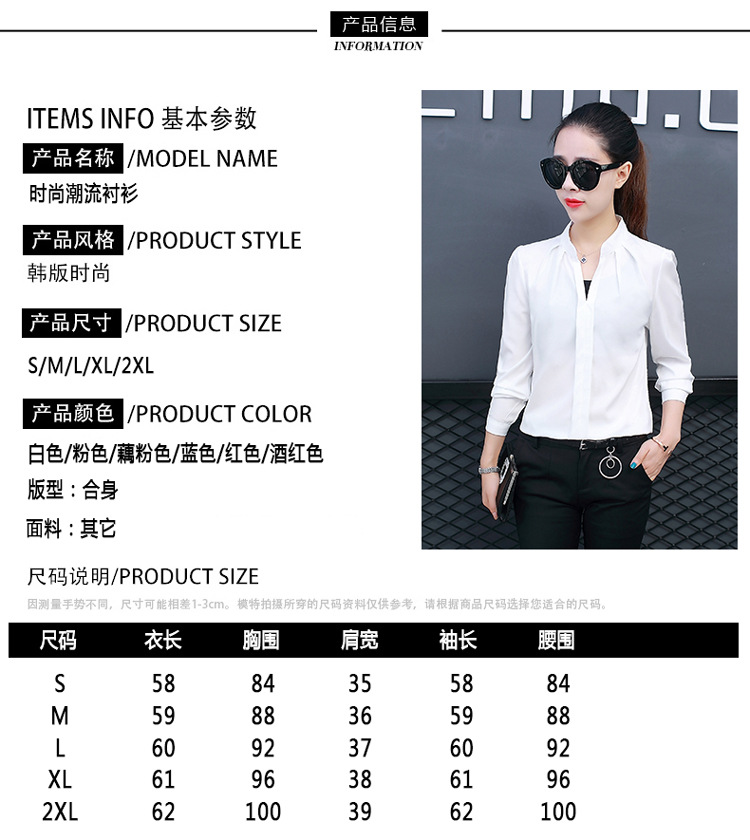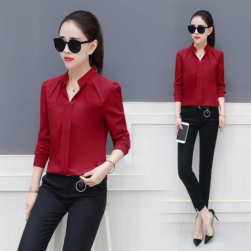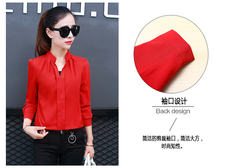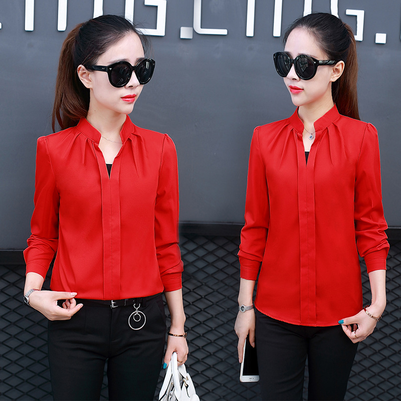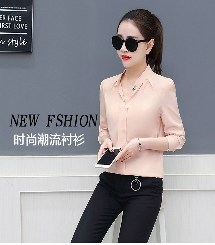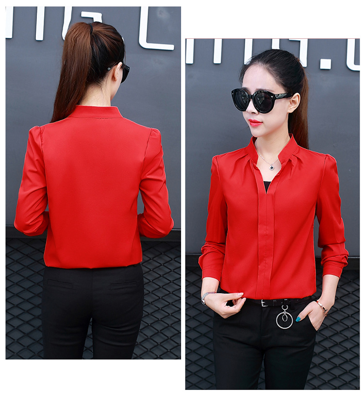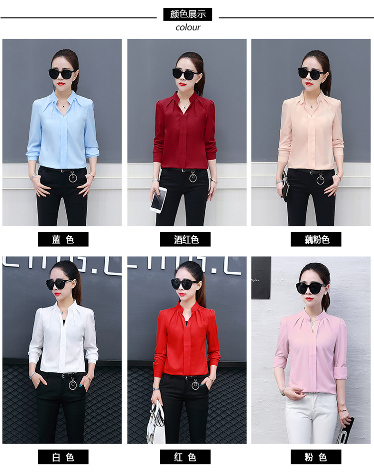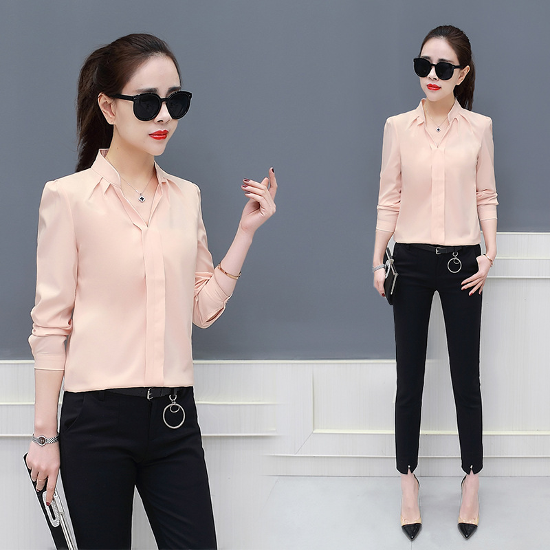 봄과 가을 새로운 단색 여성의 긴 소매 V-넥 화이트 셔츠 높은 수준의 지각 다목적 느슨한 캐주얼 폭발성 쉬폰 셔츠