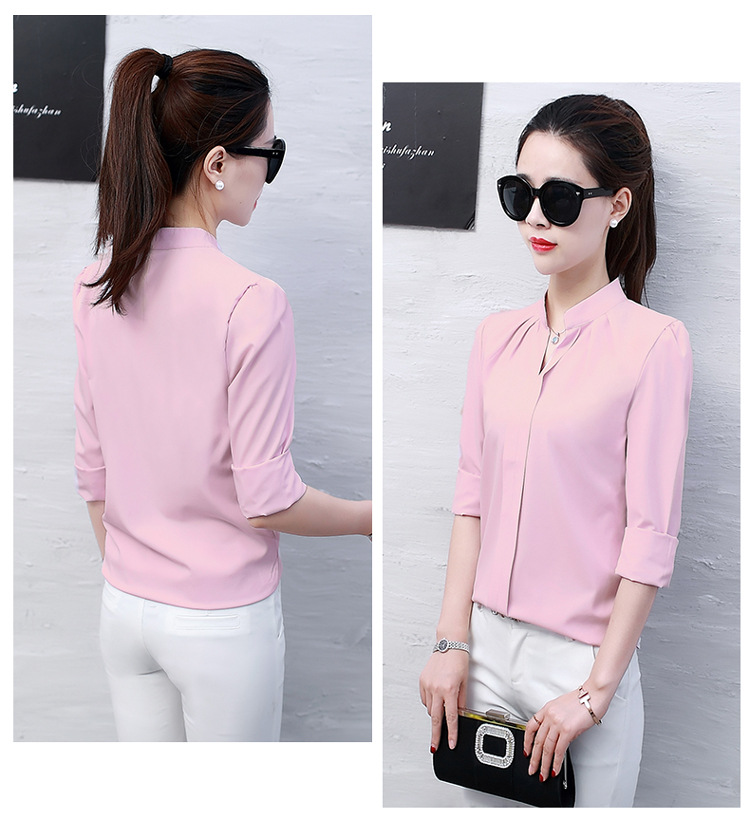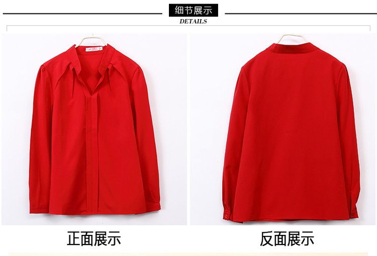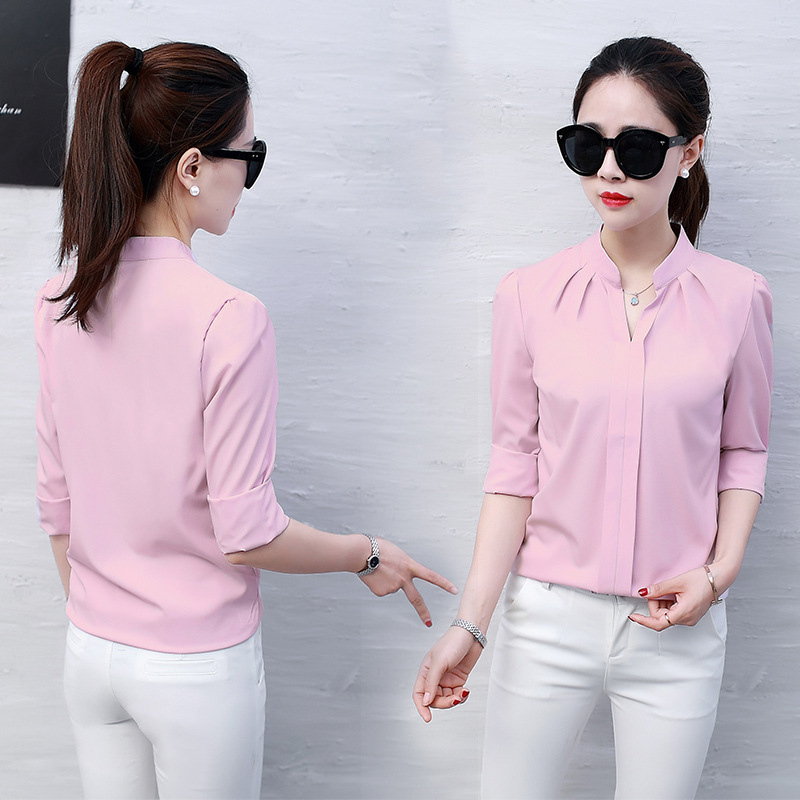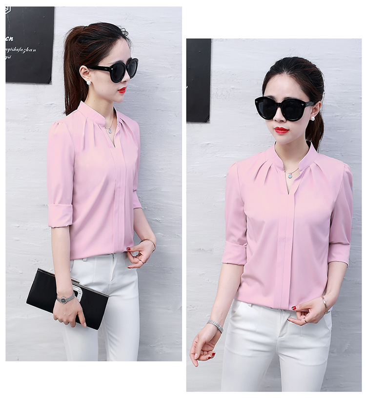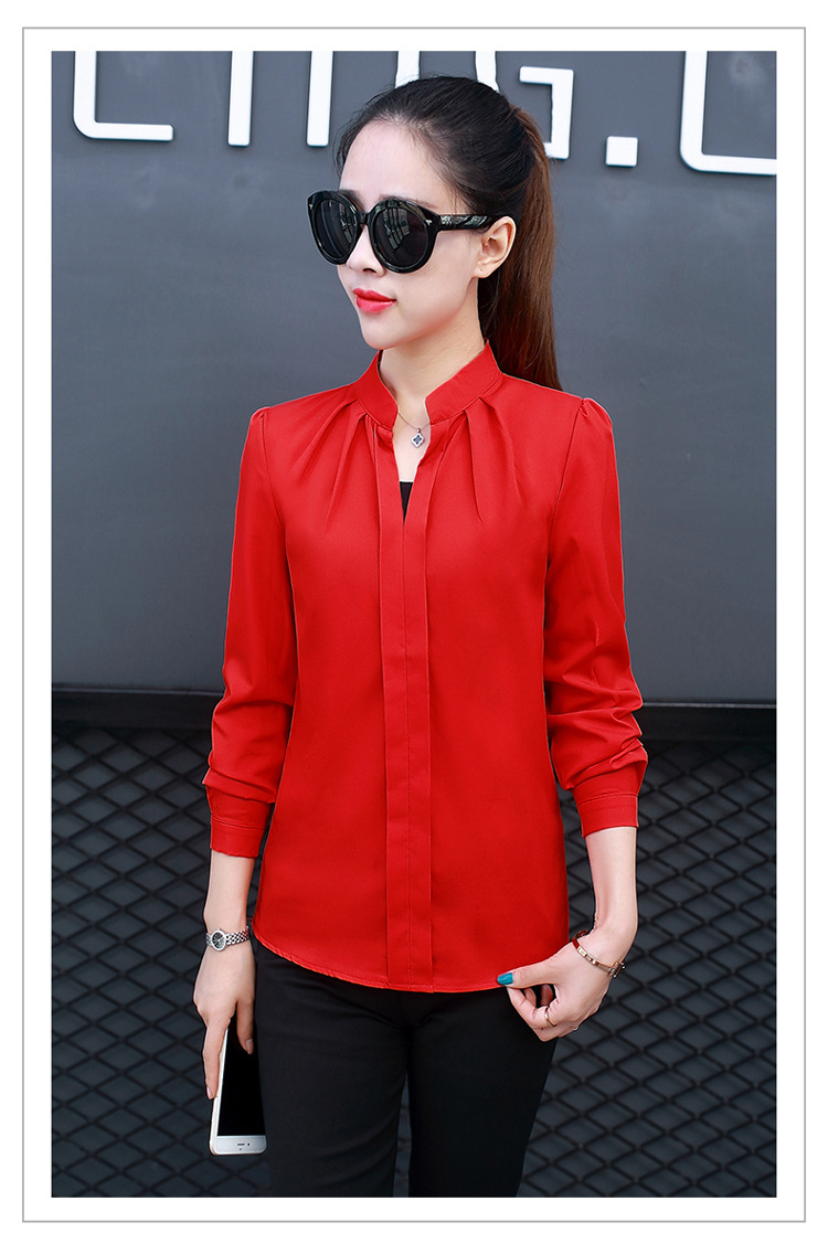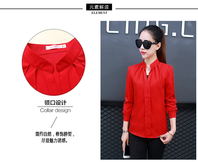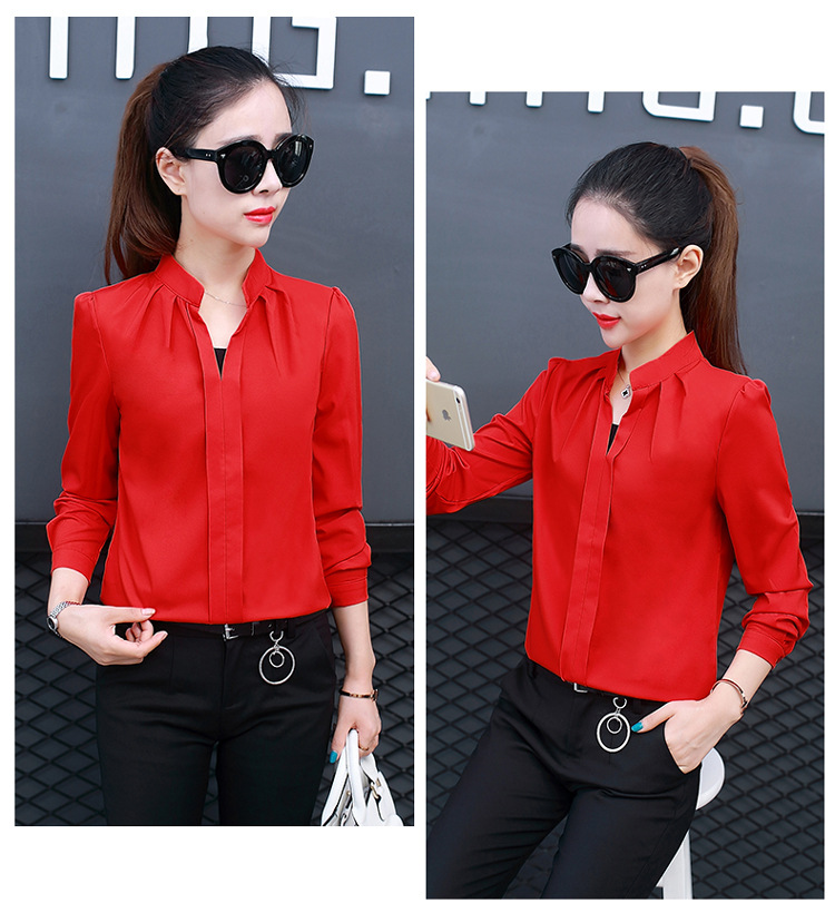 봄과 가을 새로운 단색 여성의 긴 소매 V-넥 화이트 셔츠 높은 수준의 지각 다목적 느슨한 캐주얼 폭발성 쉬폰 셔츠