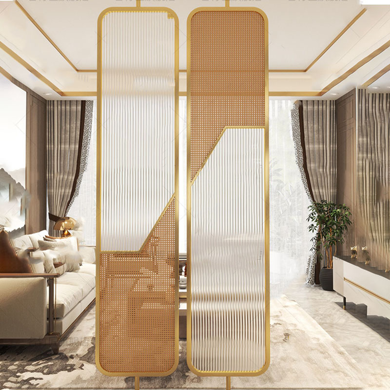가벼운 럭셔리 창홍 유리 파티션 거실 입구 덮개 현관 회전 가능한 금속 장식 스테인레스 스틸 등나무 스크린