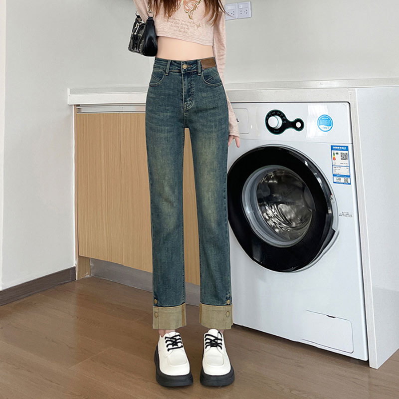스트레치 데님 자른 바지 여성용 배 모양의 빈티지 디자인 스티칭 틈새 가죽 라벨 하이 허리 스트레이트 슬림 핏 연기 튜브 바지스토어 가기