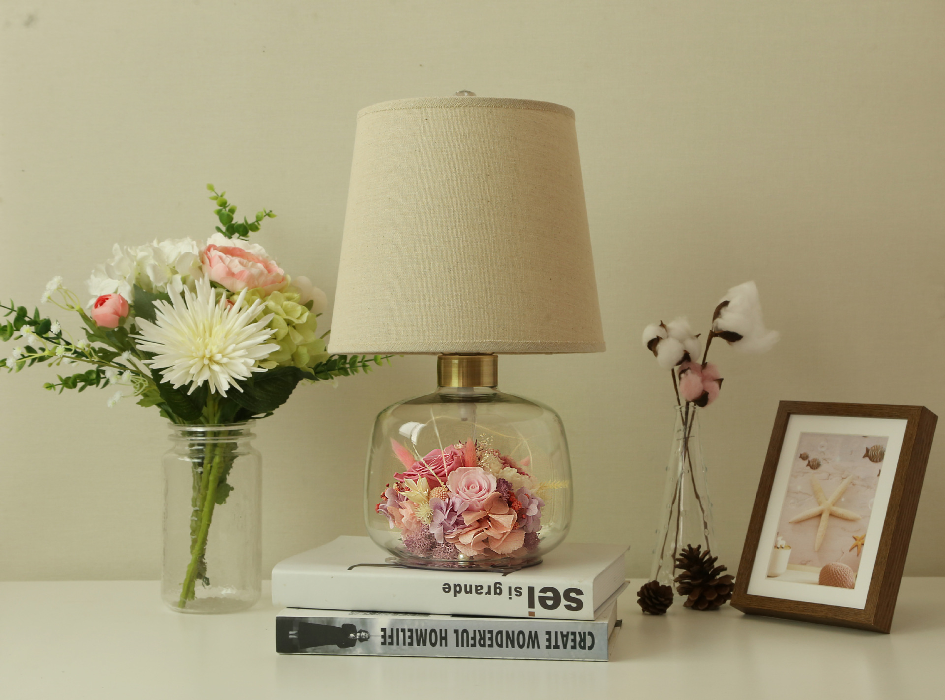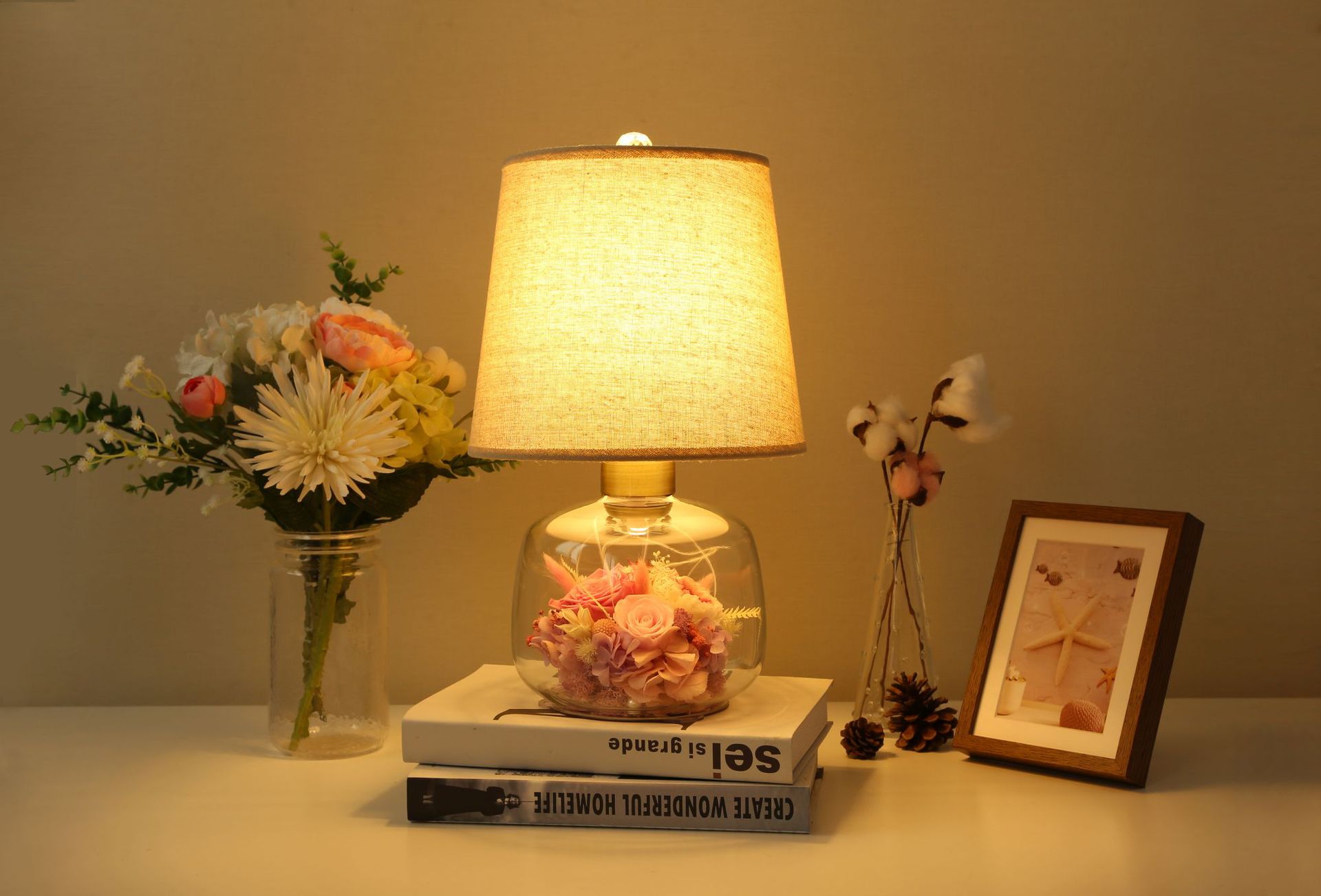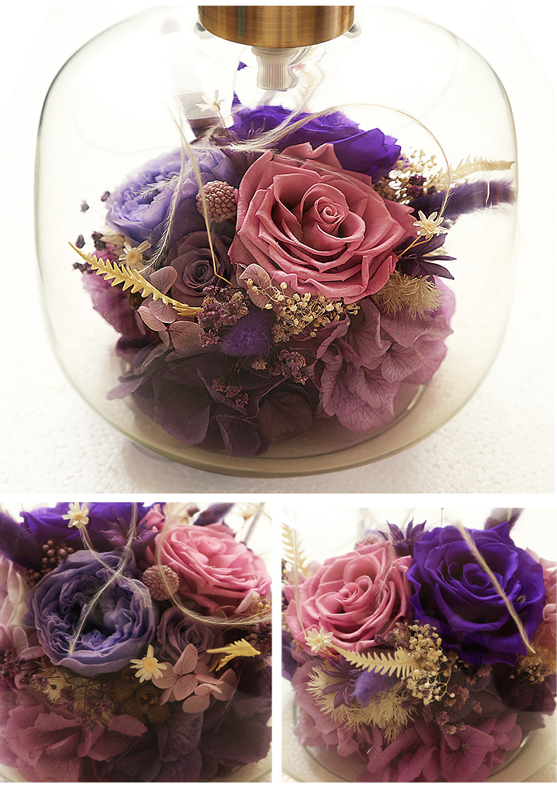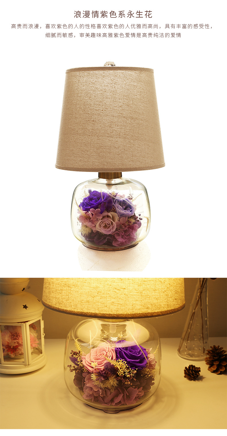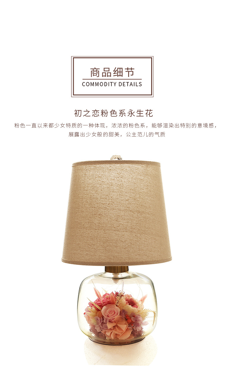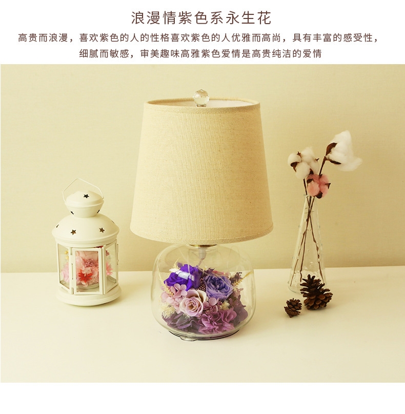 현대 간단한 성격 창조적 인 북유럽 테이블 램프 말린 꽃 유리 따뜻한 침실 침실 웨딩 장식 희미한 램프스토어 가기