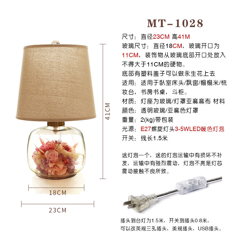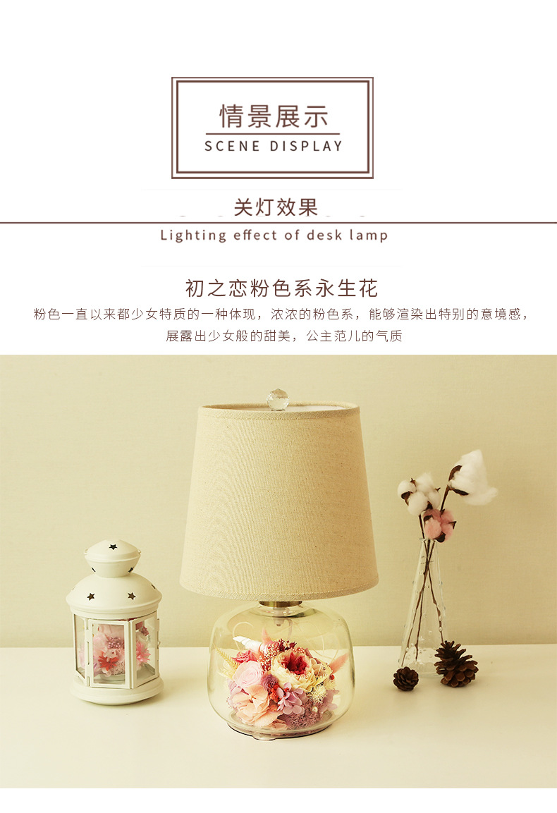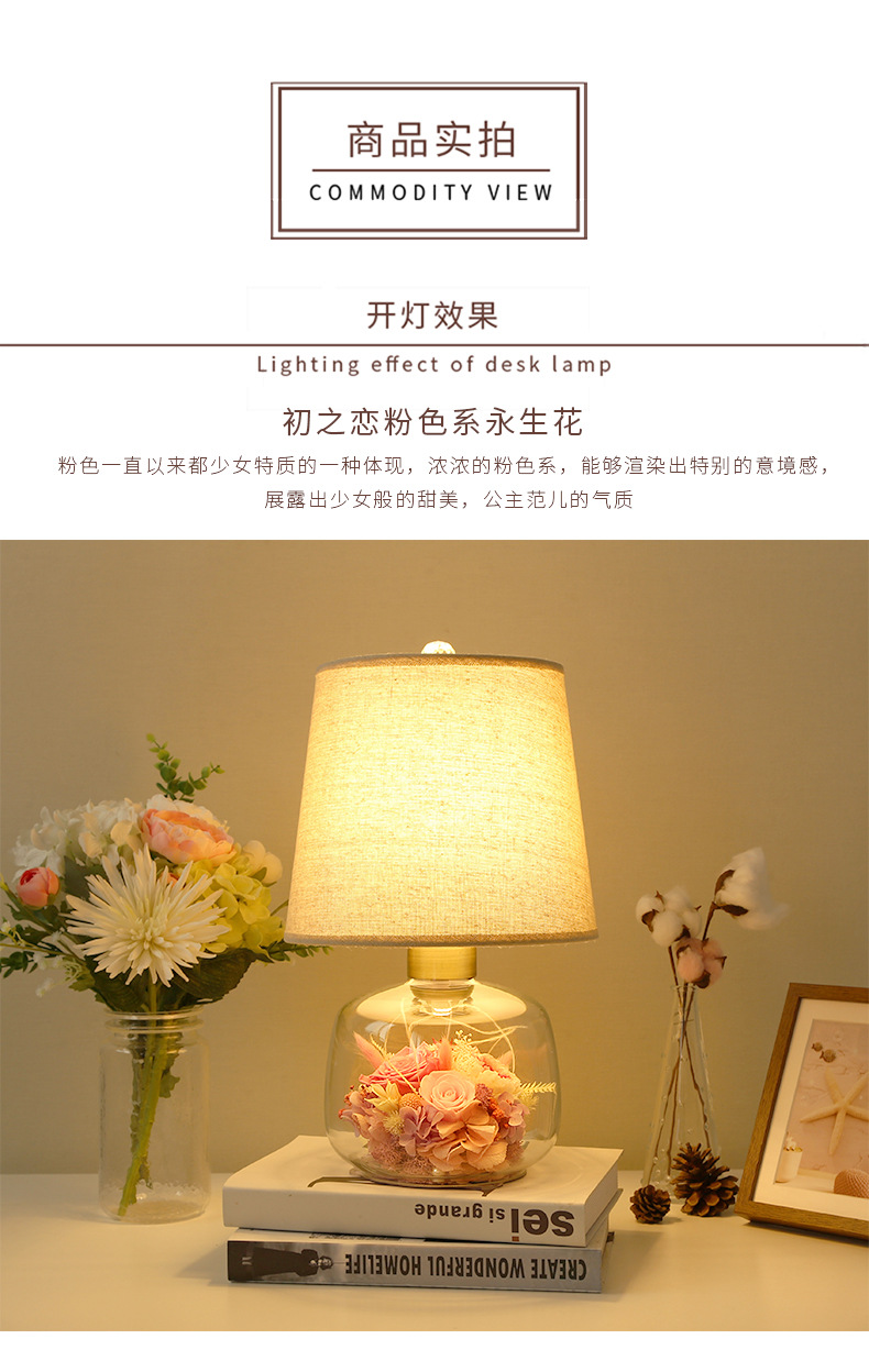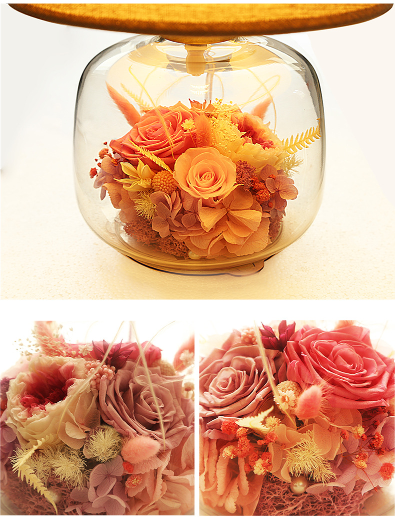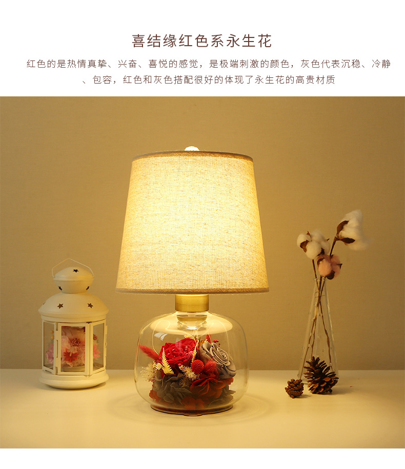 현대 간단한 성격 창조적 인 북유럽 테이블 램프 말린 꽃 유리 따뜻한 침실 침실 웨딩 장식 희미한 램프