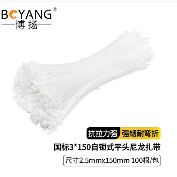 博扬(BOYANG)国标3*150自锁式平头尼龙扎带 皮线网线电线塑料扎线带 带宽2.5mm(100根/包)白色 BY-ZD-202*1 合格证*1