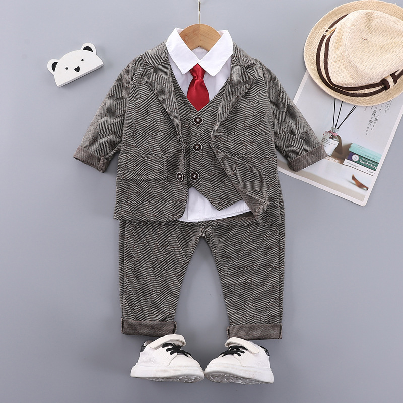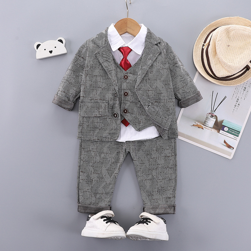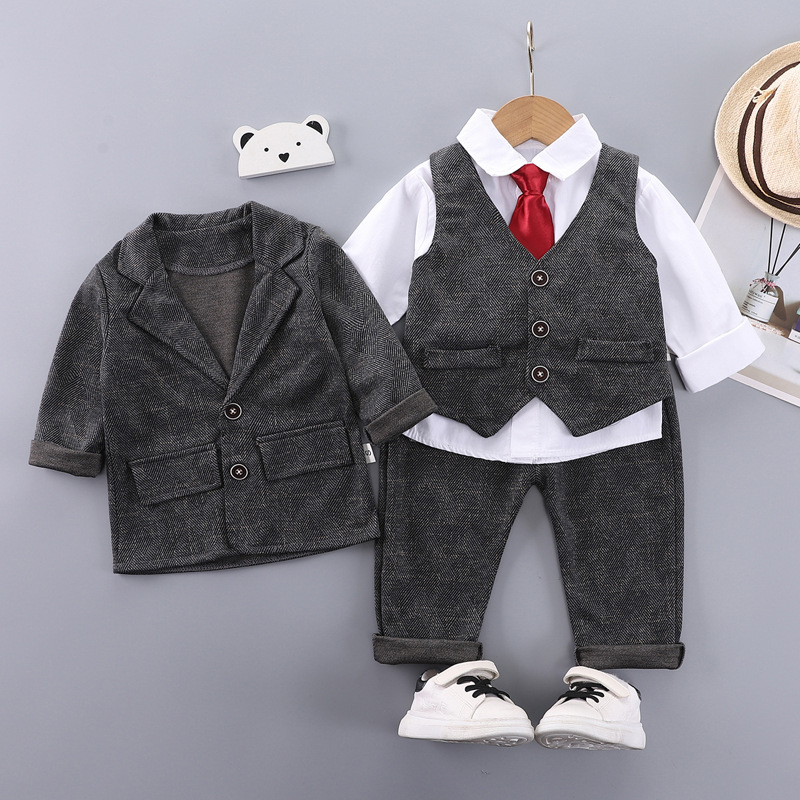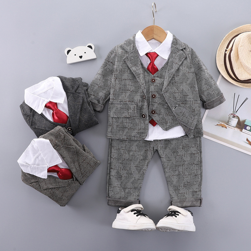 소년 긴 소매 4 조각 세트 한국 스타일 봄 패션 아기 튀긴 거리 봄 착용 줄무늬 넥타이 세트 긴 소매 세트 트렌디