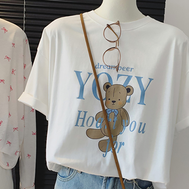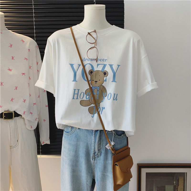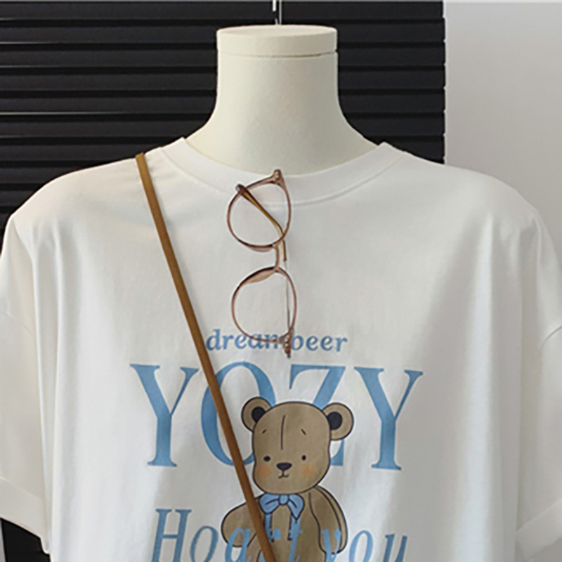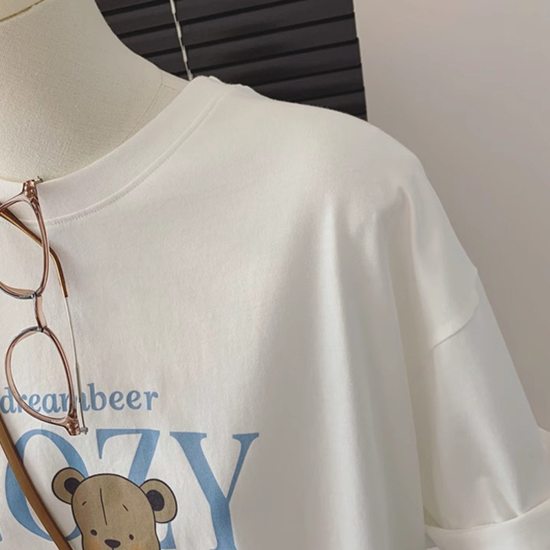 한국 통통녀 mm 동대문 새 면화 베어 프린트 루오스 세련된 홍콩 맛 플러스 사이즈 반소매 티셔츠 여성용 여름스토어 가기