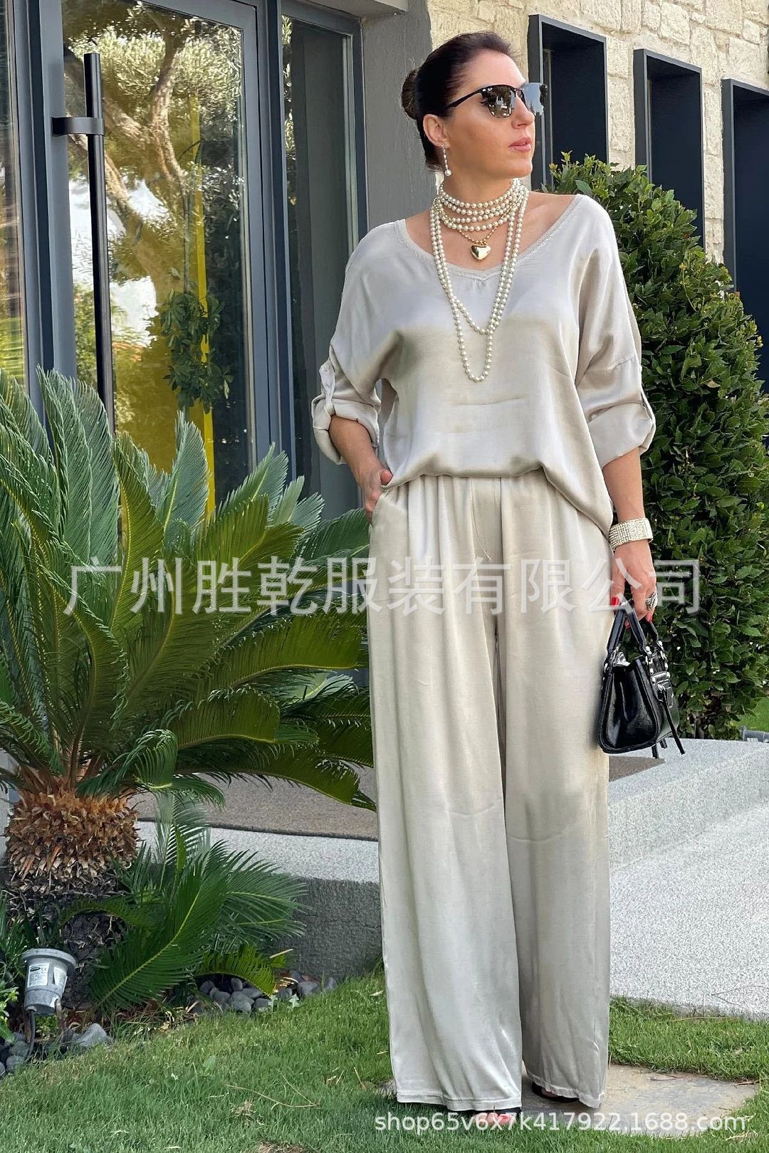 2024 유럽과 미국 국경 아마존 대외 무역 여성의 단색 둥근 목 느슨한 패션 스포츠 레저 세트 두 조각스토어 가기