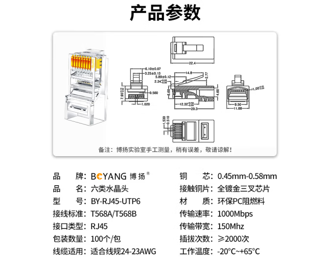 博扬 六类水晶头 CAT6类非屏蔽千兆网线水晶头8P8C 工程级网络RJ45连接头 全镀金 100个/盒 BY-RJ45-UTP6*1*合格证