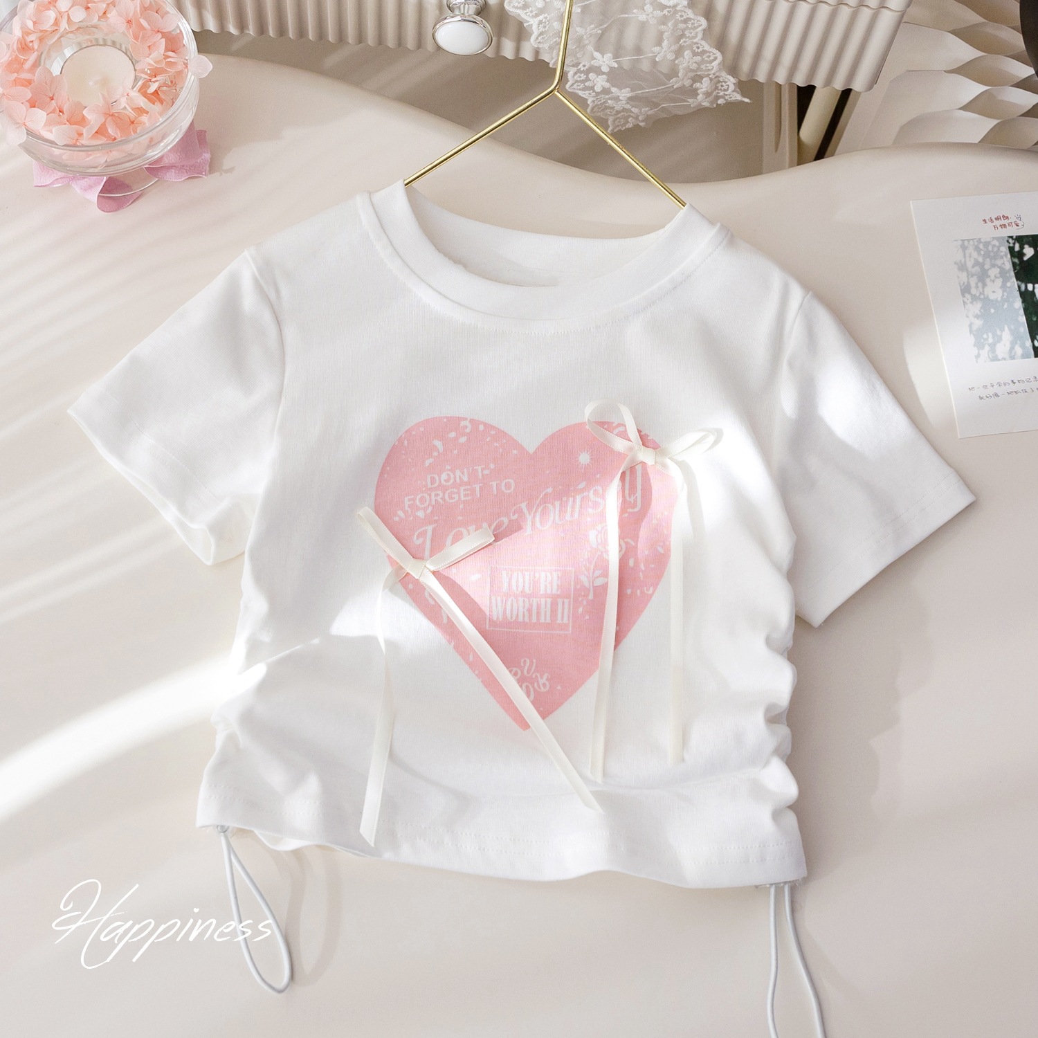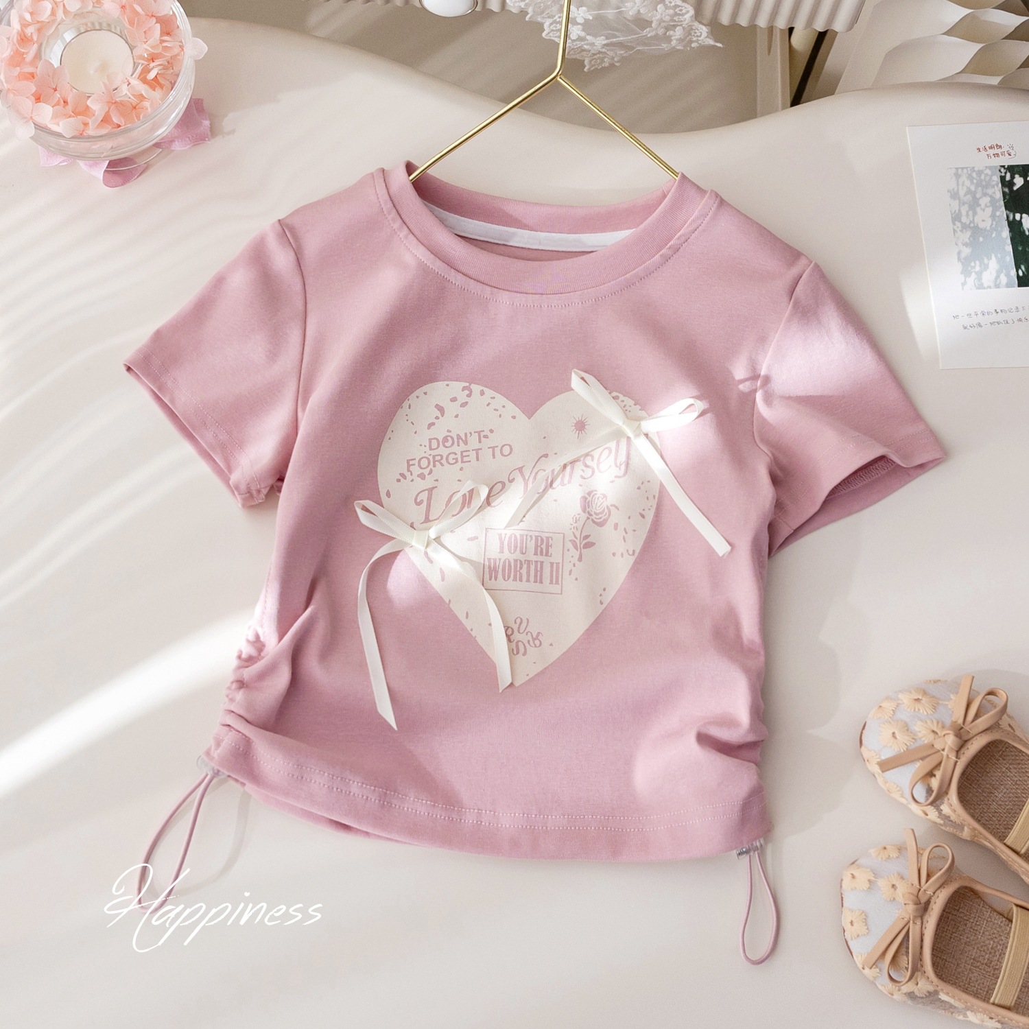여자 반소매 티셔츠 여름 새 한국식 사랑 인쇄 반소매 아기 소녀 달콤한 활 옷스토어 가기