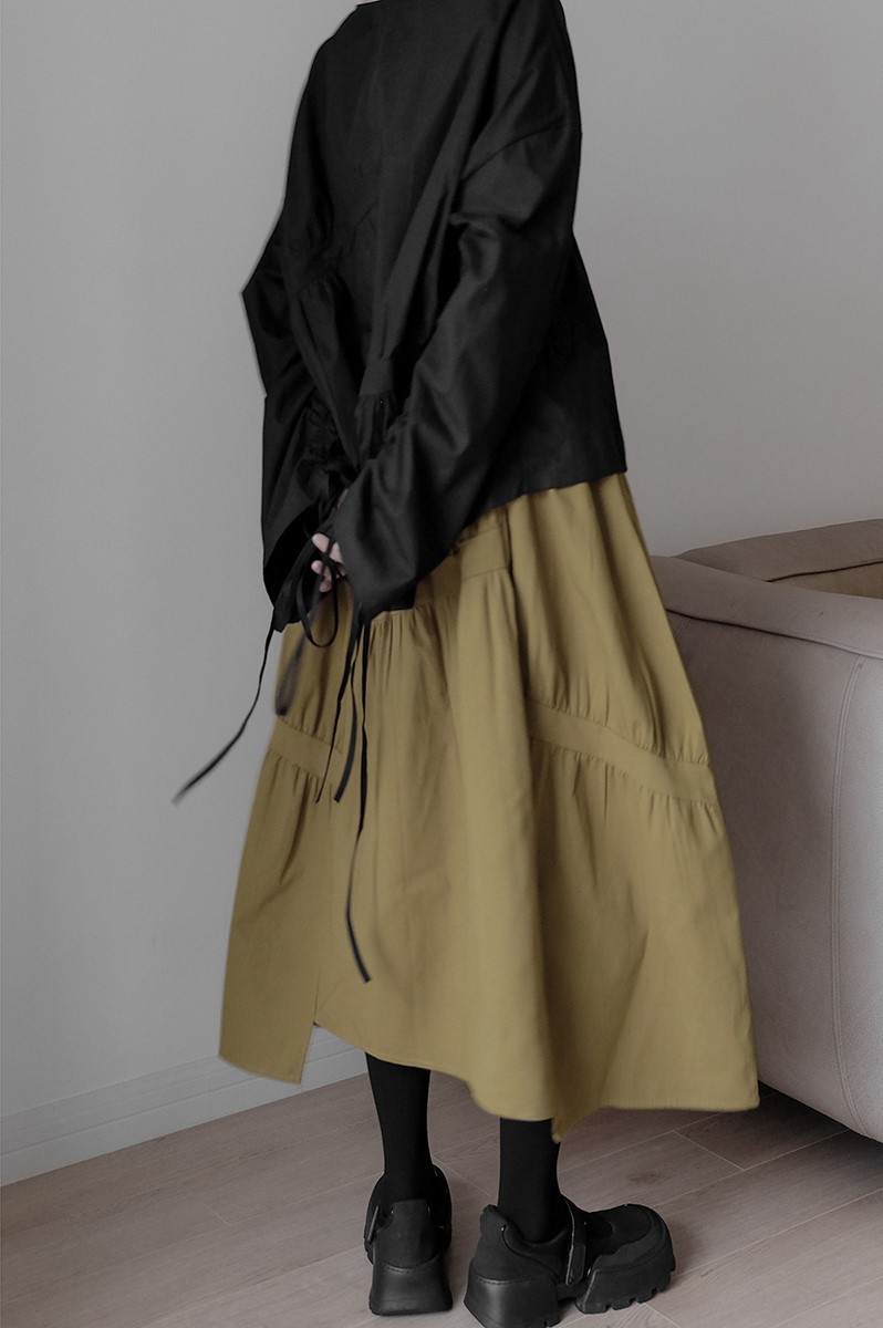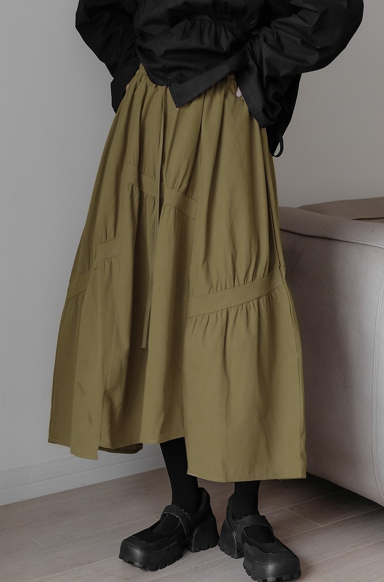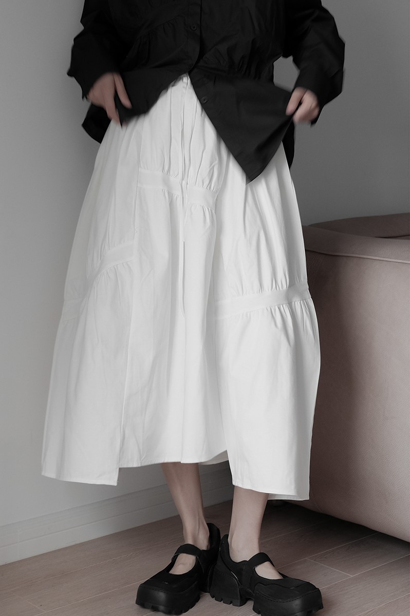 루렌 프로덕션/야마모토 비대칭 플리츠 하이웨이스트 슬림핏 A라인 스커트 입체 플리츠 디자인