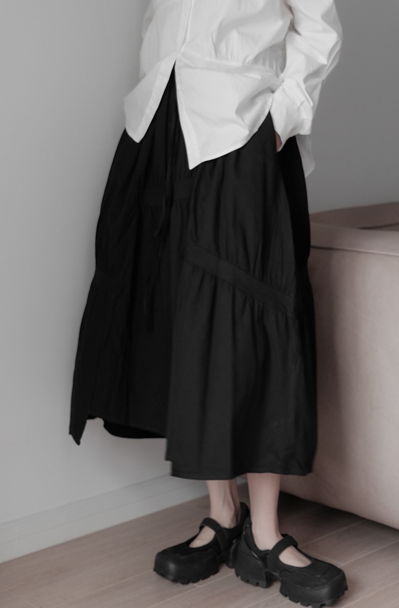루렌 프로덕션/야마모토 비대칭 플리츠 하이웨이스트 슬림핏 A라인 스커트 입체 플리츠 디자인스토어 가기