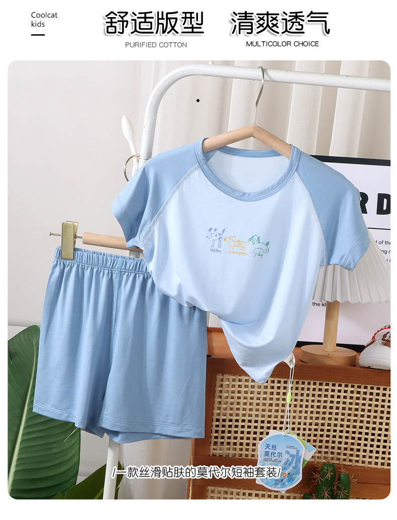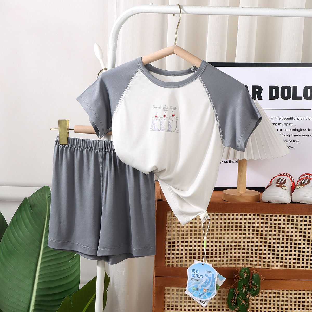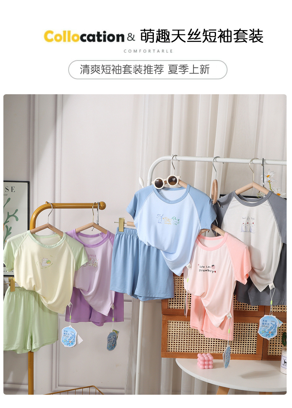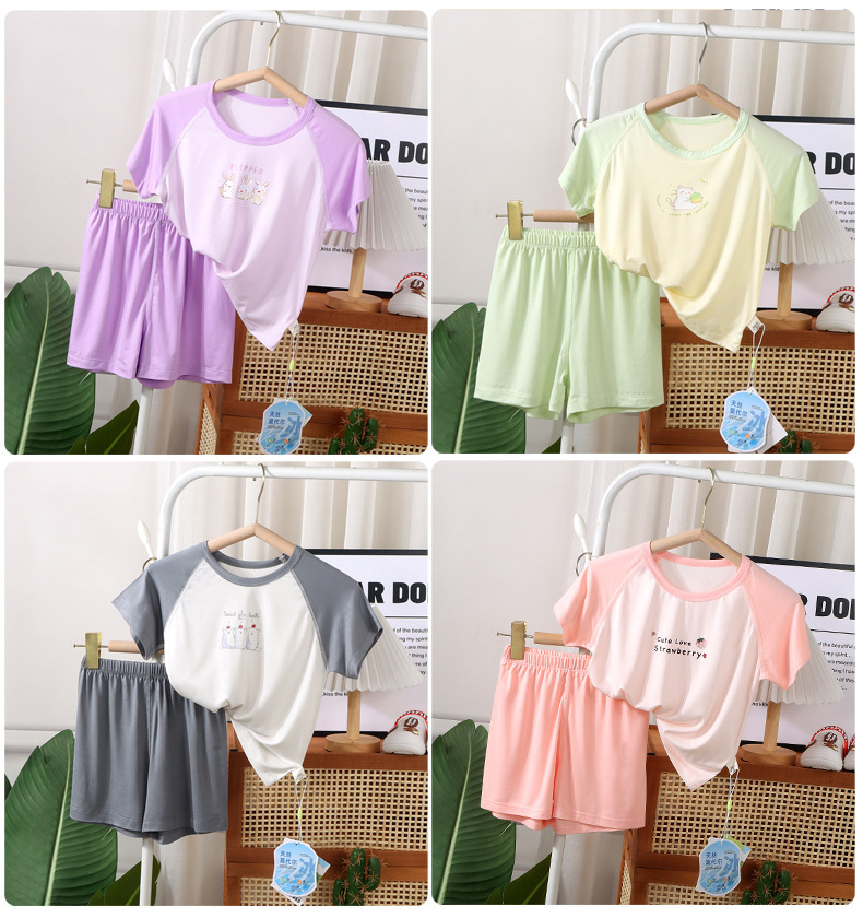 어린이 가정 의류 세트 2024 새 클래스 A 뼈없는 모달 반팔 소녀 에어컨 의류 세트스토어 가기