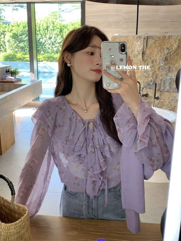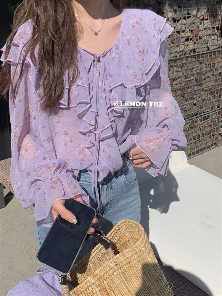 꽃 쉬폰 셔츠 여성용 여름 새로운 달콤한 우아한 세련된 아름다운 느슨한 슬리밍 긴팔 셔츠 탑