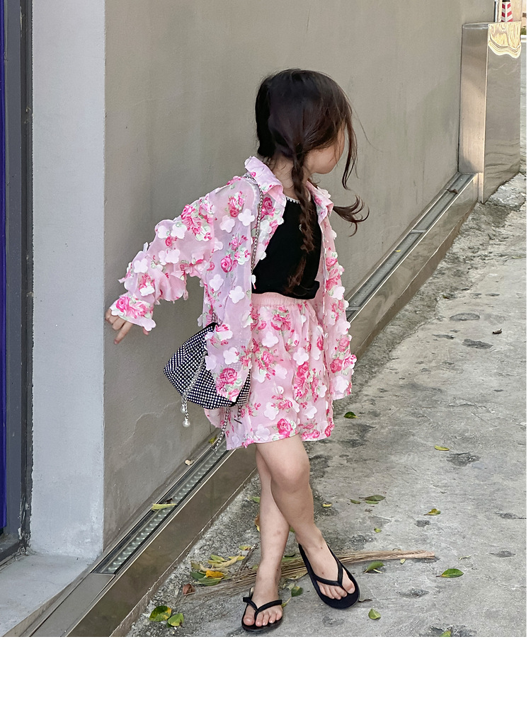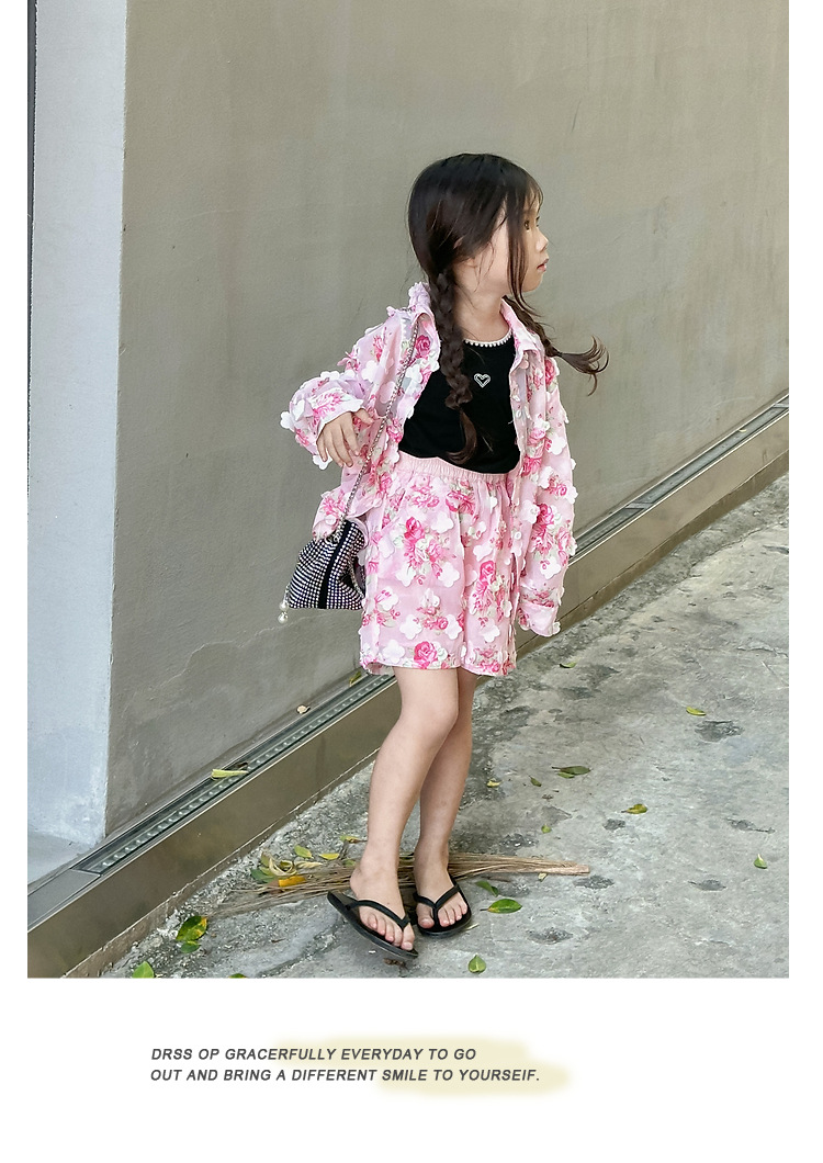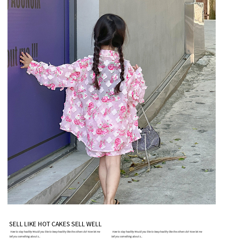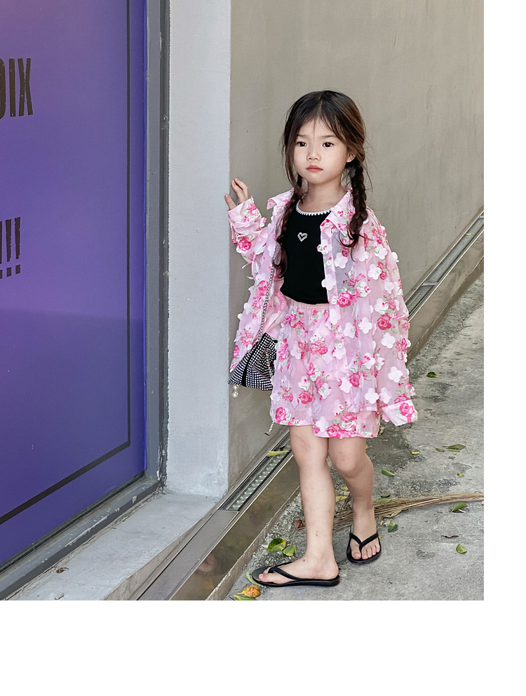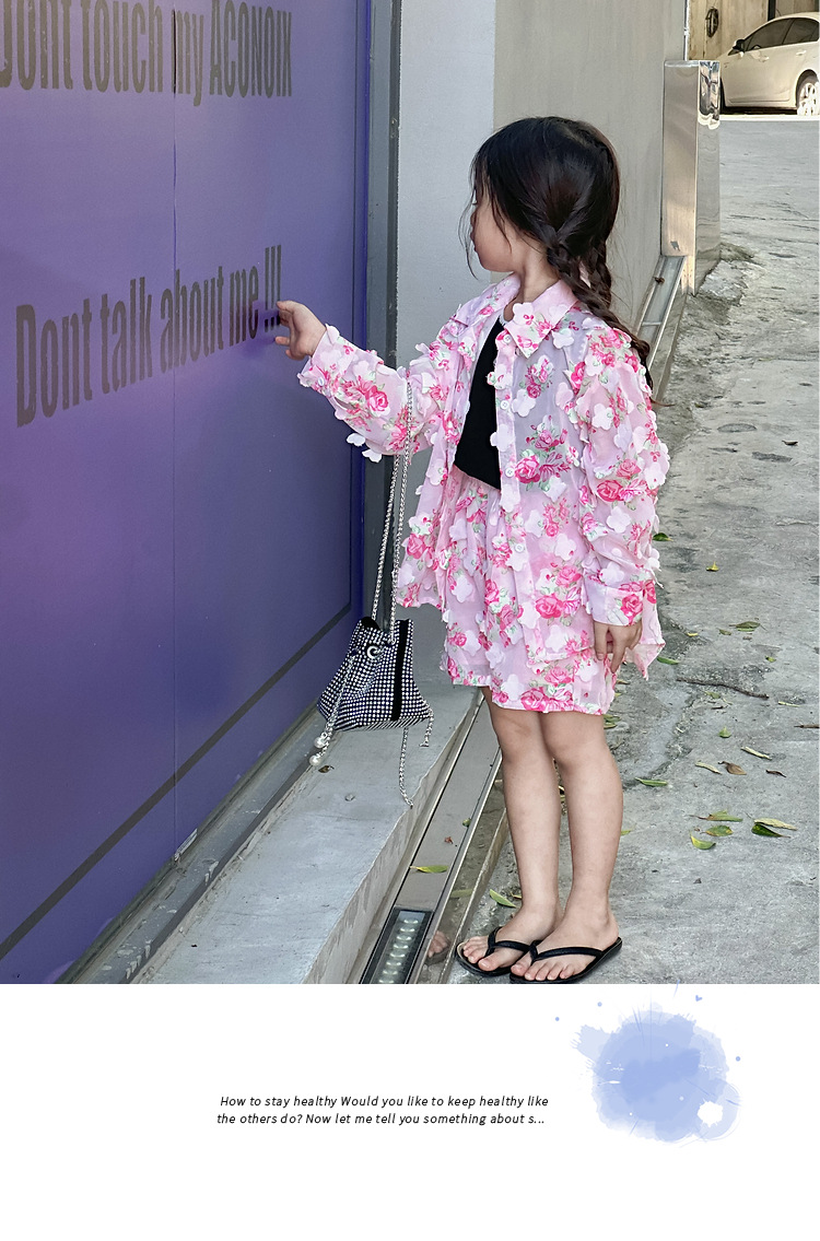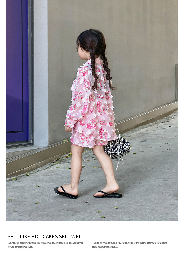 소녀 한국식 꽃 선 스크린 의류 세트 2024 여름 새 아기 긴 소매 셔츠 반바지 투피스 세트스토어 가기