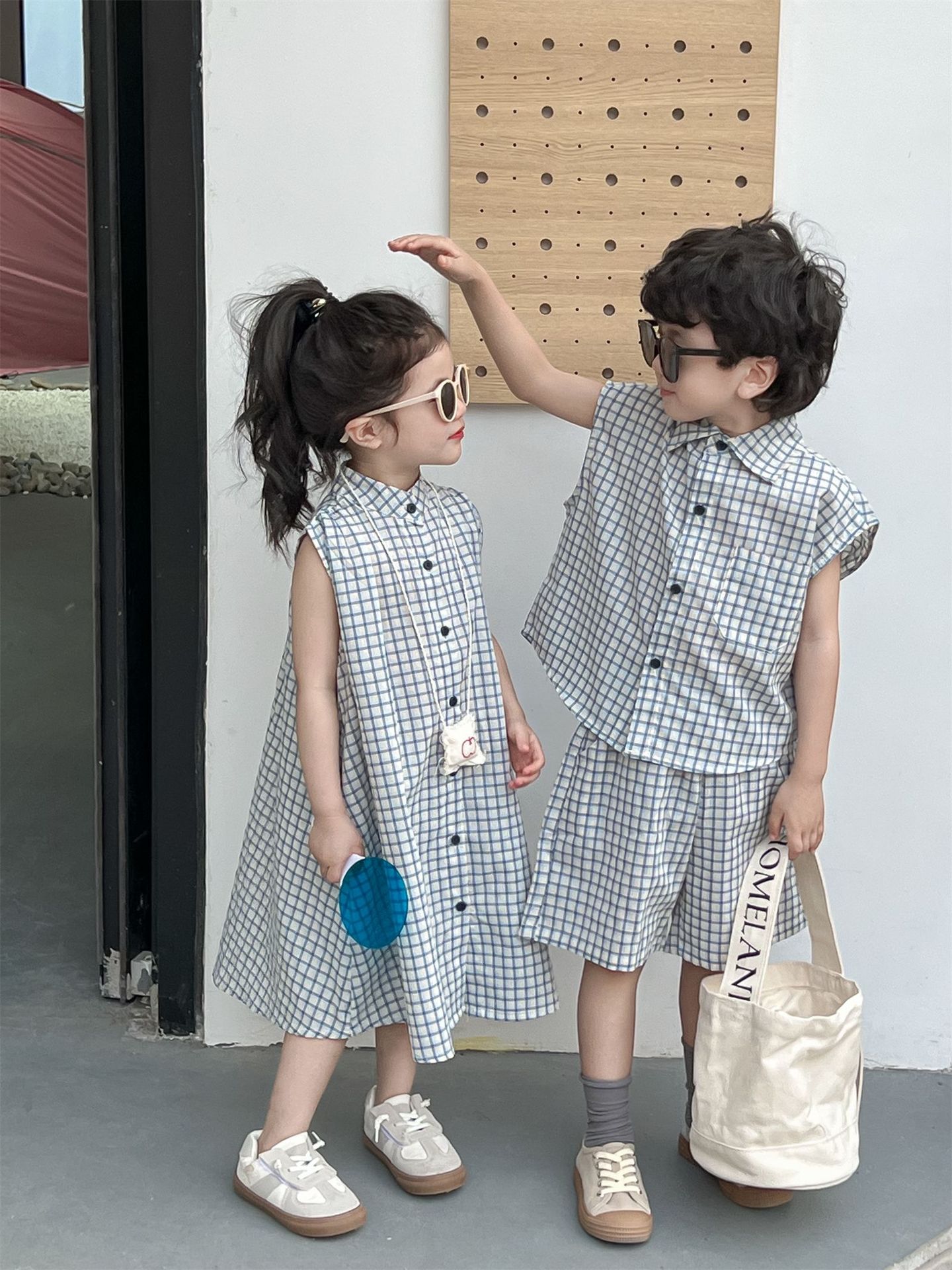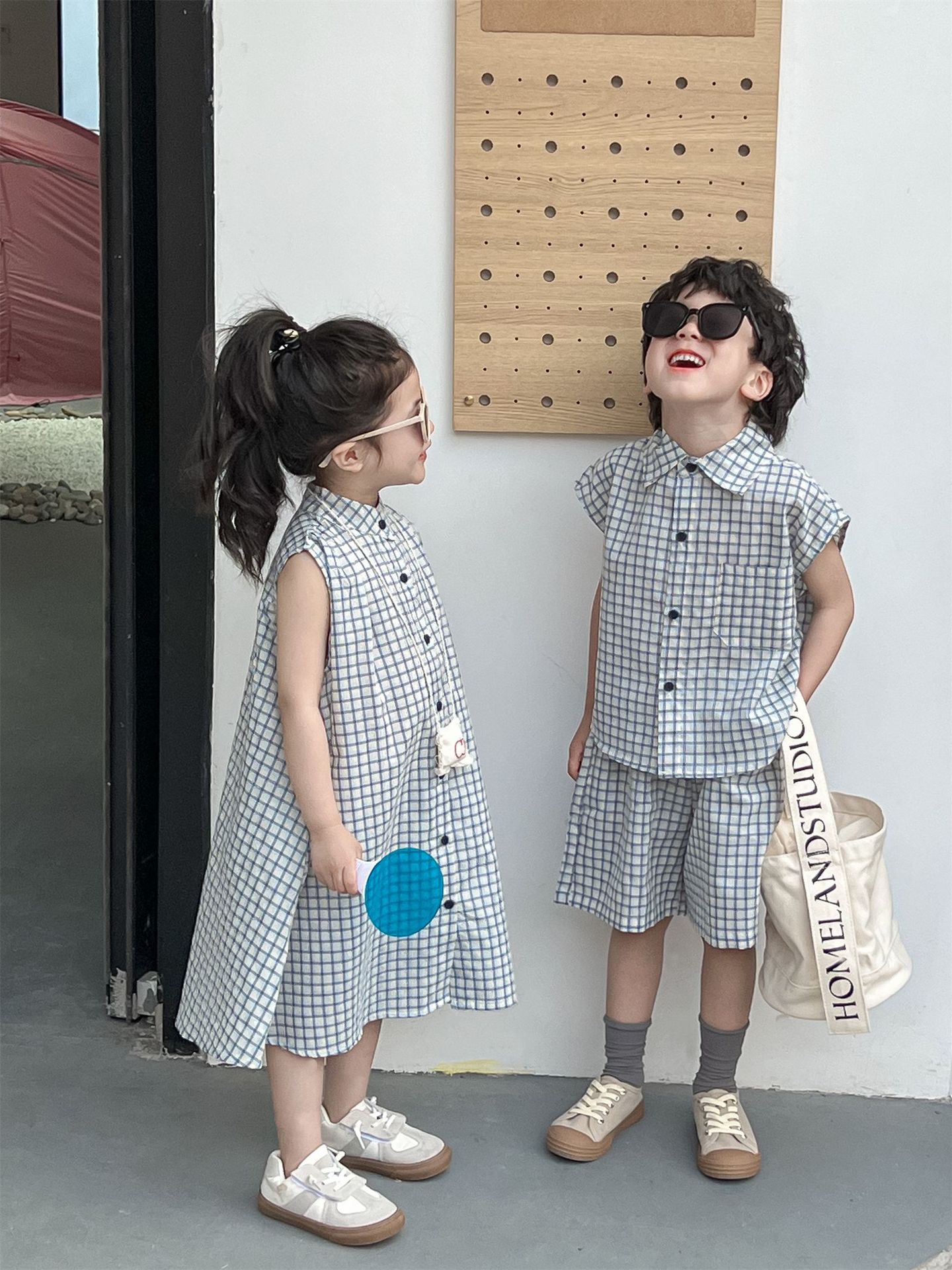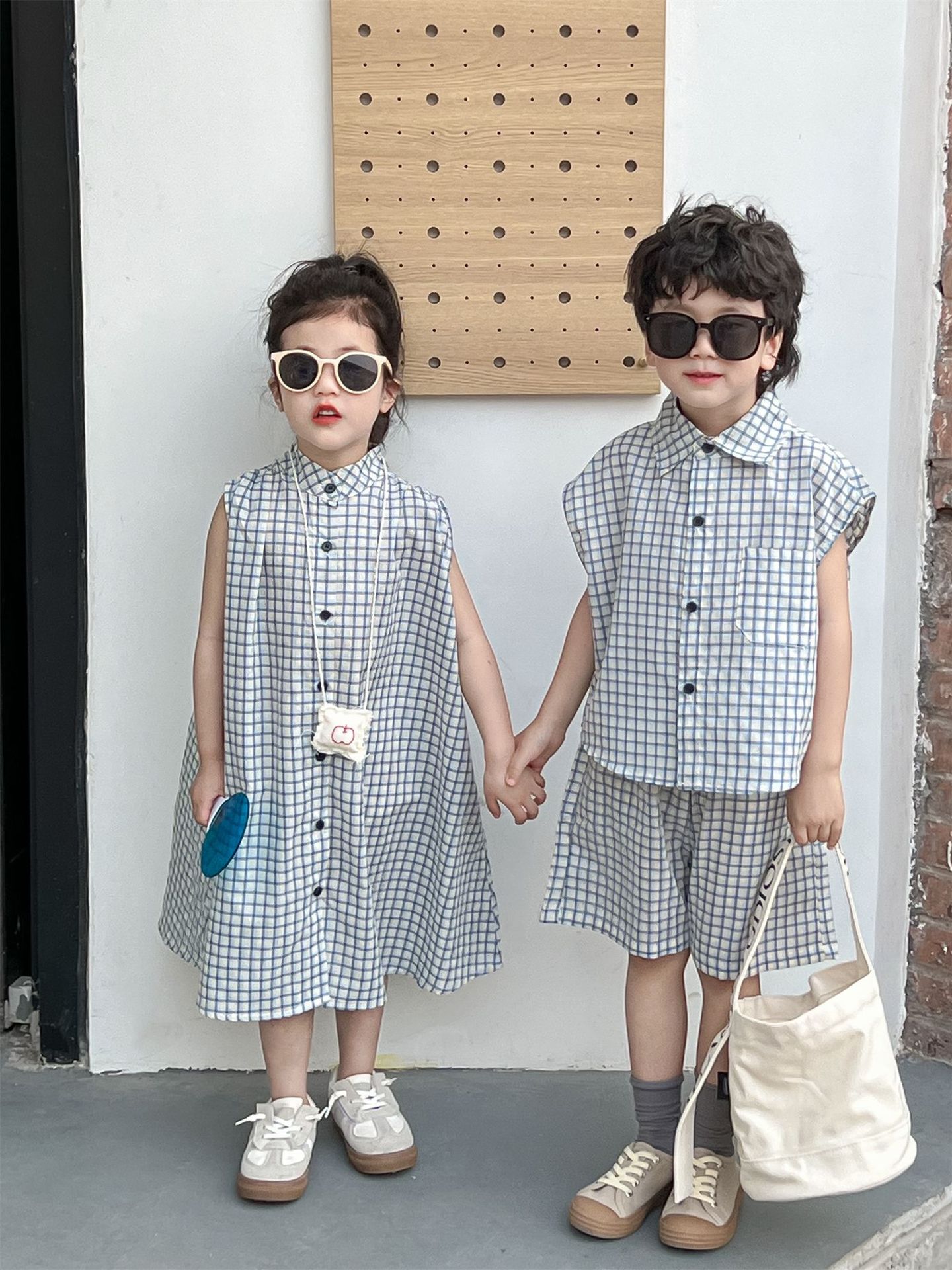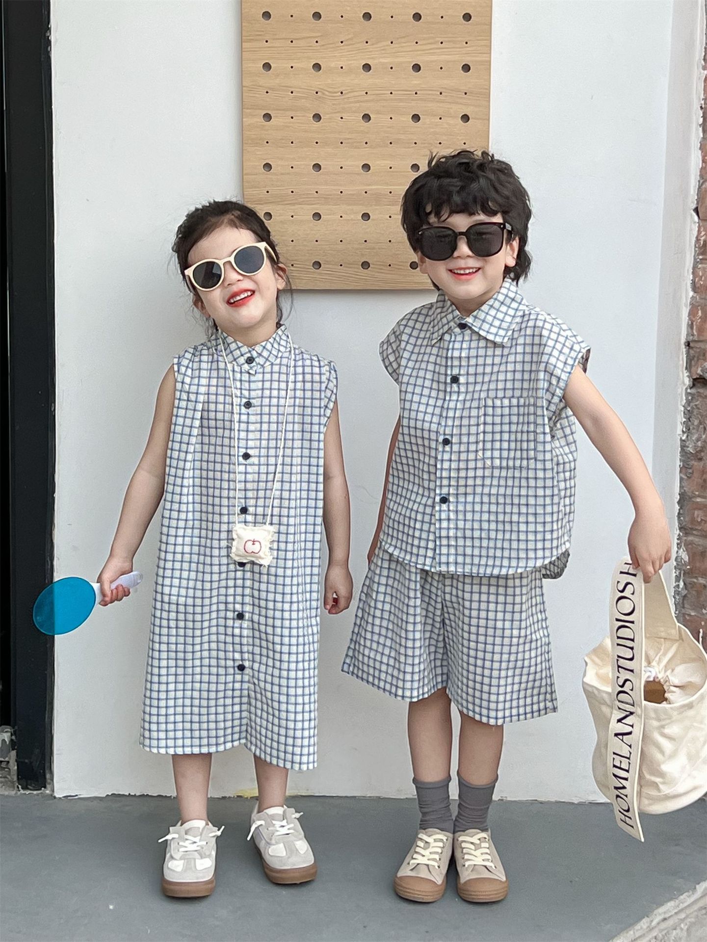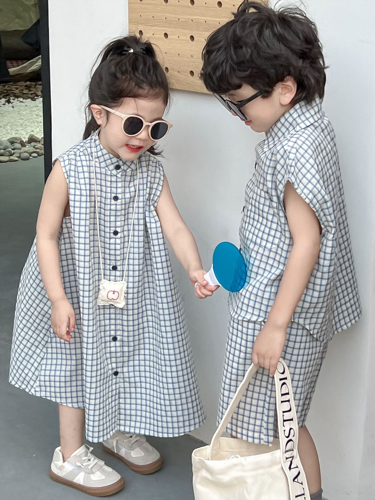 남매 의류 ~ 남학생 여름 문학 스타일 블루 지 민소매 원피스 소년 반팔 짧은 바지 커버 언니와 형제의 옷스토어 가기