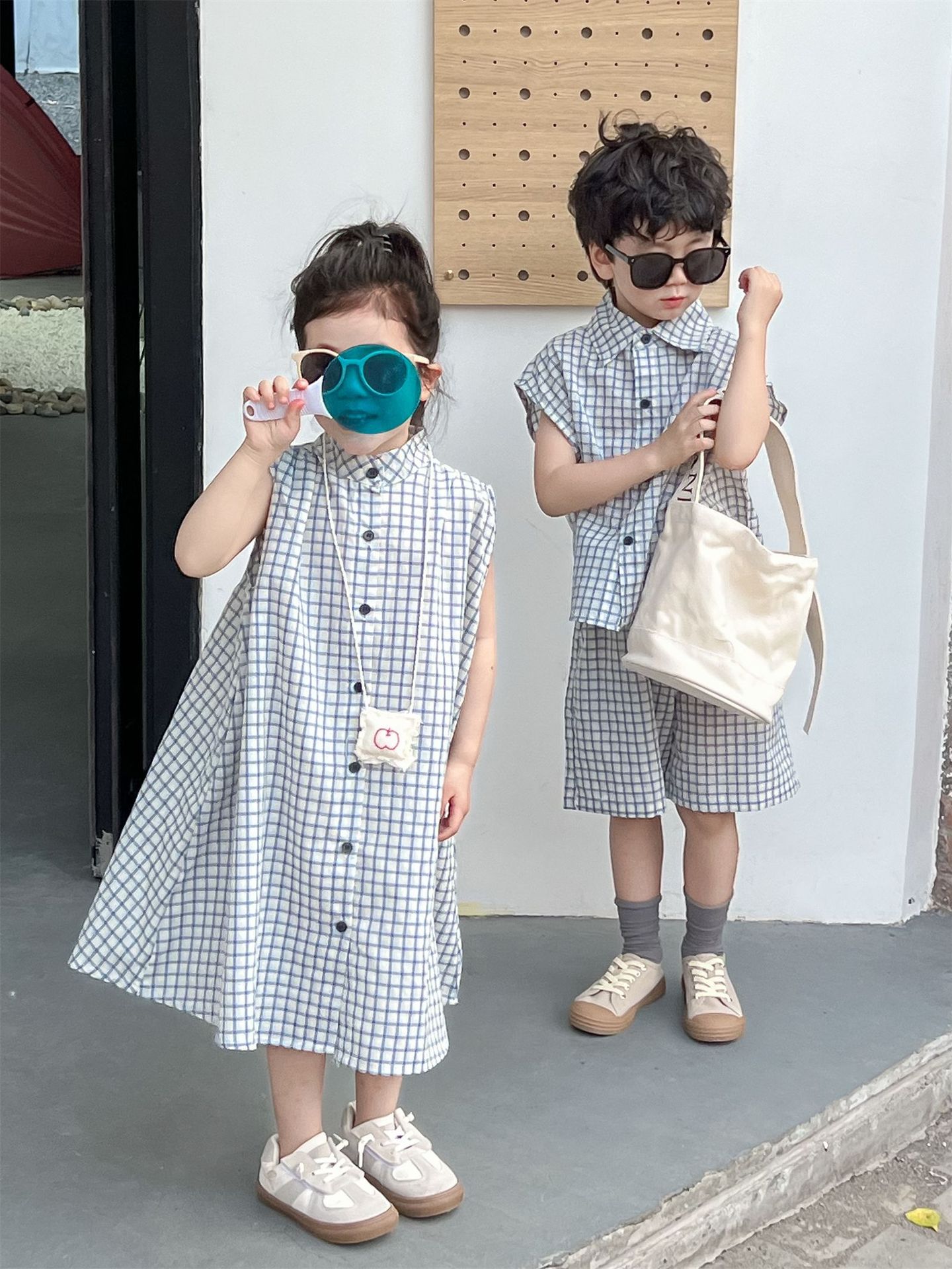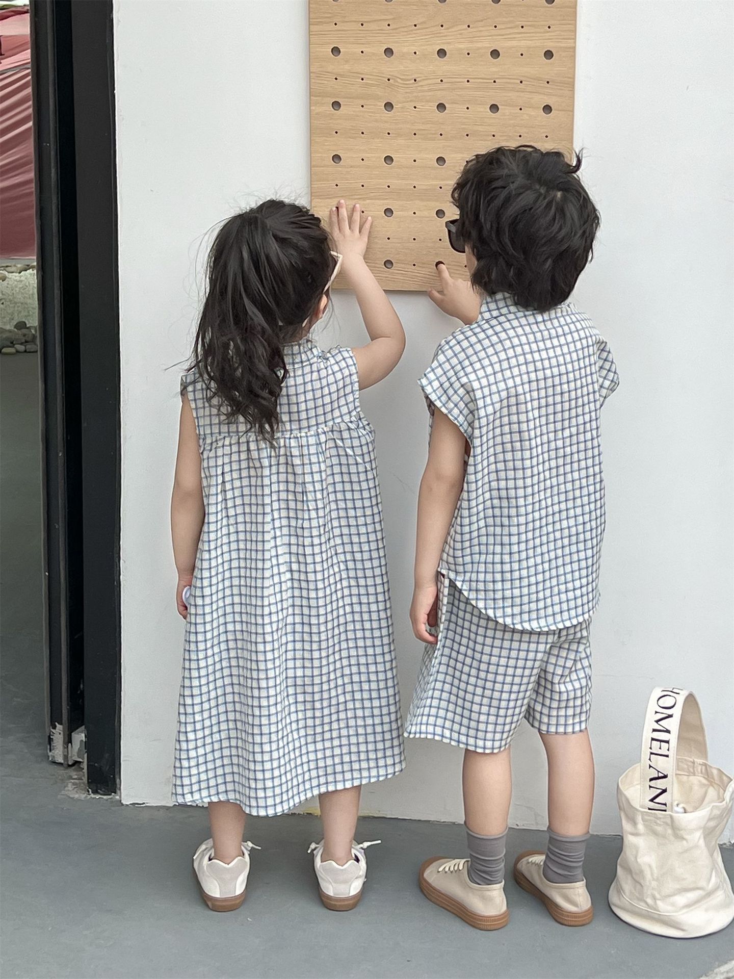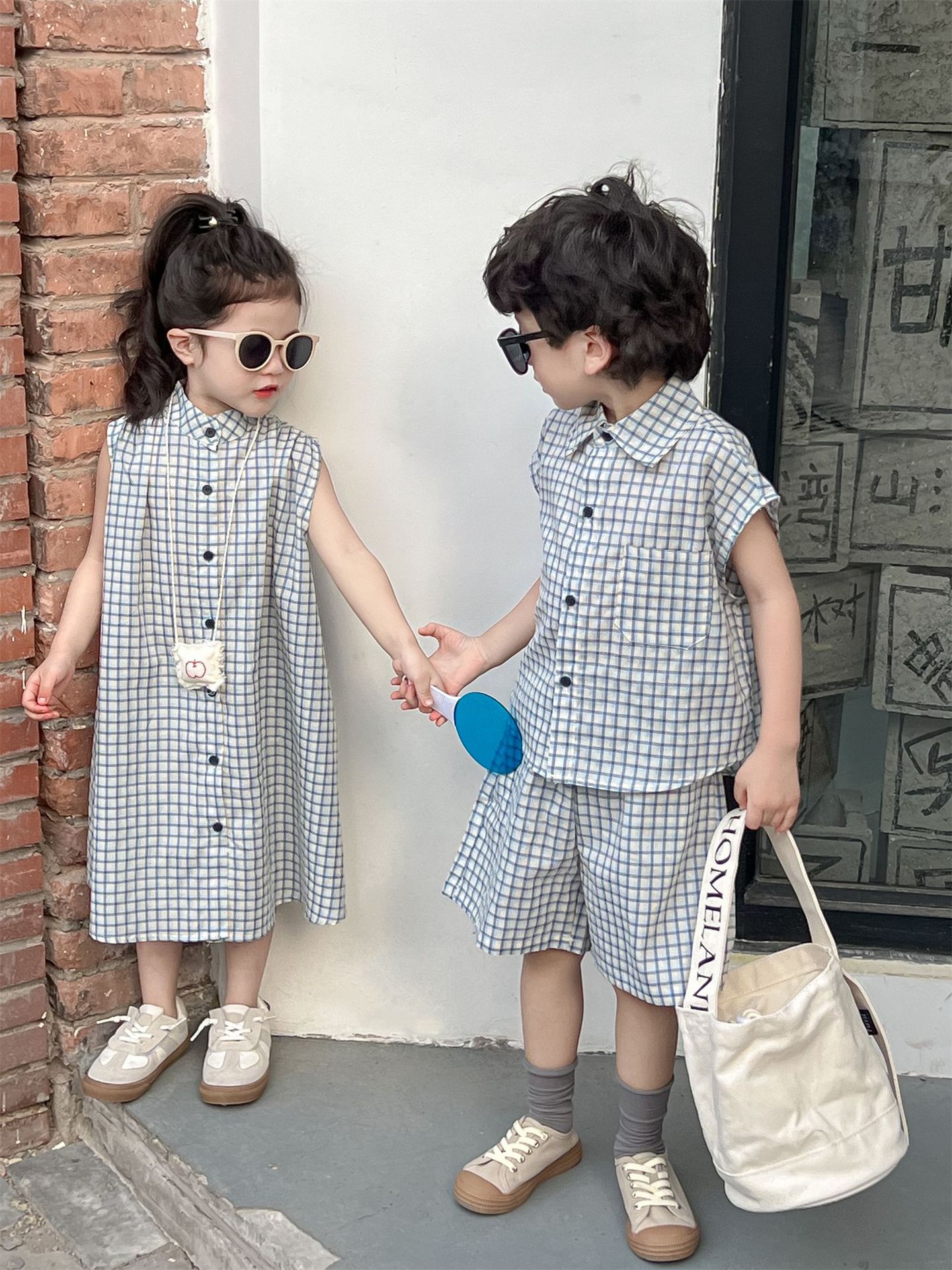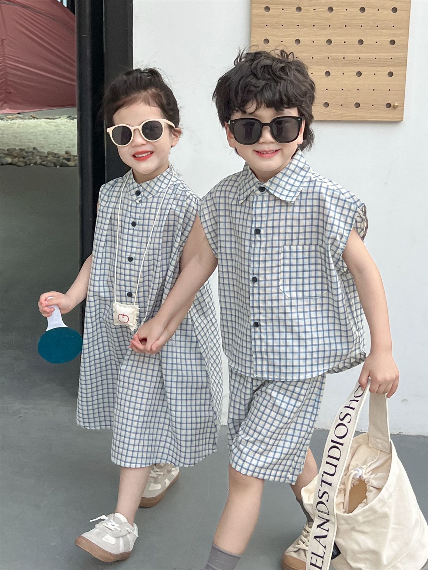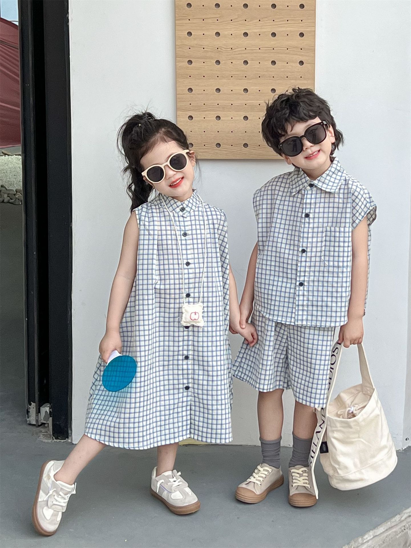 남매 의류 ~ 남학생 여름 문학 스타일 블루 지 민소매 원피스 소년 반팔 짧은 바지 커버 언니와 형제의 옷스토어 가기
