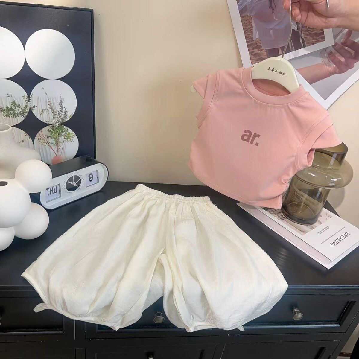소녀 여름 세트 2025 새로운 도착 소녀 서양식 티셔츠 어린이 모기 방지 바지 발목 길이 바지 캐주얼 투피스 세트